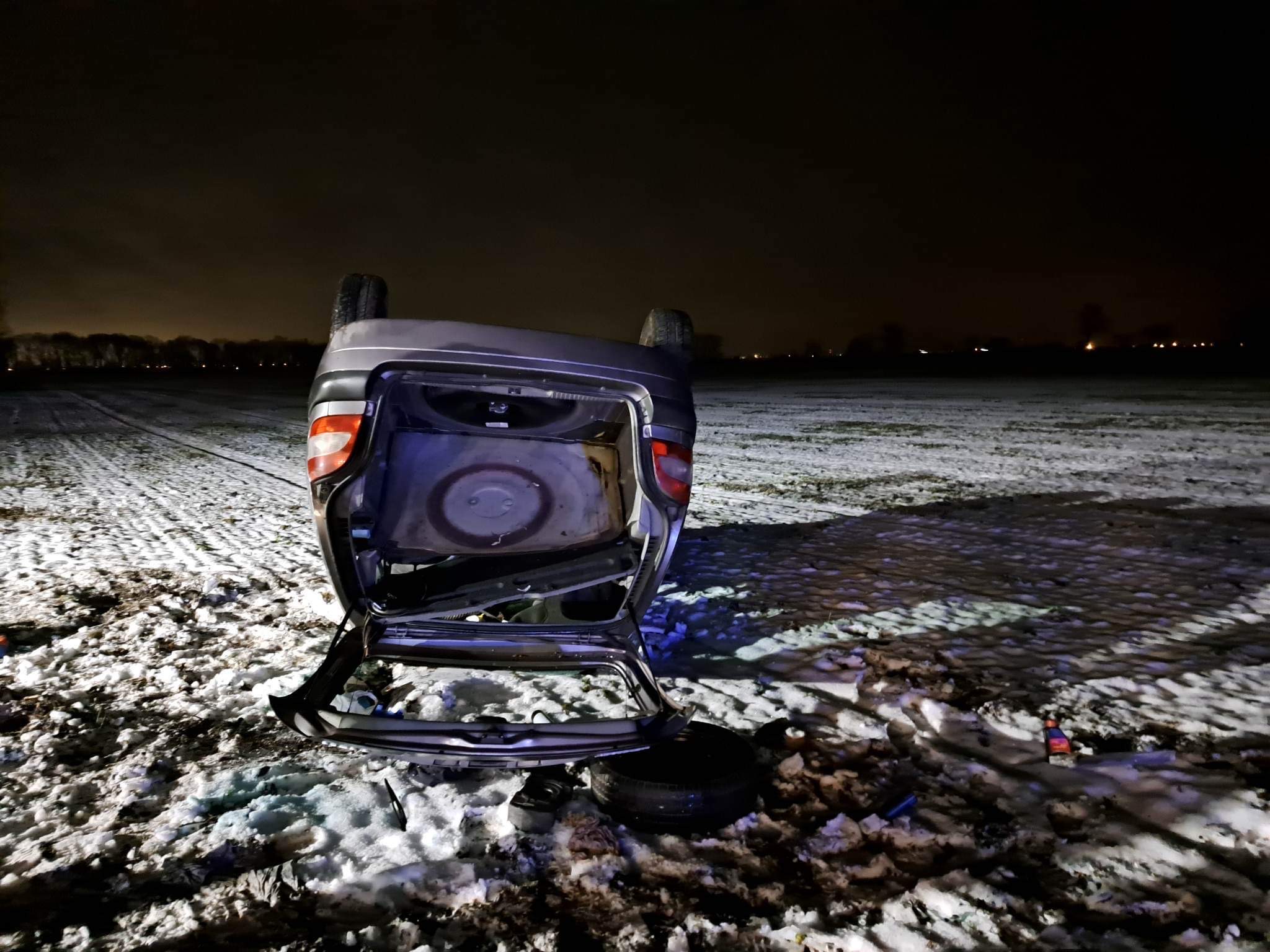Po przybyciu na miejsce zdarzenia zastano samochód osobowy Renault leżący na dachu na polu. Policja i PRM przybyli na miejsce przez pierwszym zastępem straży pożarnej. Osoba poszkodowana pod opieką ratowników medycznych.