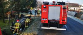 Po przybyciu na miejsce zdarzenia zastano samochód marki Opel w przydrożnym rowie leżący na dachu. Dwie osoby podróżujące (kobieta i mężczyzna) poza pojazdem, pod opieką strażaka (będącego poza godzinami pracy). Osoby podróżujące odmówiły pomocy ZRM.
