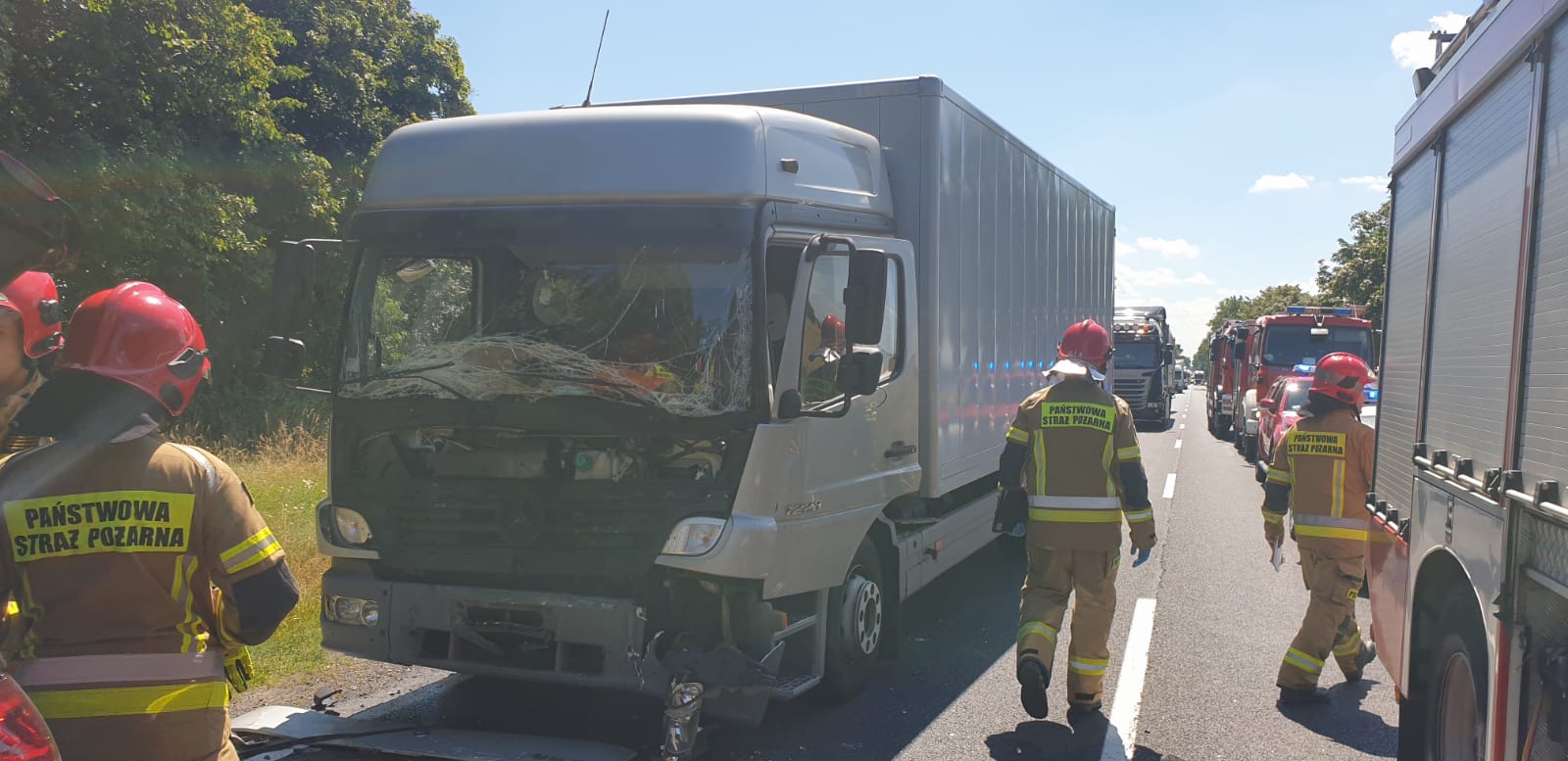 Po przybyciu na miejsce zdarzenia zastano cztery samochody po wcześniejszym zderzeniu. Uczestnicy wyszli z samochodów przed przybyciem strażaków. Samochodem ciężarowym Renault Premium podróżował sam kierowca - bez obrażeń. Samochodem Mercedes GLE podróżowały trzy osoby: kobieta, mężczyzna i z dzieckiem - bez obrażeń. Samochodem ciężarowym Mercedes Atego podróżował sam kierowca, który doznał urazu prawego kolana. Samochodem Citroen Jumper podróżował sam kierowca - bez obrażeń.