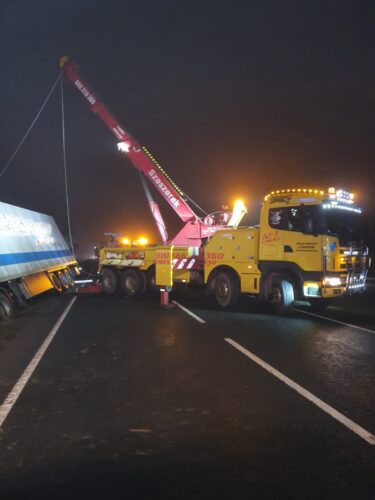 Miejsce akcji zabezpieczono. Działania zastępów polegały na oświetleniu terenu, kierowaniu ruchem drogowym (ruch wahadłowy ze względu na pojazdy JOP). Pomoc drogowa wyciągnęła samochód wraz z naczepą z pobocza DK25. Na czas wyciągania zestawu droga była całkowicie zablokowana, a działania zastępów straży pożarnej polegały na pomocy policji w kierowaniu ruchem. Zestaw po wyciągnięciu został odholowany w miejsce bezpieczne.
