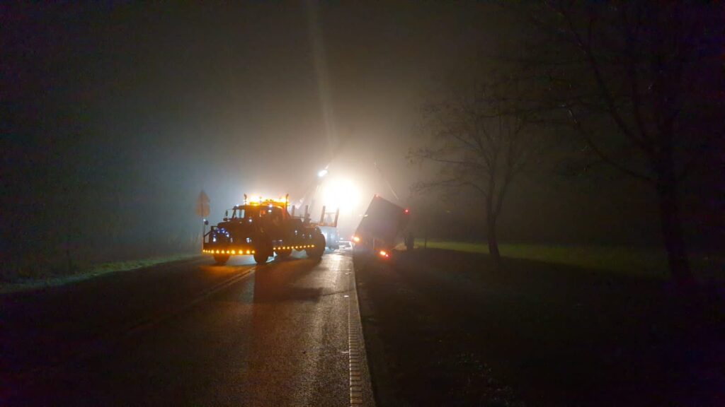 Po przybyciu na miejsce zdarzenia zastano samochód ciężarowy marki Volvo z naczepą w przydrożnym rowie. Osoba podróżująca poza pojazdem, bez obrażeń. Policja na miejscu.