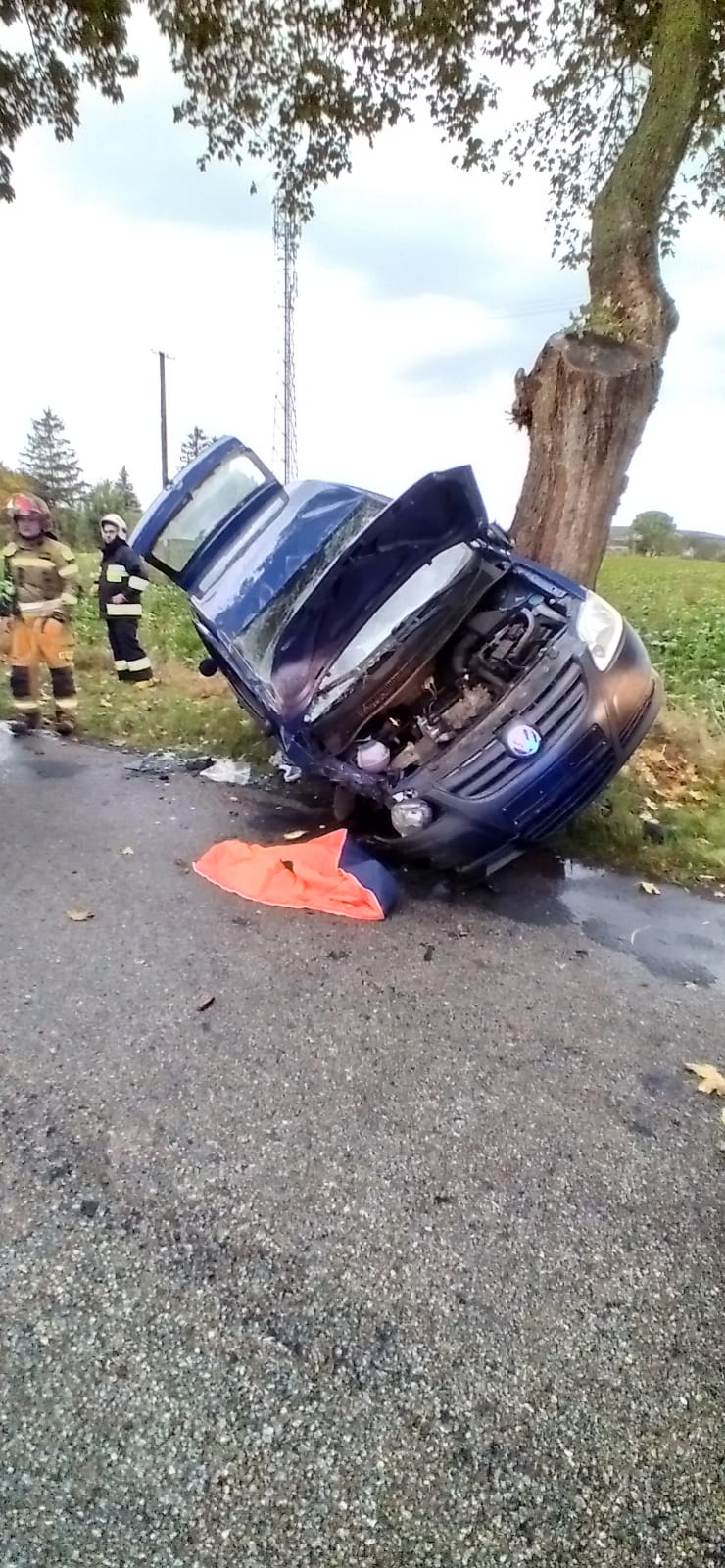 Po przybyciu na miejsce zdarzenia zastano rozbity samochód osobowy oparty o przydrożne drzewo. Przy pojeździe, na jezdni leżał mężczyzna. Przytomny, z krwawiącą raną głowy. Droga powiatowa zablokowana.
