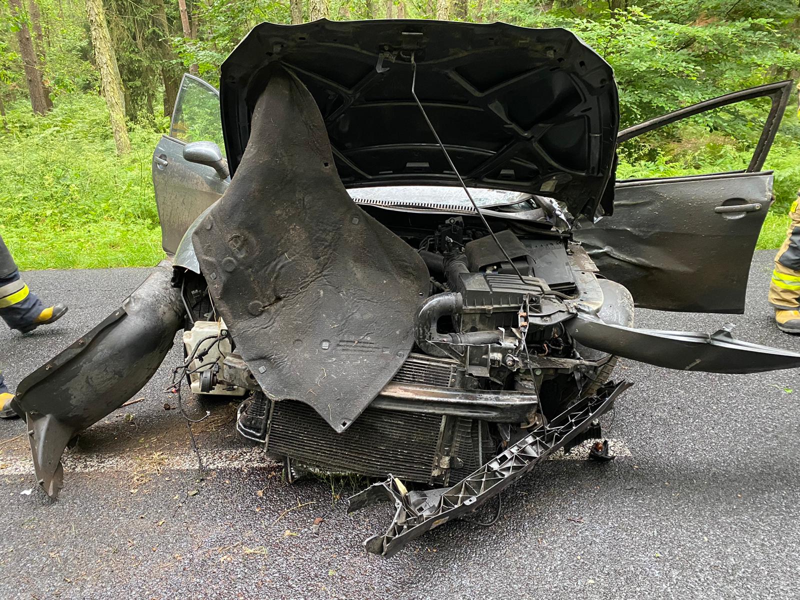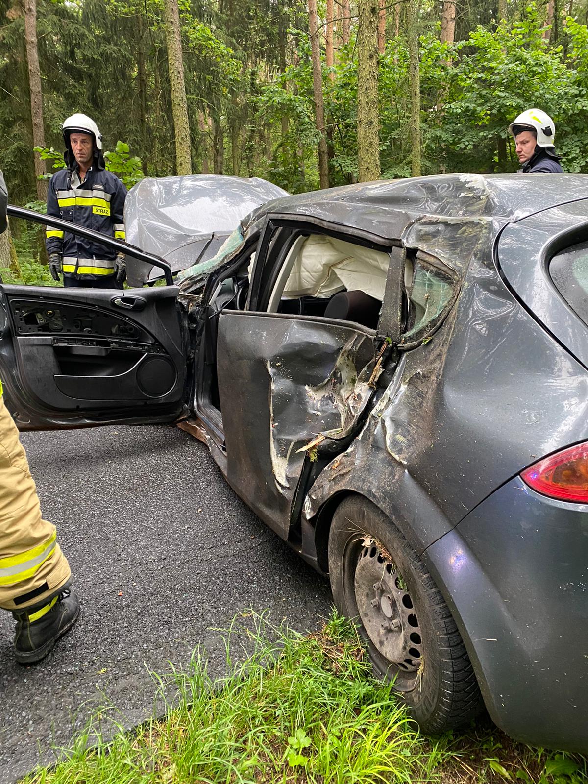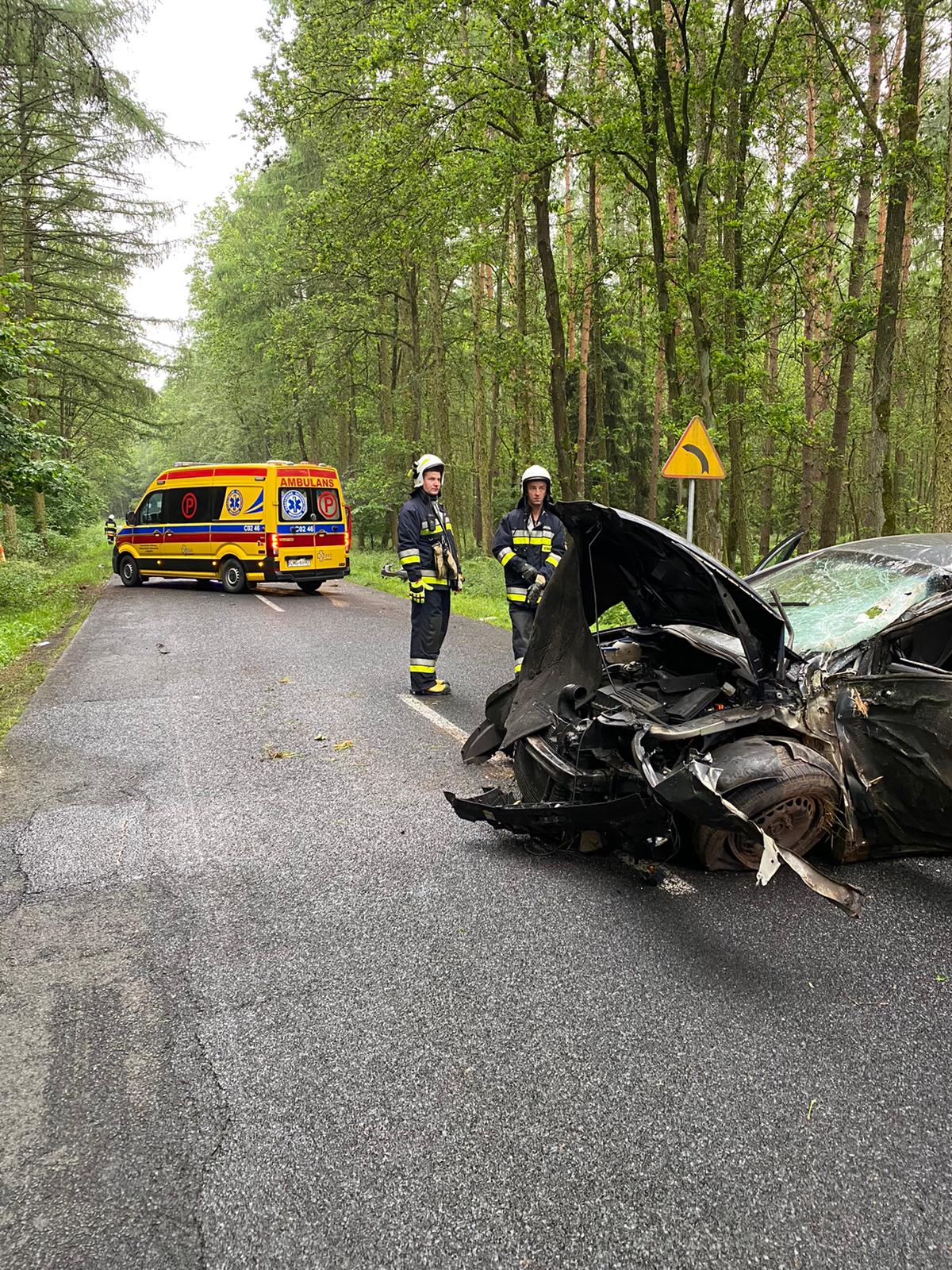 Po przybyciu na miejsce zdarzenia zastano samochód osobowy na lewym pasie jezdni po wcześniejszym uderzeniu w drzewa. Kierowca znajdował się poza pojazdem, był przytomny i miał obrażenia ręki. Jeden pas drogi zablokowany.