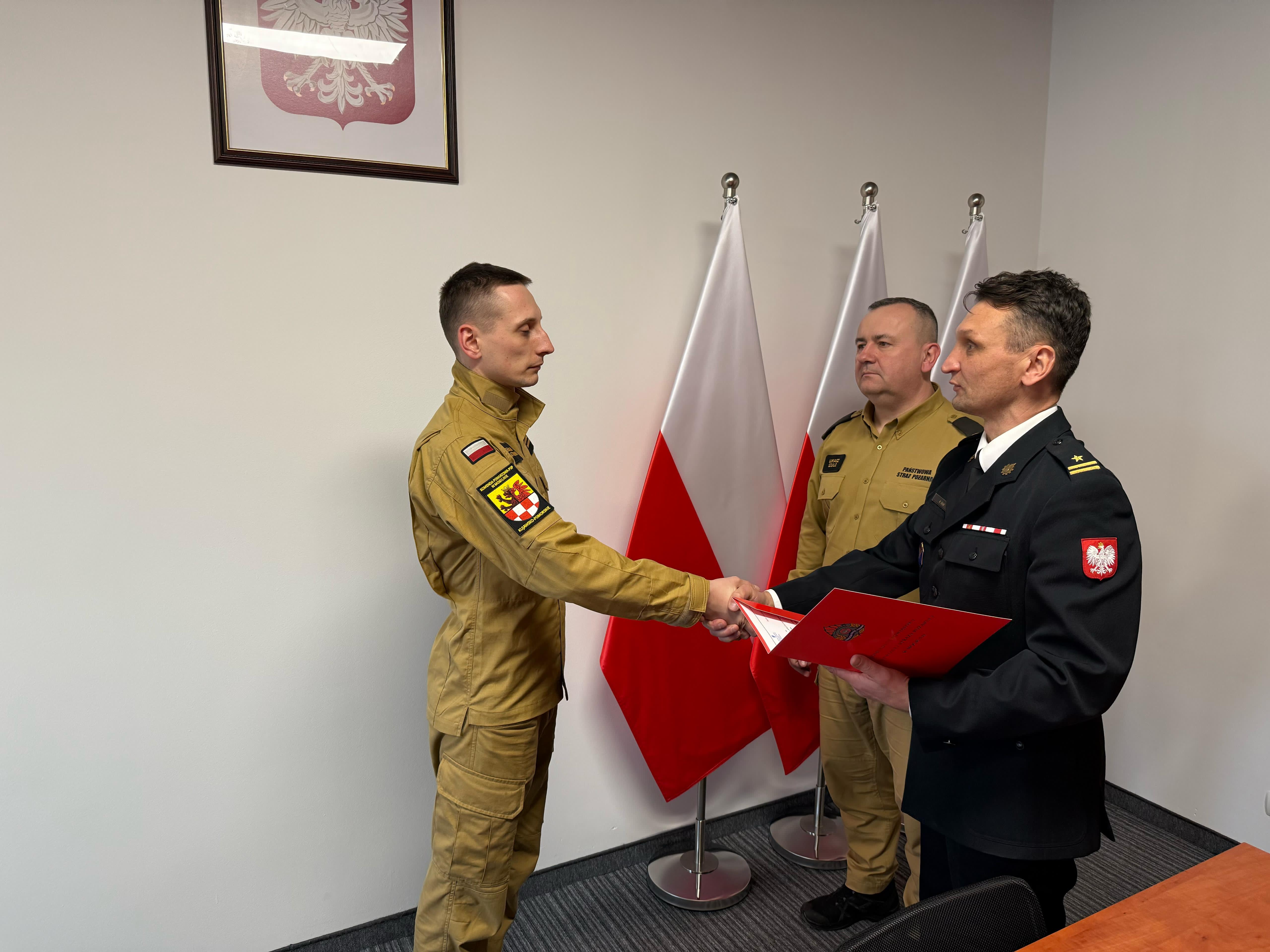 W dniu dzisiejszym Komendant Powiatowy Państwowej Straży Pożarnej w Mogilnie mł. bryg. Krzysztof Bąk w obecności dowództwa JRG Mogilno mł. bryg. Łukasza Szulca i mł. bryg. Patryka Kaczmarka przekazał na ręce sekc. Sebastiana Matuszewskiego decyzję o mianowaniu na stanowisko ratownik-kierowca.