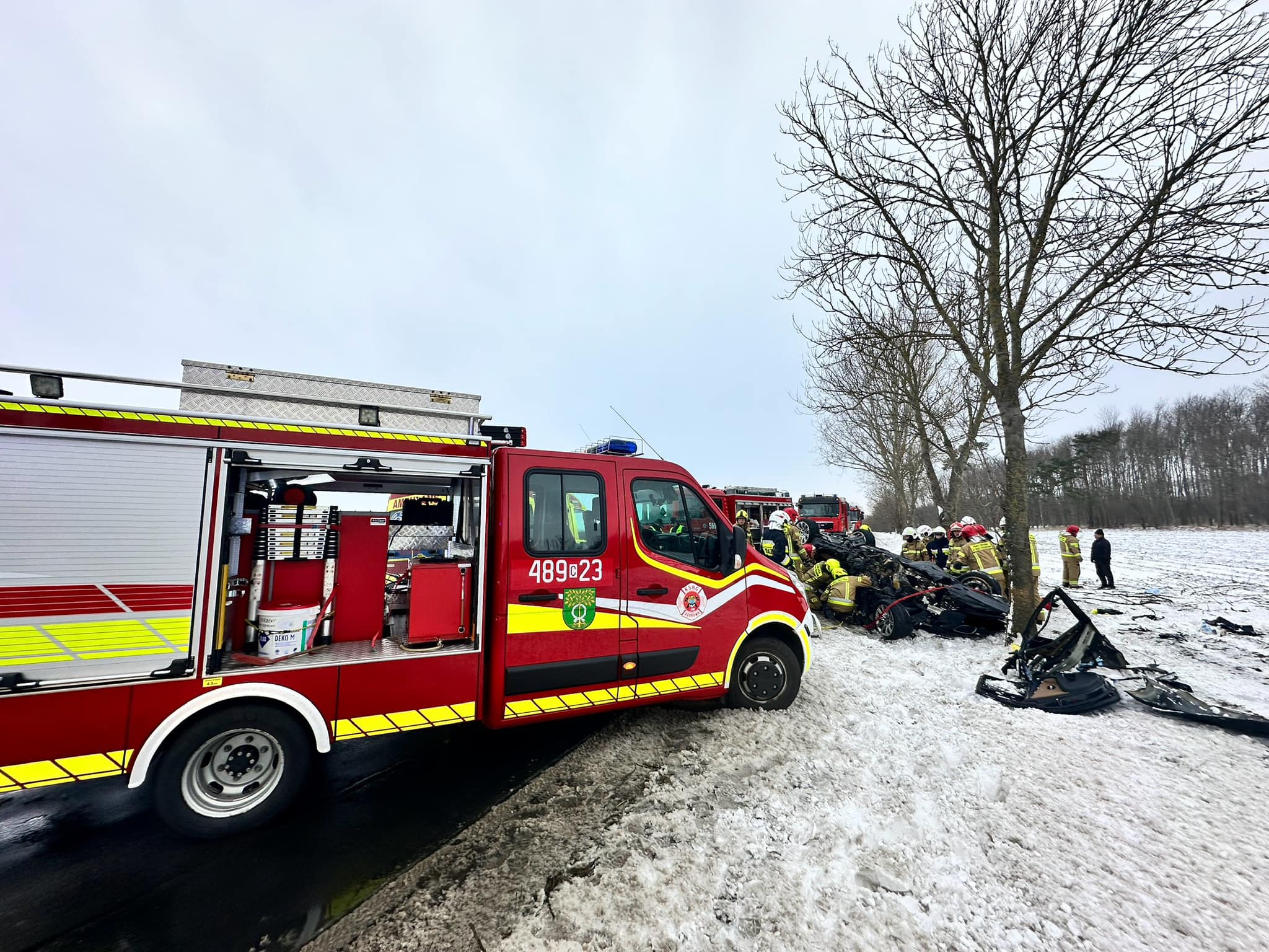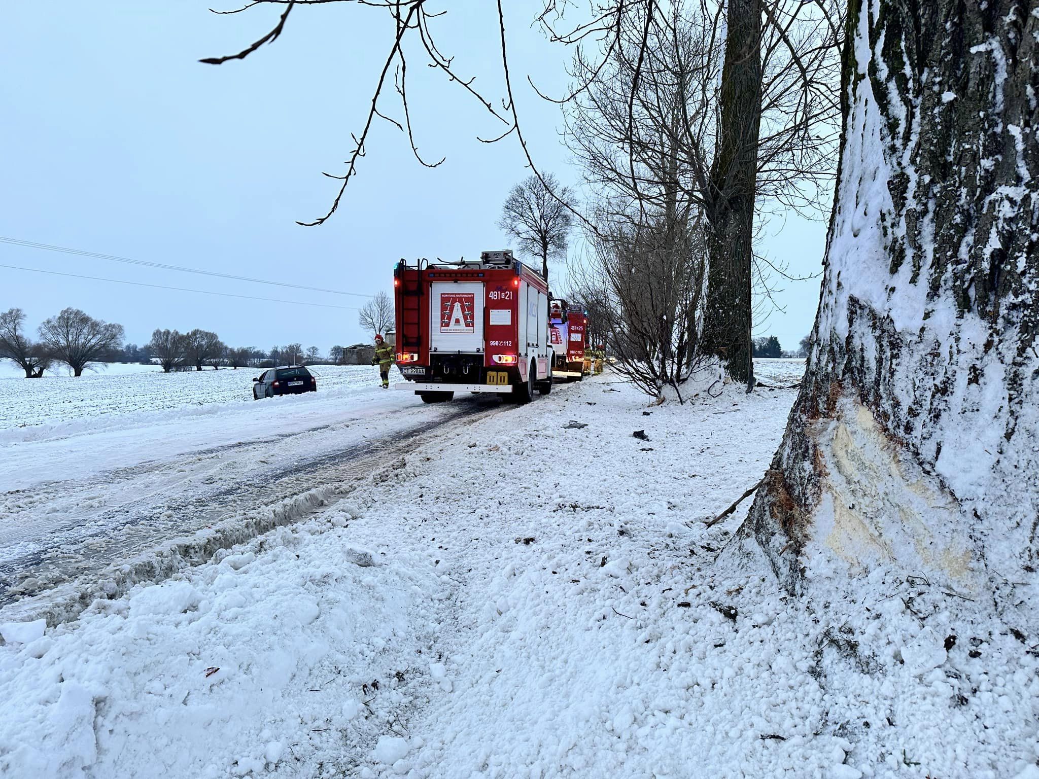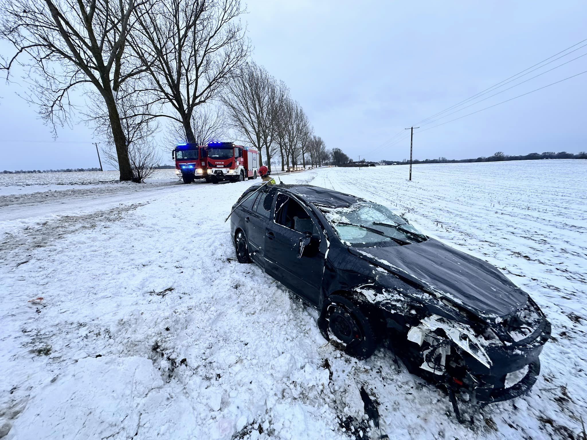 Do drugiego zdarzenia Dyżurny SKKP PSP w Mogilnie dyponował 2 zastępy z JRG Mogilno. Po przybyciu na miejsce zdarzenia zastano samochód osobowy - Skoda - po wcześniejszym uderzeniu w drzewo i dachowaniu. Samochód w całości znajdował się poza drogą. Samochodem podróżował mężczyzna wraz z dzieckiem (chłopiec-2 lata). Znajdowali się poza pojazdem, pod opieką przybyłego przed pierwszym zastępem ZRM. Mężczyzna bez obrażeń, chłopiec z widocznym krwawieniem z nosa.