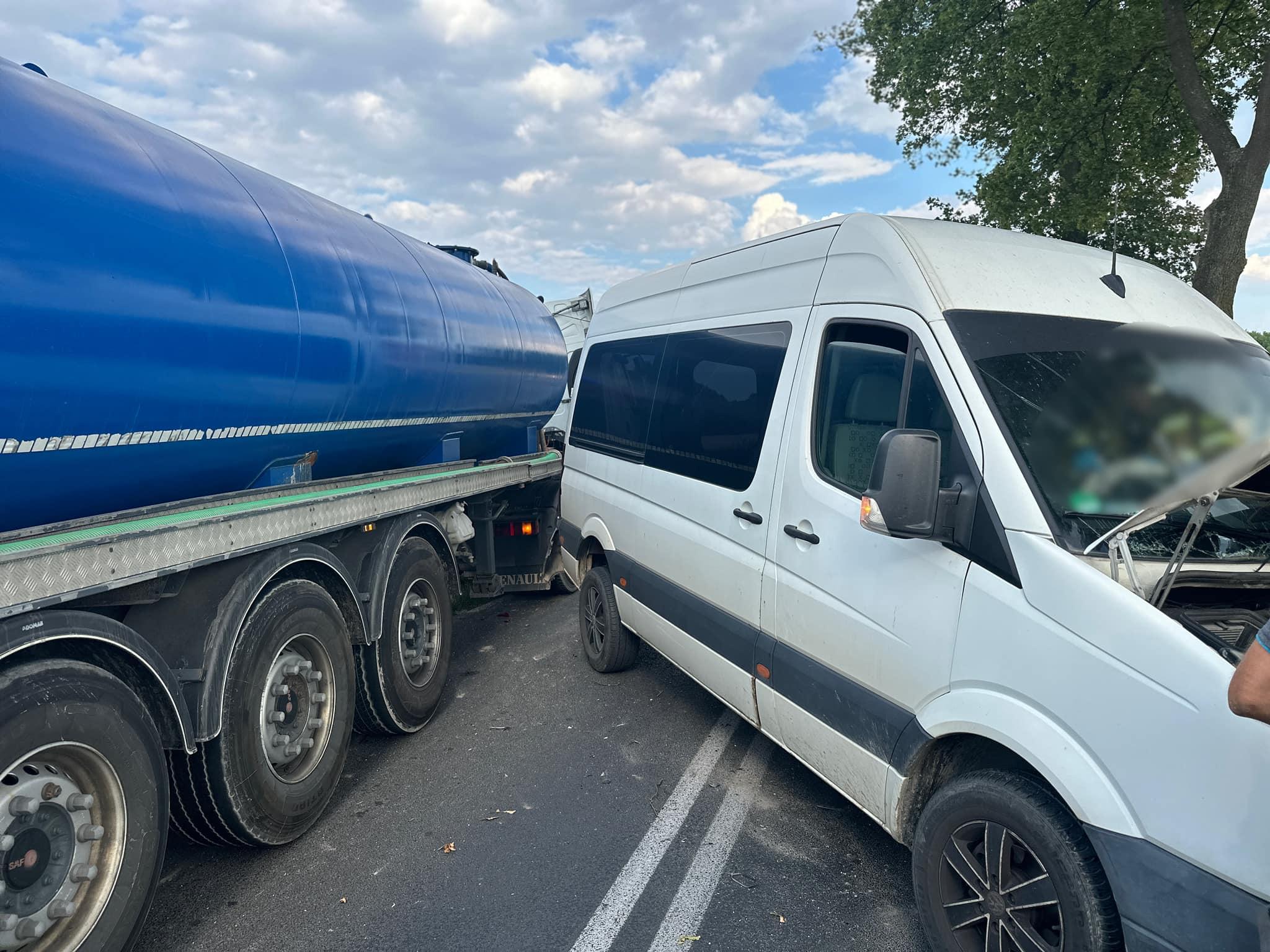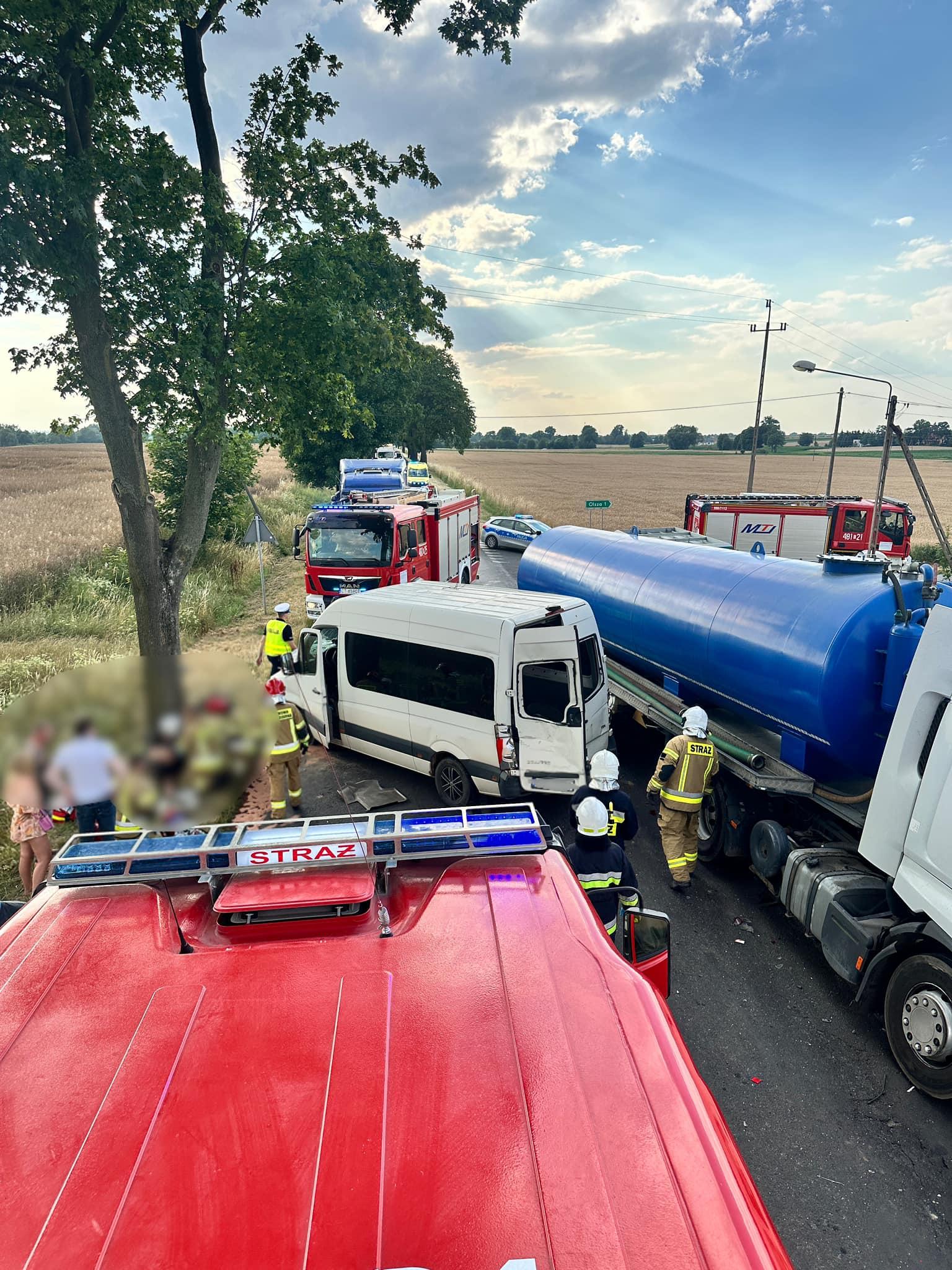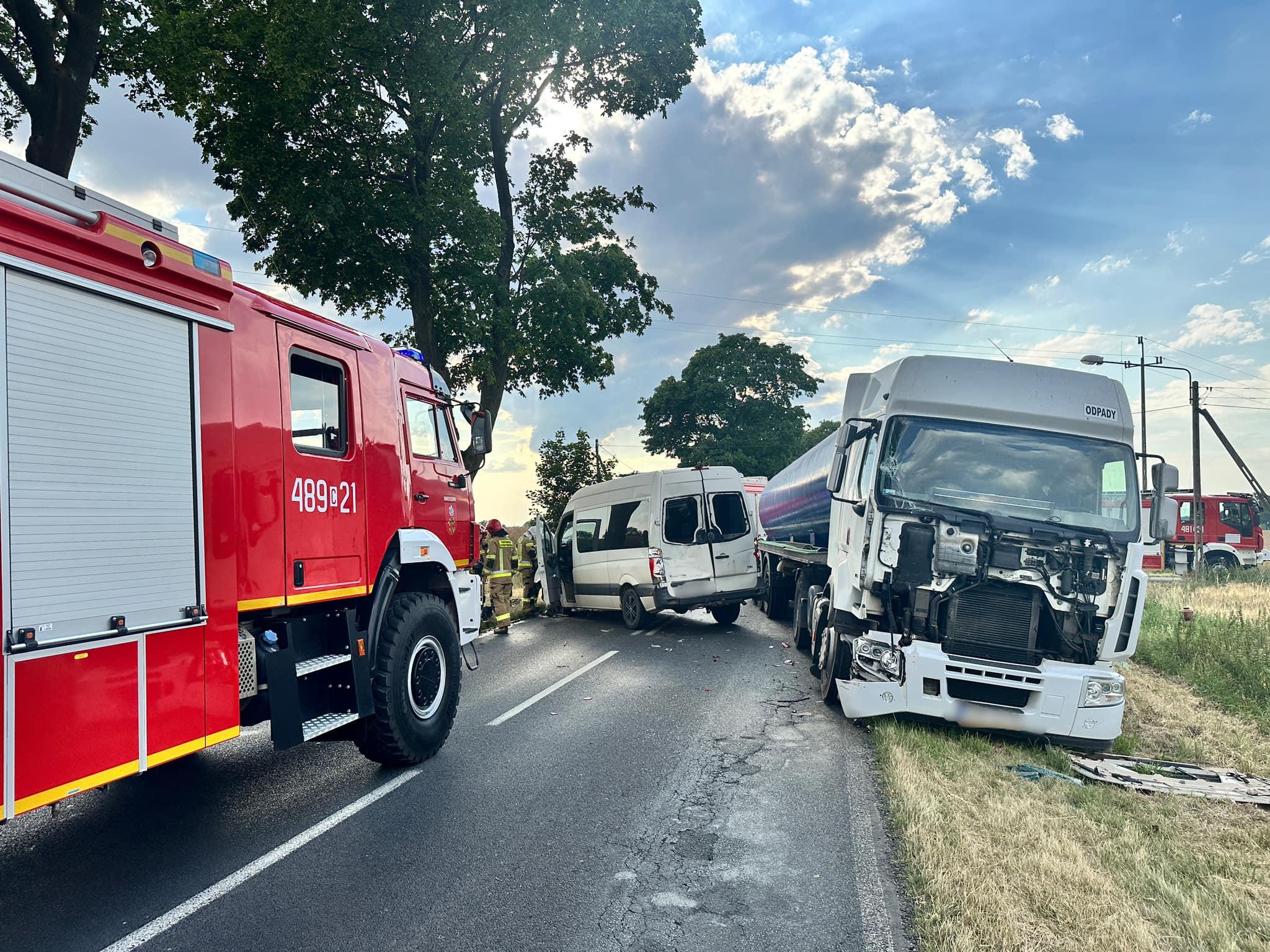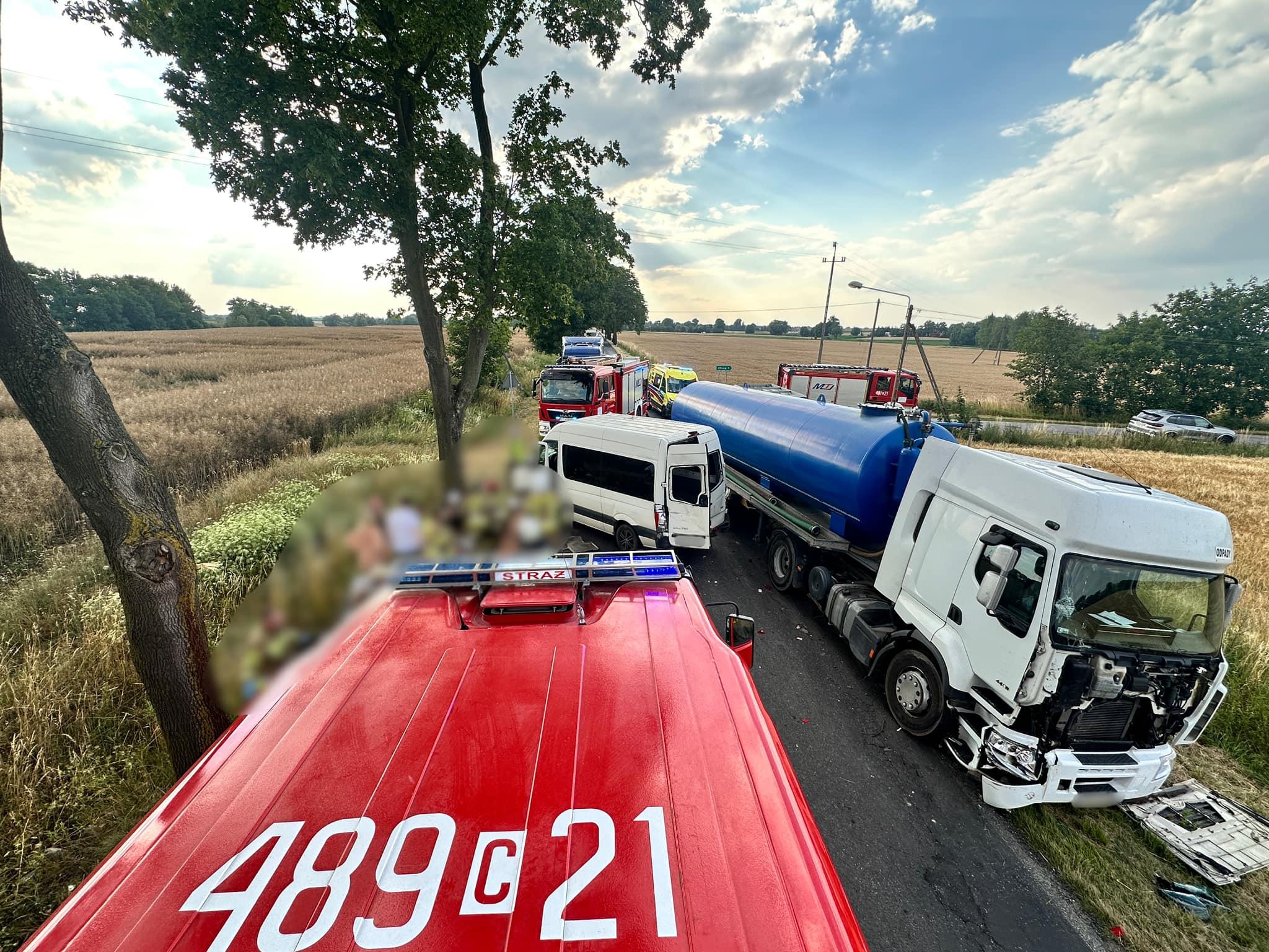 Po przybyciu na miejsce zdarzenia zastano samochód ciężarowy (Renault) z pustą naczepą (cysterną) i busa (VW Crafter) dostawczego po wcześniejszym zderzeniu. Droga całkowicie zablokowana. Samochodami podróżowali tylko kierowcy, którzy znajdowali się poza pojazdami w momencie przybycia JOP. Kobieta poszkodowana miała założony opatrunek osłaniający na ranę głowy przez osoby postronne. Kierowca samochodu ciężarowego bez obrażeń.