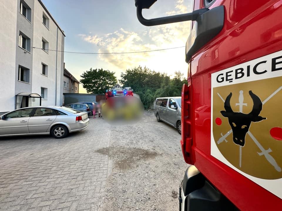 W trakcie działań przy wypadku, do SKKP PSP w Mogilnie wpłyneło zgłoszenie o pożarze piwnicy w bloku mieszkalnym przy ul. Kasztanowej. Do działań zadysponowany został zastęp GBA z JRG Mogilno oraz GCBA z OSP Gębice. Po przybyciu na miejsce zdarzenia zastano zadymienie w piwnicy budynku. Część mieszkańców budynku znajdowała się poza obiektem, a część w swoich mieszkaniach.
