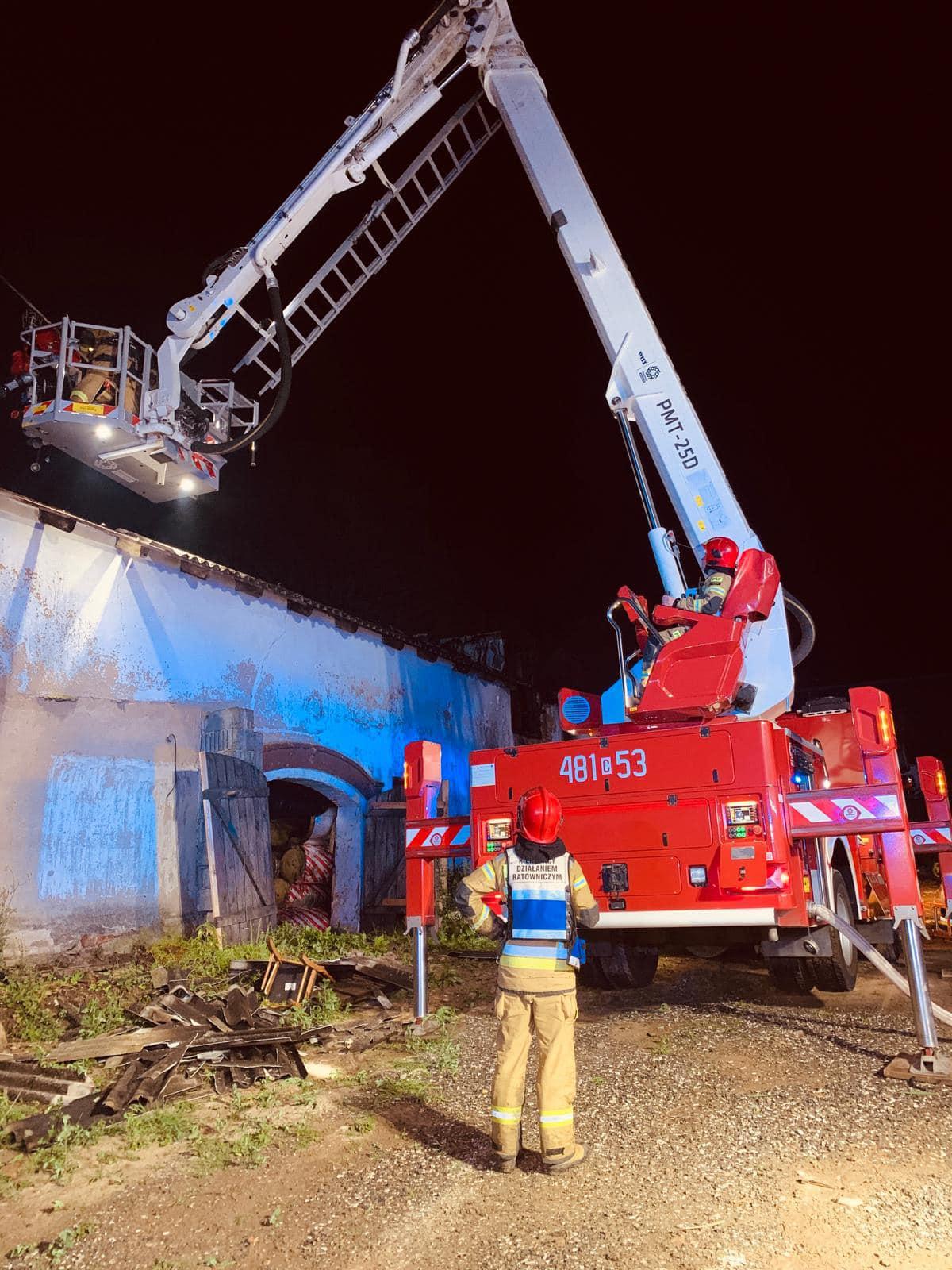 Działania strażaków polegały na zabezpieczeniu miejsca zdarzenia. W pierwszej fazie działań, zastępy podały jeden prąd wody w obronie na cześć budynku połączoną z sąsiednim obiektem oraz drugi prąd wody w natarciu na palącą się konstrukcję stodoły. Jednocześnie odłączono bezpieczniki w skrzynce elektrycznej na pobliskim budynku mieszkalnym. W trakcie dojazdu kolejnych zastępów sukcesywnie podano kolejne dwa prądy wody w natarciu do wnętrza budynku z drabin przystawnych, jeden prąd wody z podnośnika na palącą się konstrukcje dachu oraz dwa prądy wody z tyłu budynku stodoły. W trakcie działań gaśniczych wyznaczono rotę asekuracyjną. Za zgodą właściciela pobliskiego stawu zbudowano zasilanie przy pomocy pompy pływającej.