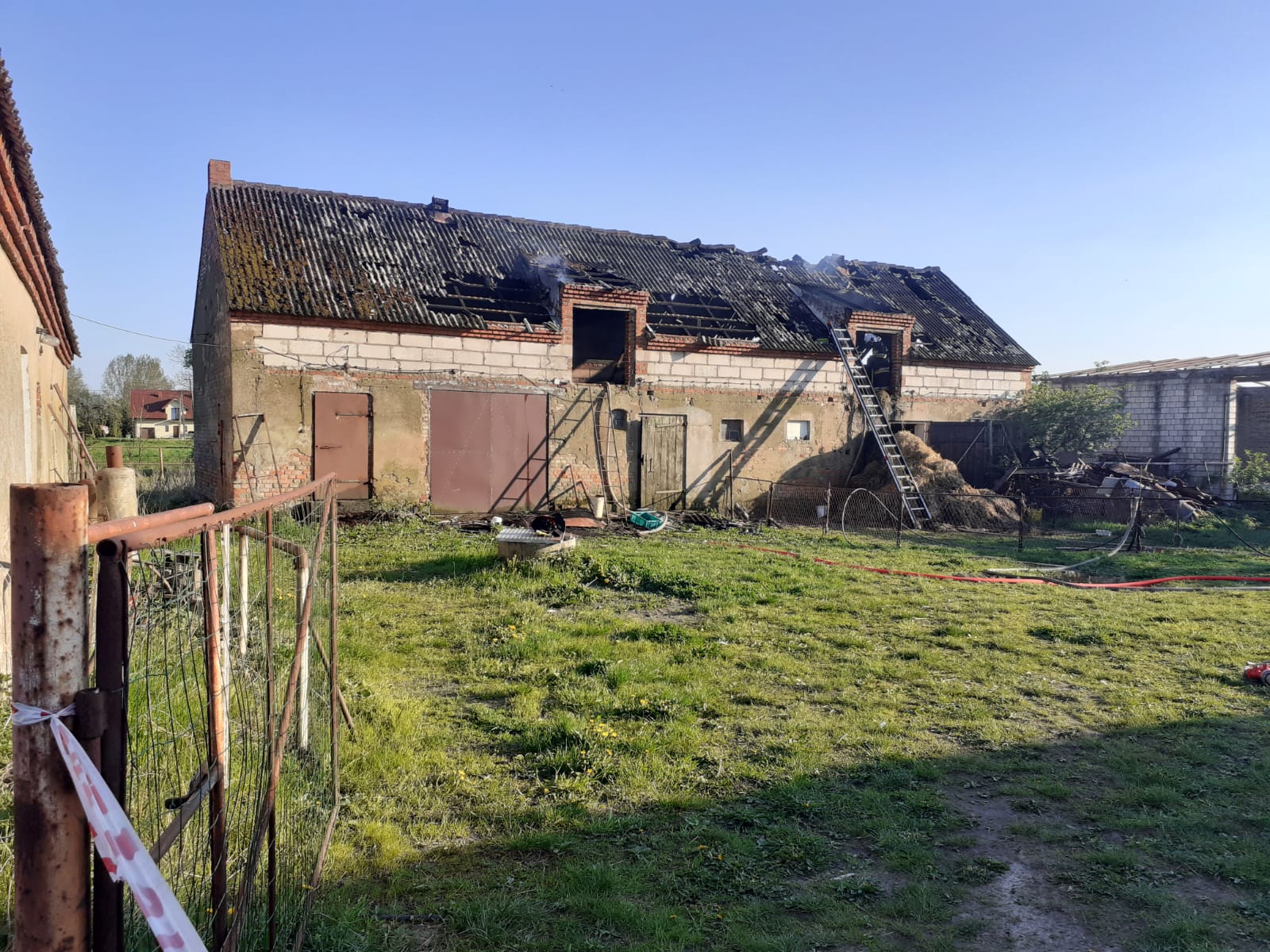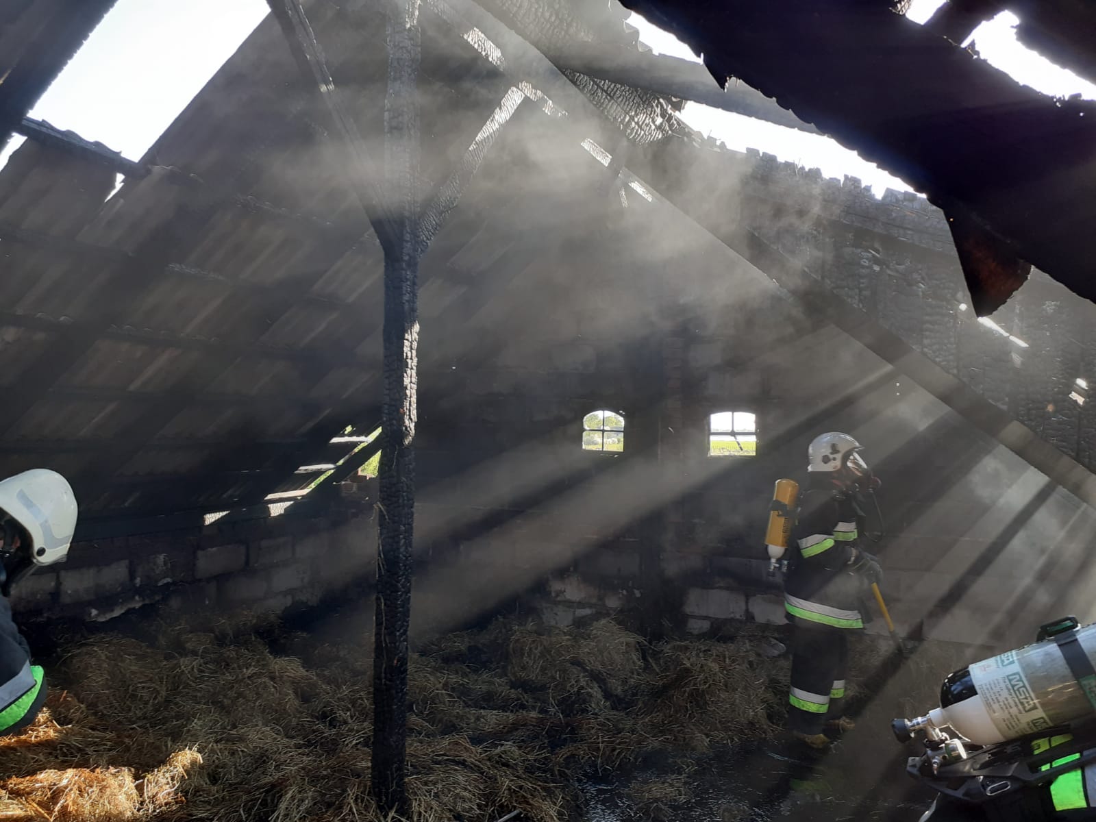 Po przybyciu na miejsce zdarzenia zastano palący się budynek gospodarczy. Ogniem objęte było poddasze oraz siano i płody rolne znajdujące się wewnątrz. Do budynku nie był doprowadzony prąd.