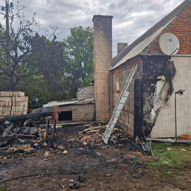 Po przybyciu na miejsce zdarzenia zastano w całości objętą pożarem wiatę i szopkę, która przylegała bezpośrednio do budynku mieszkalnego jednorodzonego. Dach i ocieplenie budynku jednorodzinnego częściowo było objęte pożarem. Brak osób poszkodowanych.
