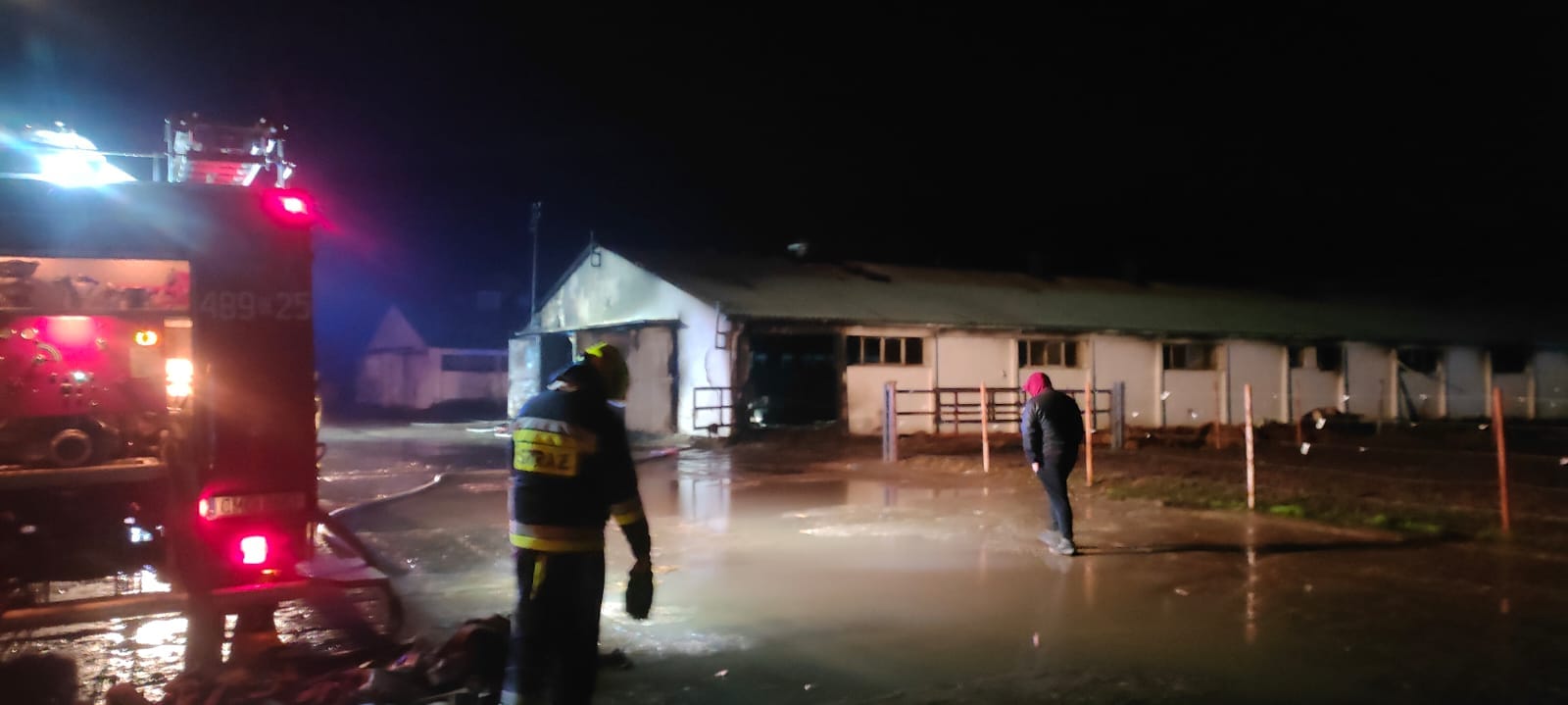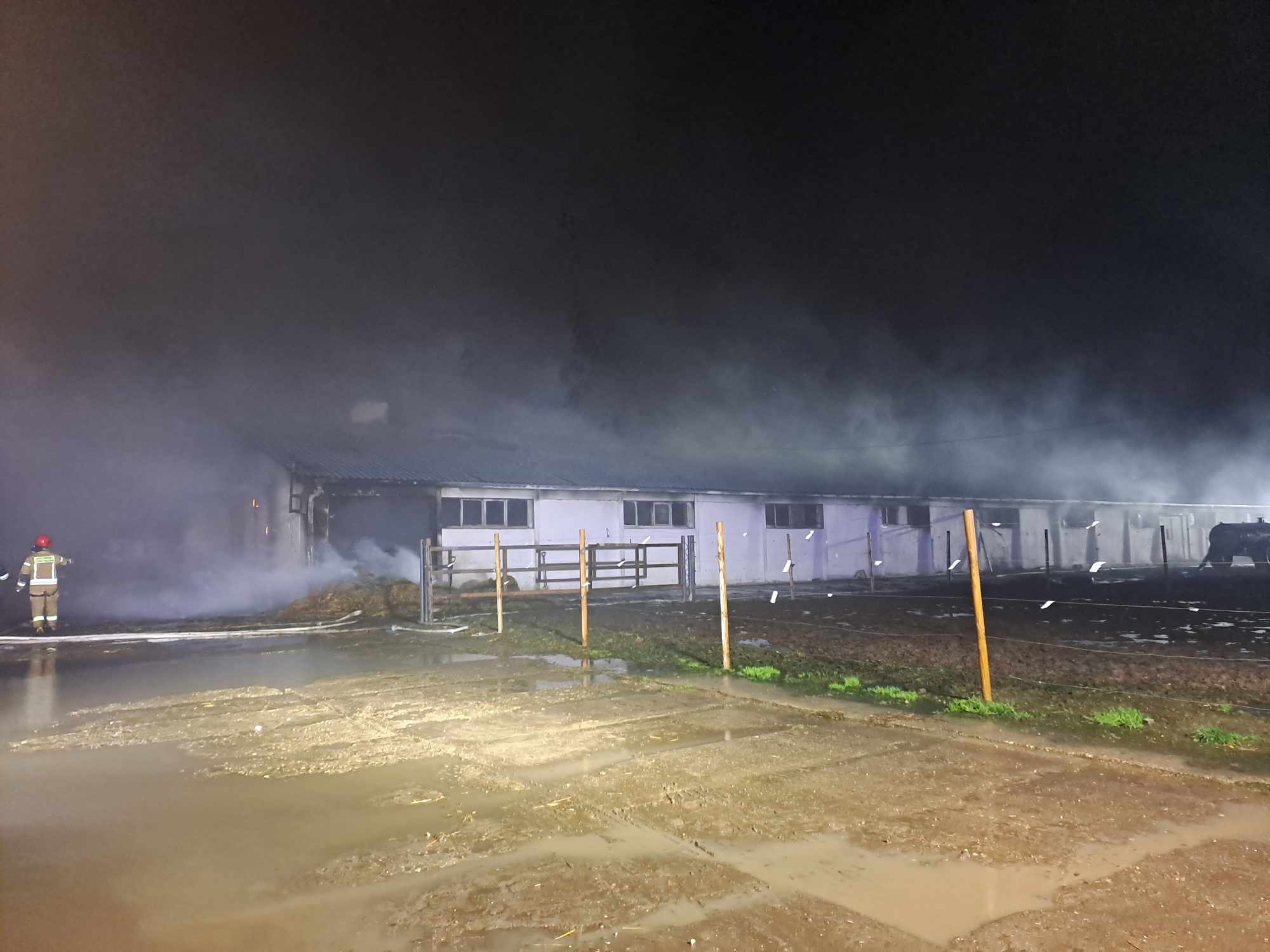 Po przybyciu na miejsce zdarzenia zastano dwa budynki inwentarskie połączone łącznikiem. Jedna część budynku inwentarskiego objęta była wewnątrz w całości ogniem. Wewnątrz budynku objętego pożarem znajdowało się ok. 70 sztuk bydła, które leżało na posadzce, 3 ciągniki rolnicze oraz paszo-wóz. Wszystkie ww. były objęte ogniem. W drugim budynku nie objętym pożarem znajdowało się około 75 sztuk bydła.