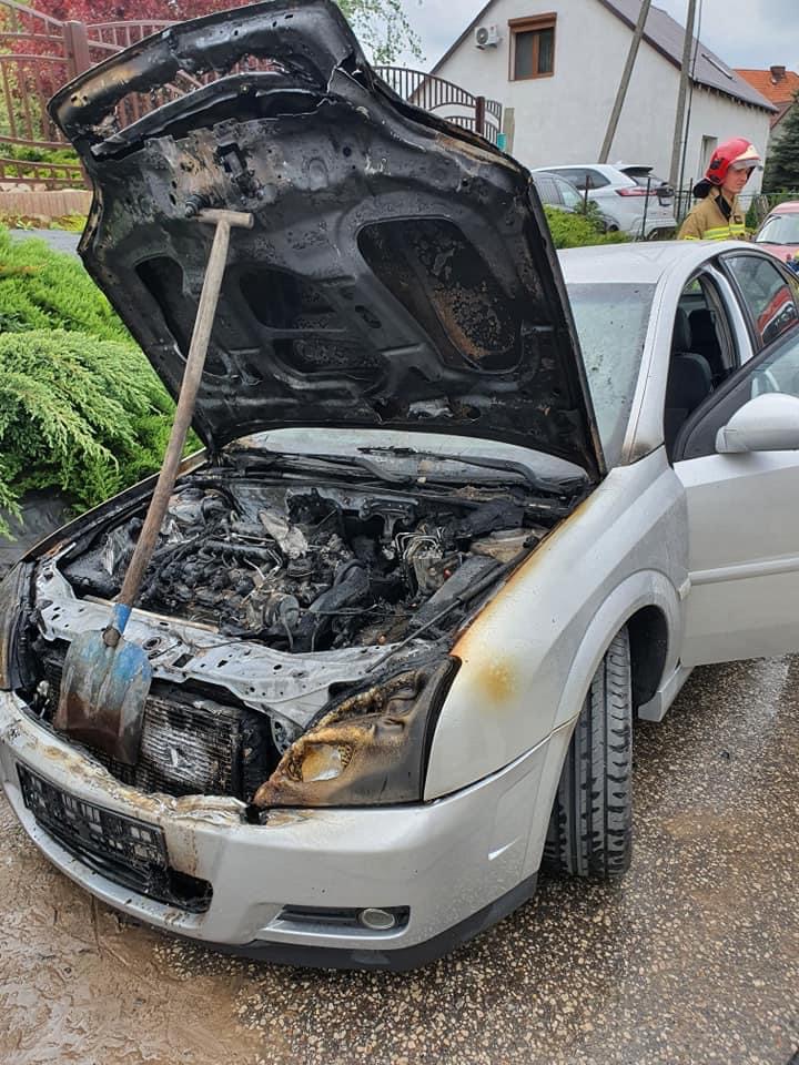 Po przybyciu na miejsce zdarzenia zastano samochód osobowy Opel Vectra na poboczu drogi z płonącą komorą silnika.
