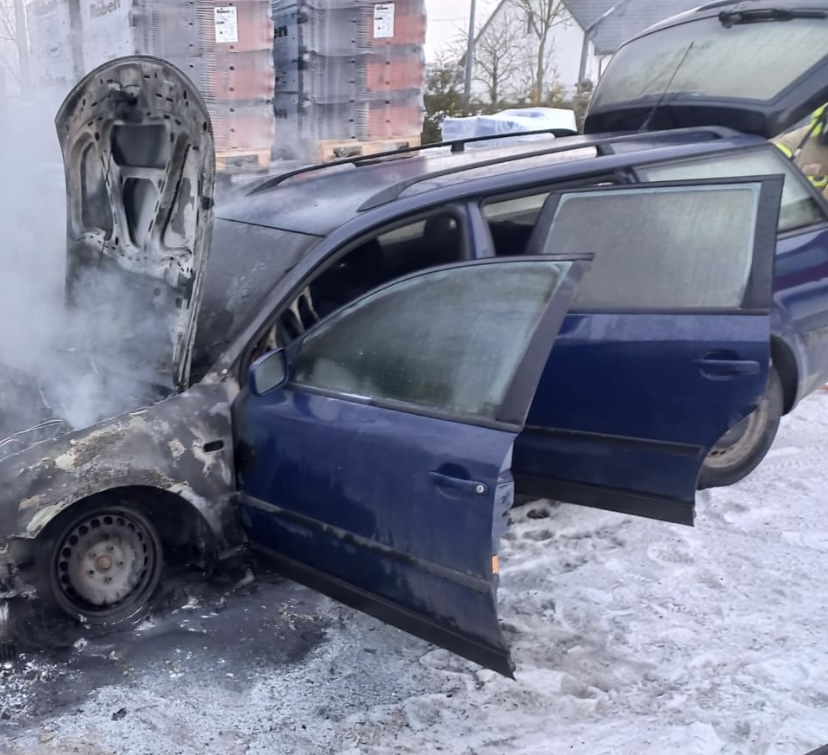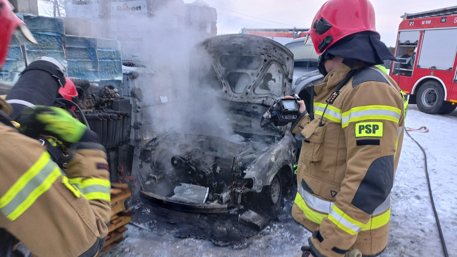 Po przybyciu na miejsce zdarzenia zastano palący się samochód osobowy VW Passat na placu składowym materiałów budowlanych.