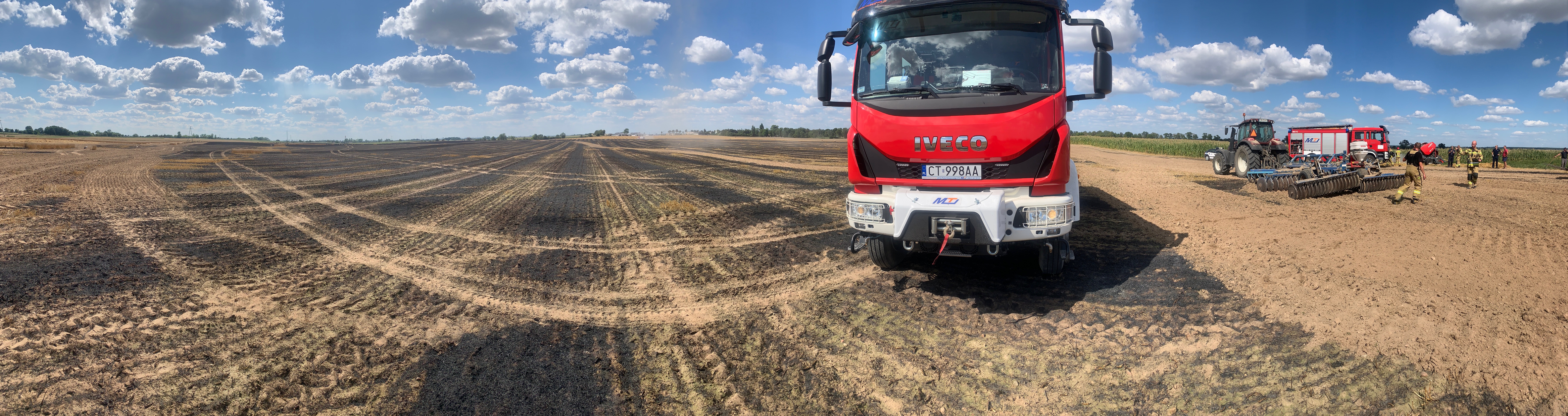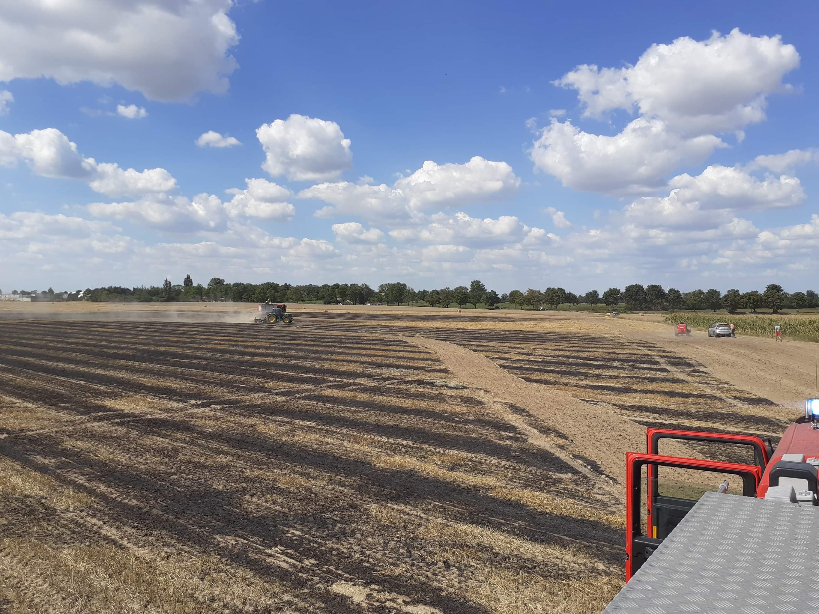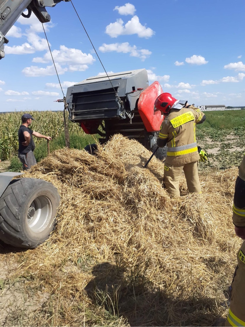 Po przybyciu na miejsce zdarzenia zastano kilka hektarów zboża na pniu i ścierniska w ogniu oraz prasę rolniczą, z której wydobywał się dym. Zagrożone pożarem były sąsiednie pola ze zbożem.