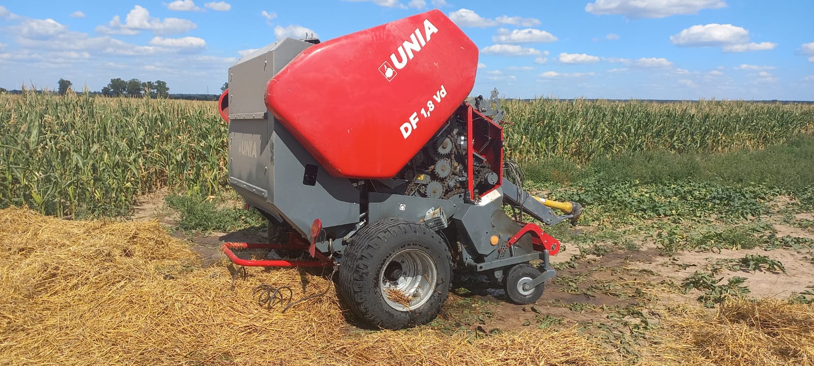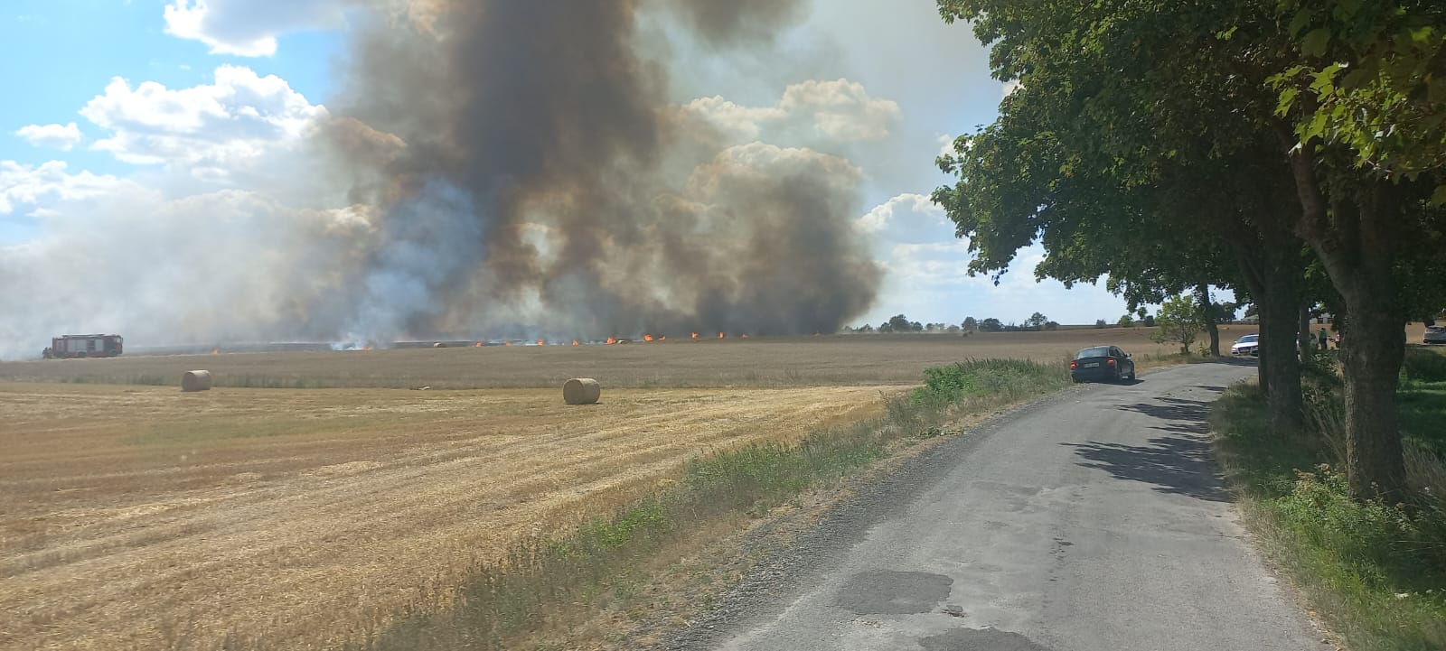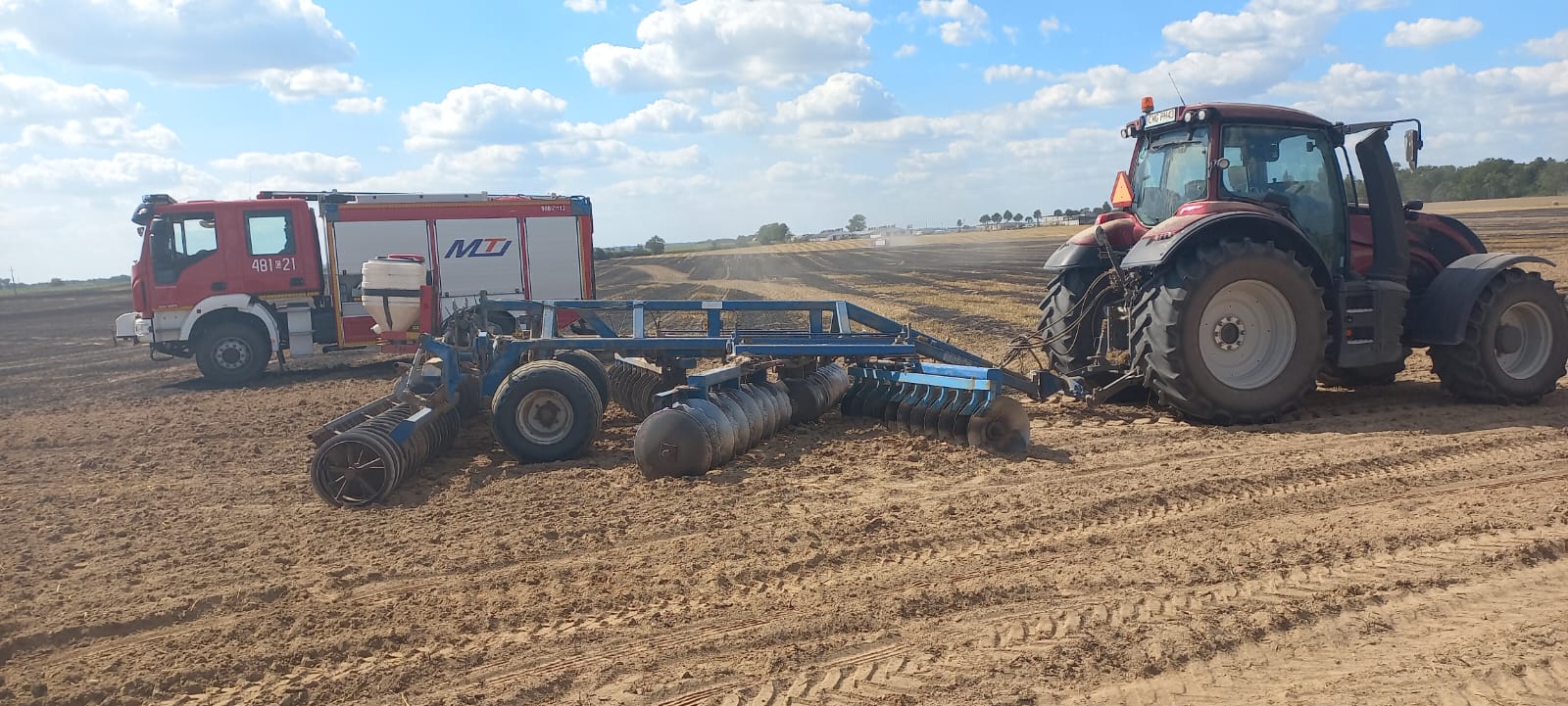 Po przybyciu na miejsce zdarzenia zastano kilka hektarów zboża na pniu i ścierniska w ogniu oraz prasę rolniczą, z której wydobywał się dym. Zagrożone pożarem były sąsiednie pola ze zbożem.