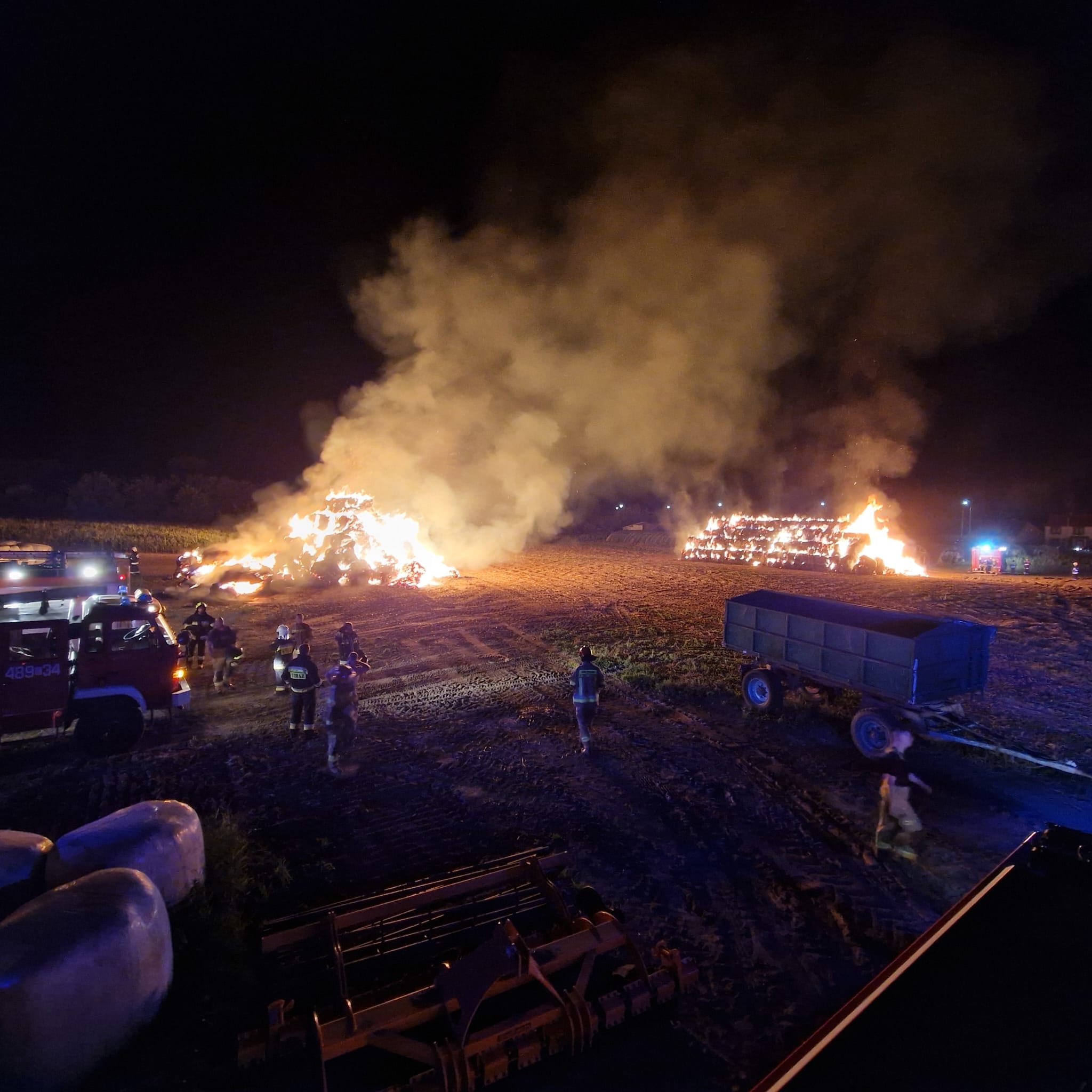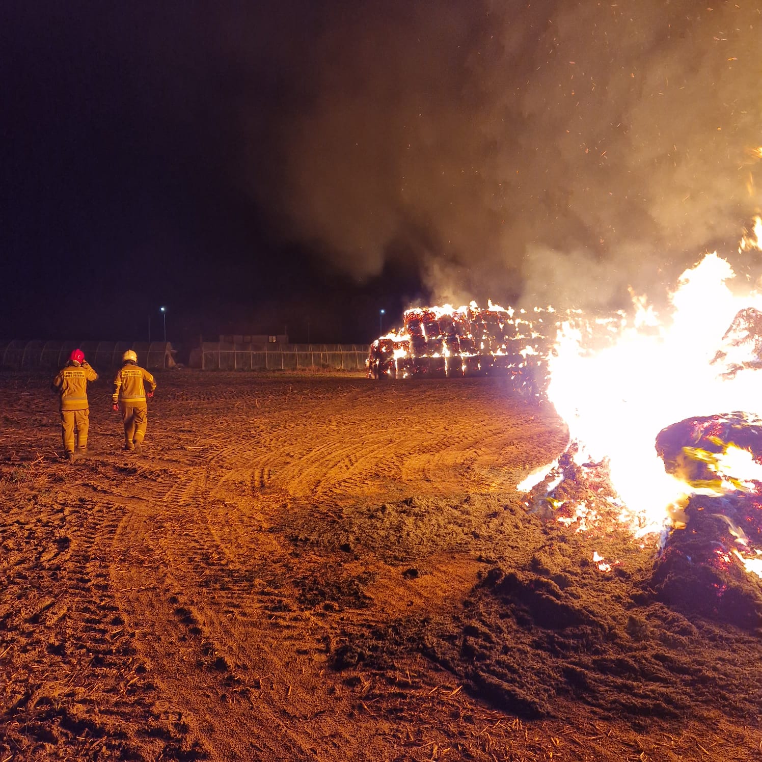 Po przybyciu na miejsce zdarzenia zastano dwa stogi słomy (około 250 szt. balotów w każdym stogu) objętych w całości ogniem. W pobliżu stogów znajdowało się 11 tuneli foliowych z pomidorami (jeden tunel z uszkodzoną od temperatury folią) oraz baloty z sianokiszonką.