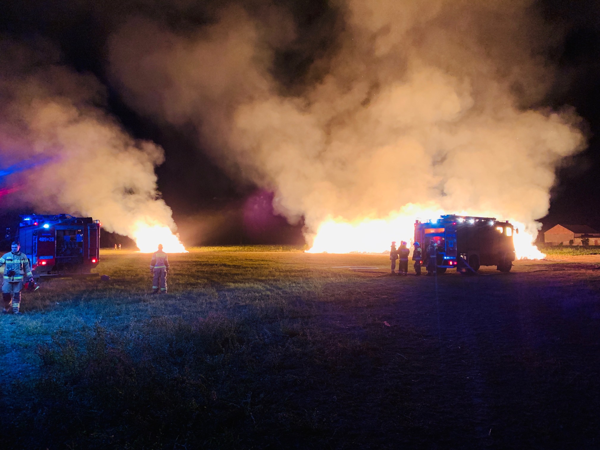 Po przybyciu na miejsce zdarzenia zastano dwa stogi słomy (około 500 szt. balotów) objętych w całości ogniem. Około 50m od większego stogu znajdowała się murowana stodoła.