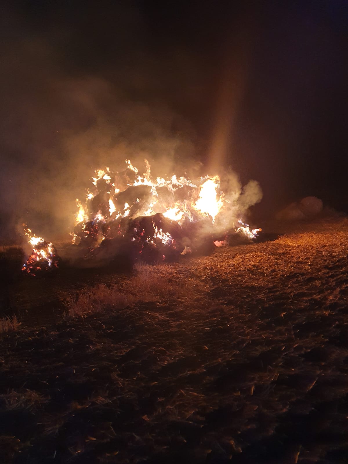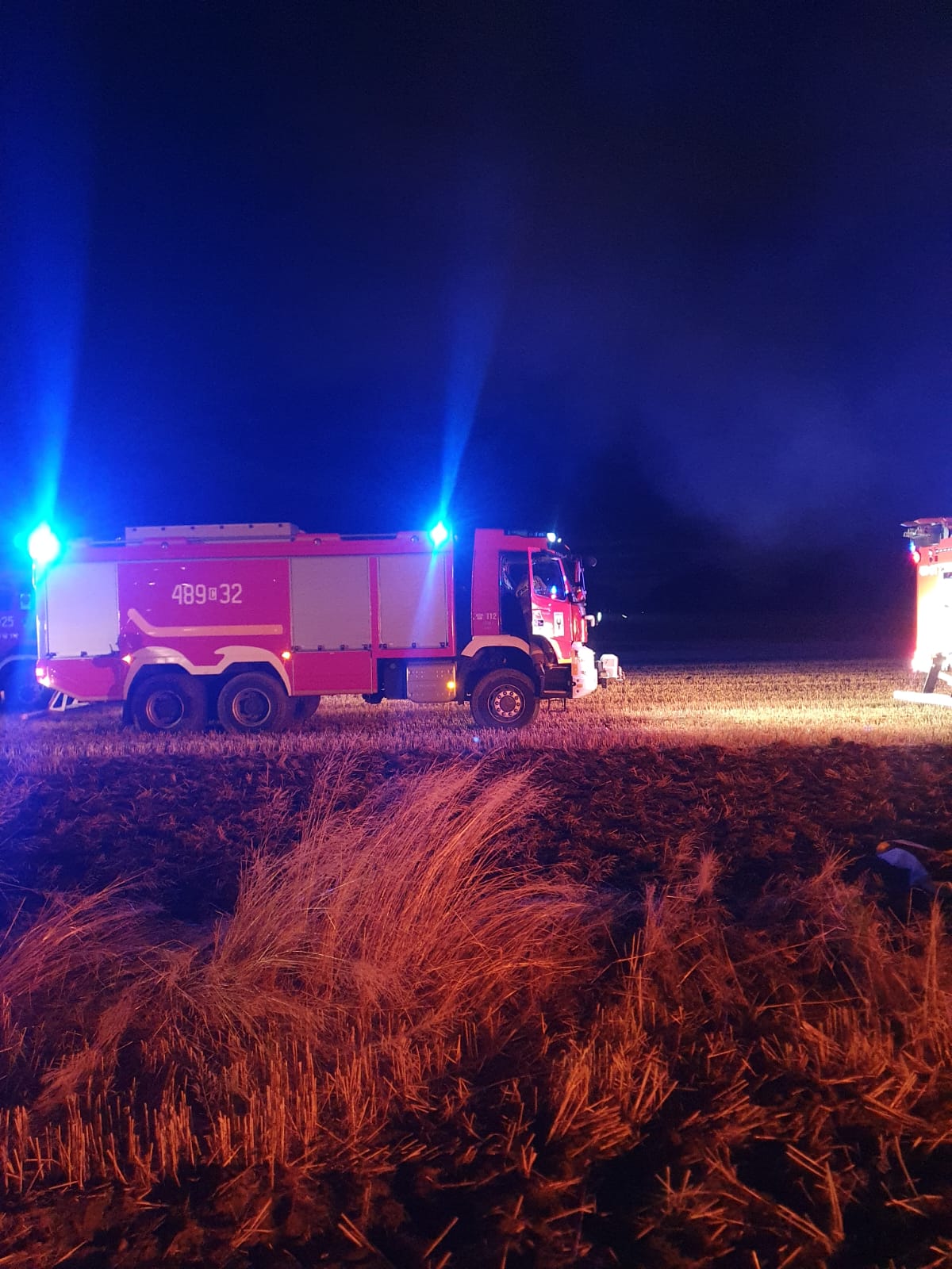 Po przybyciu na miejsce zdarzenia zastano stóg słomy (około 60 balotów) objęty w całości ogniem. Teren wokół stogu został uprawiony przy użycia ciągnika z broną talerzową przez właściciela stogu w celu zminimalizowania ryzyka pożaru ścierniska. Brak dodatkowych zagrożeń. Po przeprowadzonym rozpoznaniu wiekszość zastępów wróciło do swoich remiz.