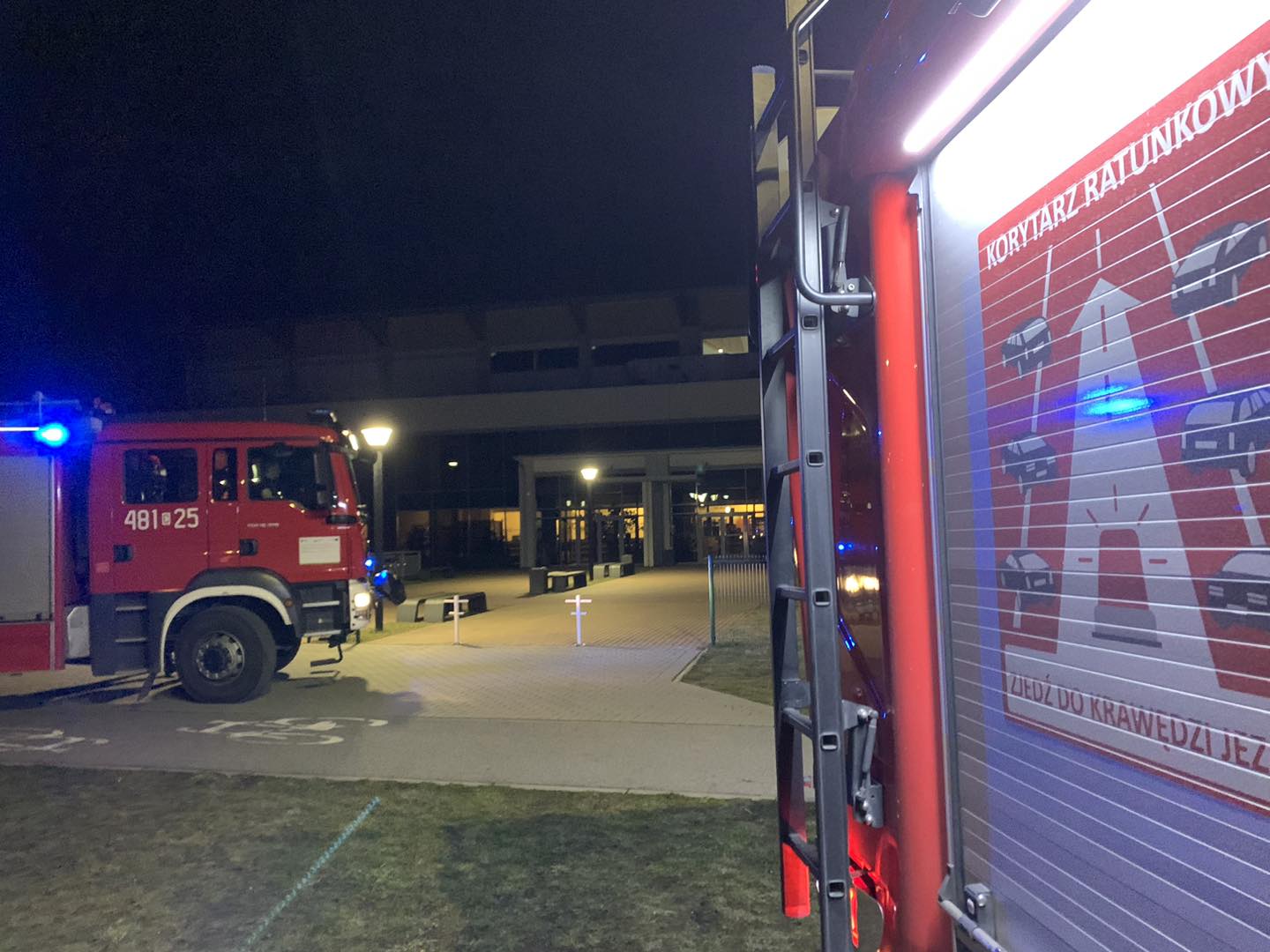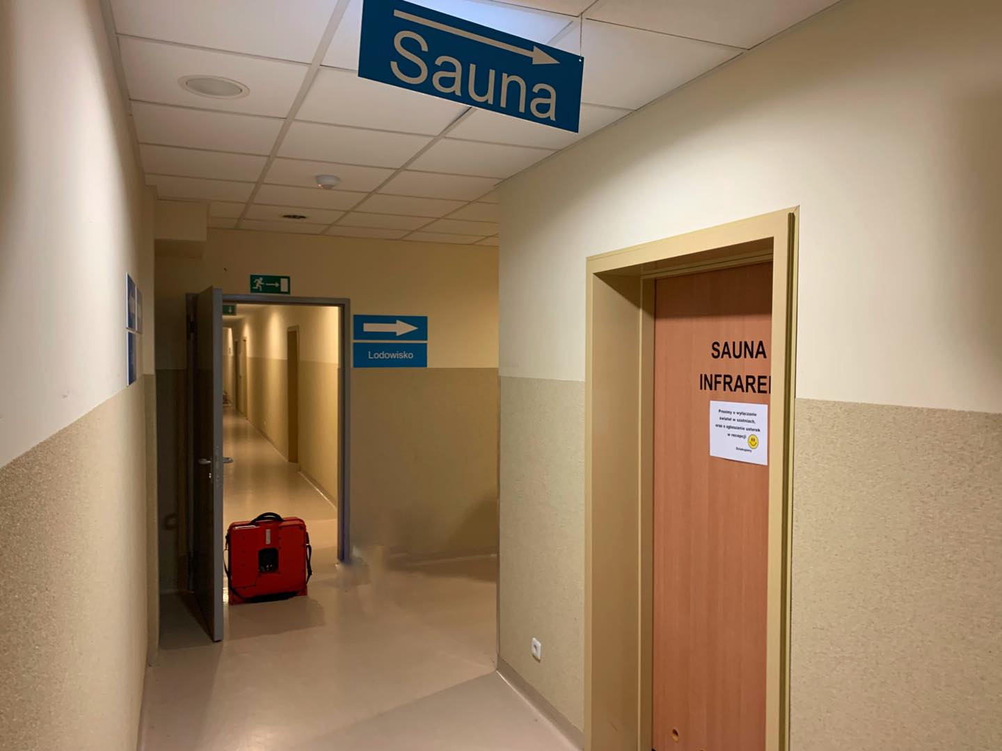 Po przybyciu na miejsce zdarzenia zastano zadymienie w korytarzach oraz działającą instalację alarmową informującą o powstaniu pożaru. W trakcie rozpoznania ustalono, że doszło do zapalenia drewnianych elementów wyposażenia sauny. Palące się elementy zostały wyniesione z pomieszczenia sauny przez funkcjonariusza naszej komendy st. asp. Michała Drobyszewskiego, który przebywał w tym czasie na terenie obiektu w celach rekreacyjnych.