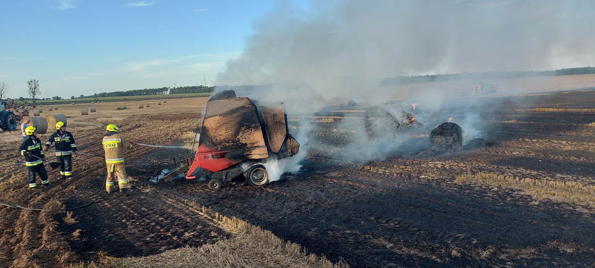 Następne zgłoszenie o godz. 18:37 dotyczyło pożaru prasy do balotów oraz pożaru ścierniska. Działania strażaków polegały na zabezpieczeniu miejsca zdarzenia, podaniu czterech prądów wody w na ściernisko objęte pożarem w celu zatrzymania rozprzestrzeniania się ognia oraz jednego prądu wody w natarciu na palącą się prasę do słomy.