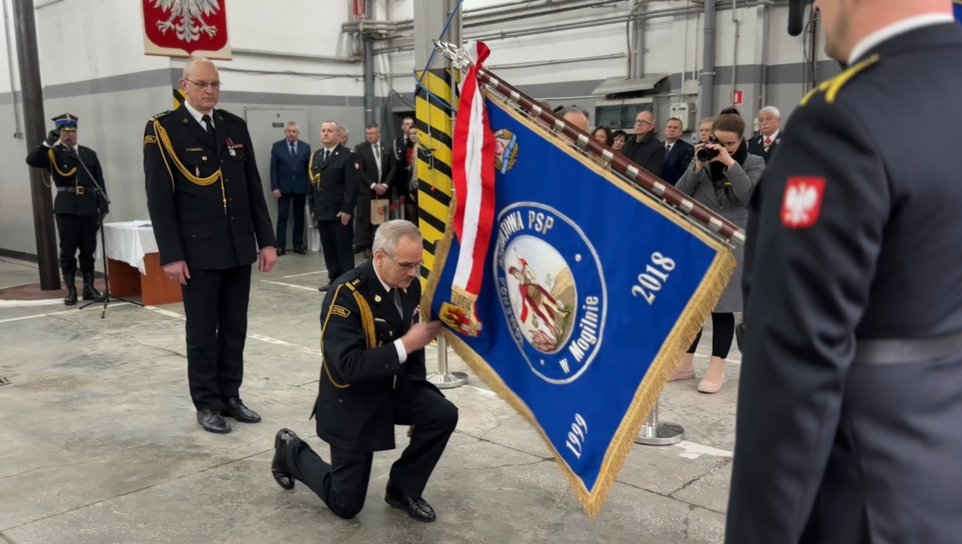 Po odczytaniu decyzji p.o. Kujawsko-Pomorskiego komendanta wojewódzkiego PSP o odwołaniu z funkcji komendanta powiatowego PSP w Mogilnie nastąpiło uroczyste pożegnanie ze sztandarem Komendy Powiatowej PSP w Mogilnie oraz powierzenie pełnienia obowiązków komendanta powiatowego mł. bryg. Łukaszowi Szulc.