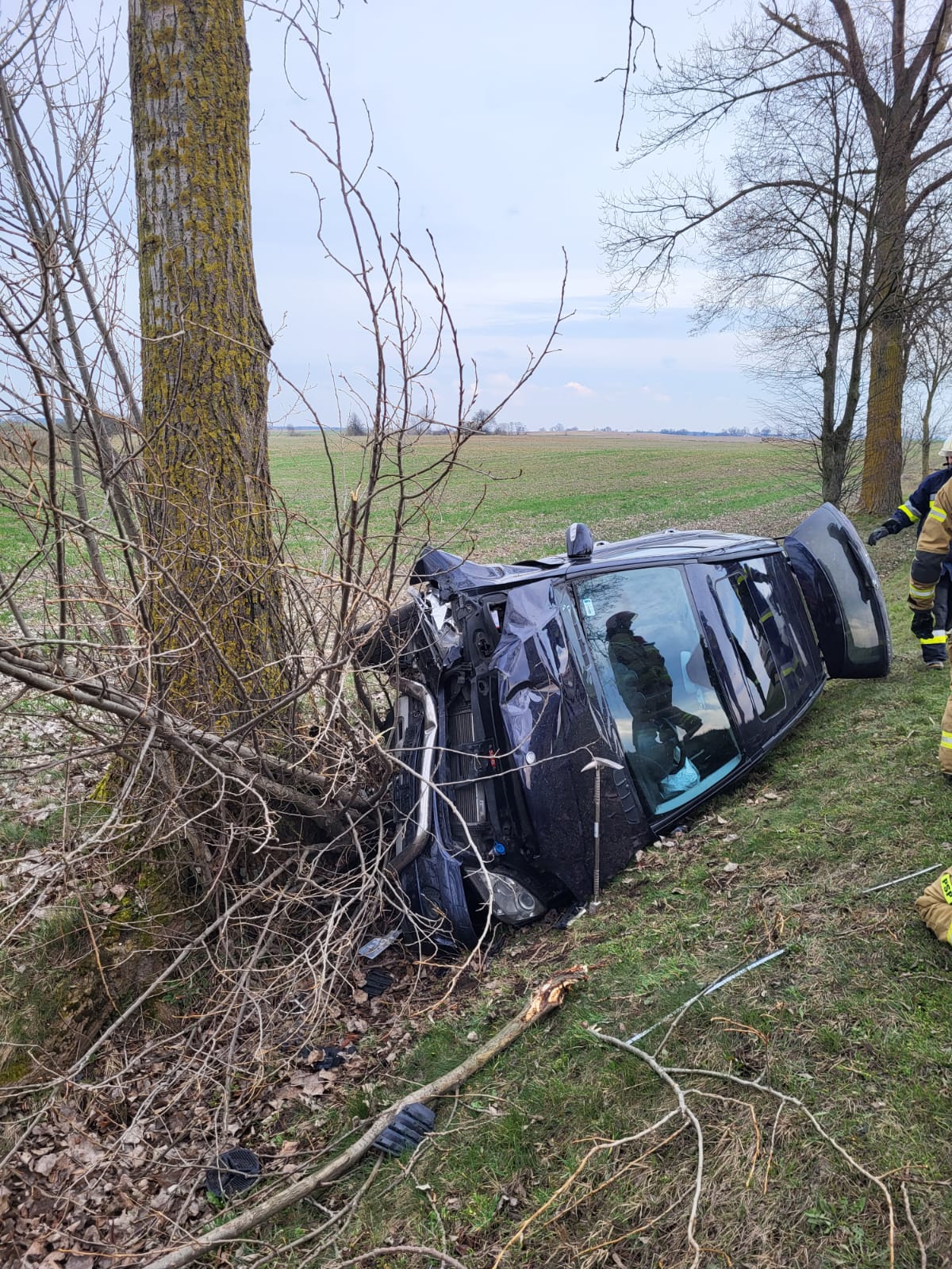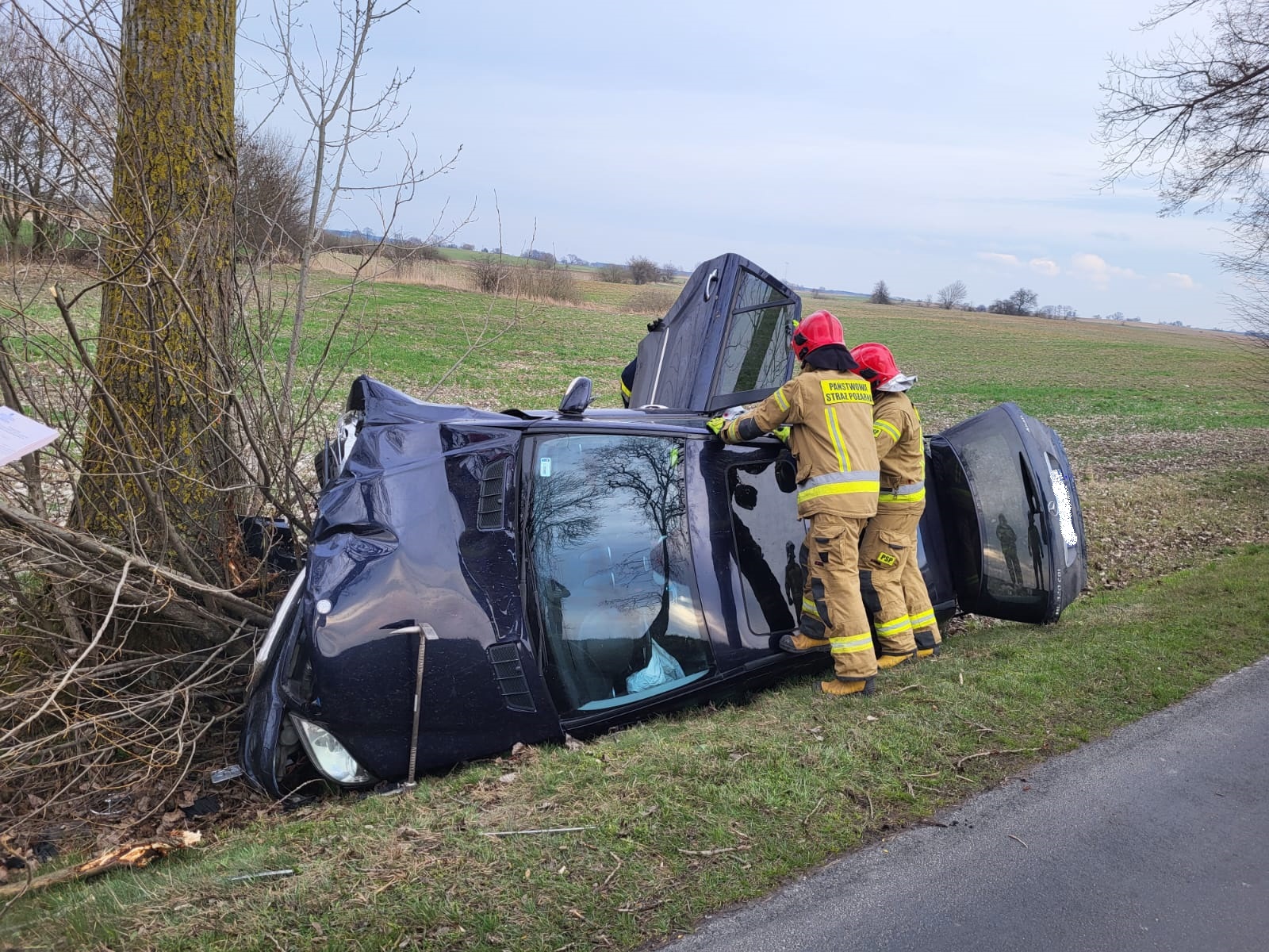 Po przybyciu na miejsce zdarzenia zastano samochód osobowy Mercedes leżący na lewym boku w przydrożnym rowie. Kierujący pojazdem znajdował się w pojeździe świadków, którzy najechali na zdarzenie. Kierowca nie zgłaszał żadnych dolegliwości, pod wpływem zdarzenia był mocno zdezorientowany.