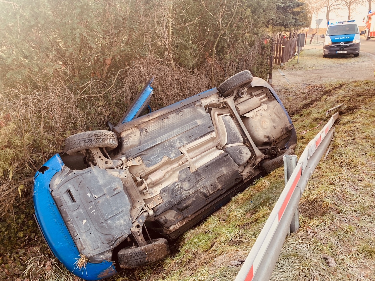 Po przybyciu na miejsce zdarzenia zastano samochód osobowy, który leżał na boku w przydrożnym rowie. Samochodem podróżowała jedna osoba. Kobieta (bez widocznych obrażeń) opuściła pojazd o własnych siłach.