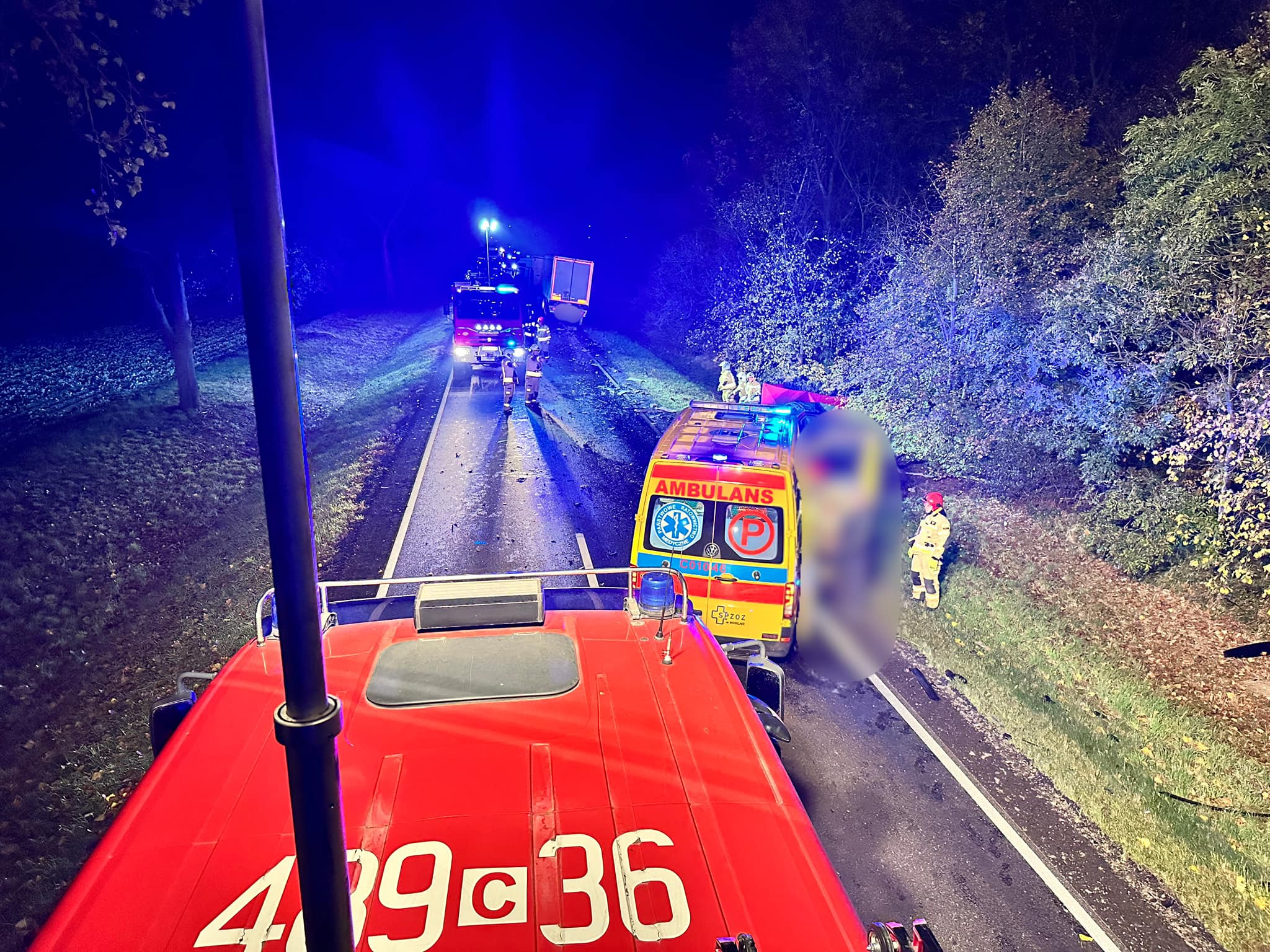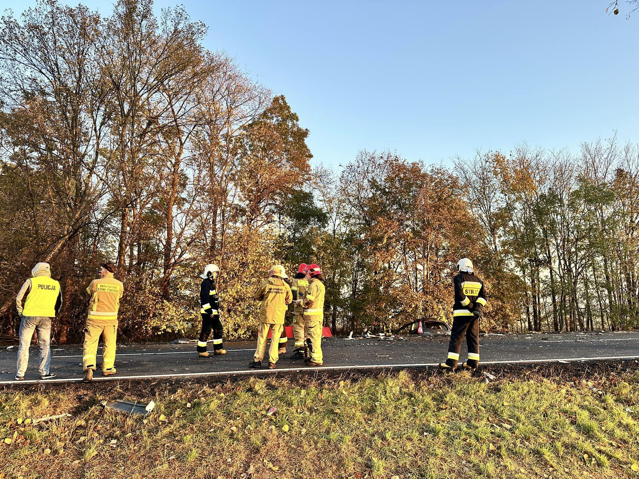 Po przybyciu na miejsce zdarzenia zastano samochód ciężarowy po uprzednim zderzeniu z samochodem osobowym. Pierwszy pojazd znajdował się na pasie ruchu oraz poboczu, natomiast samochód osobowy w przydrożnym rowie. Droga była całkowicie zablokowana.