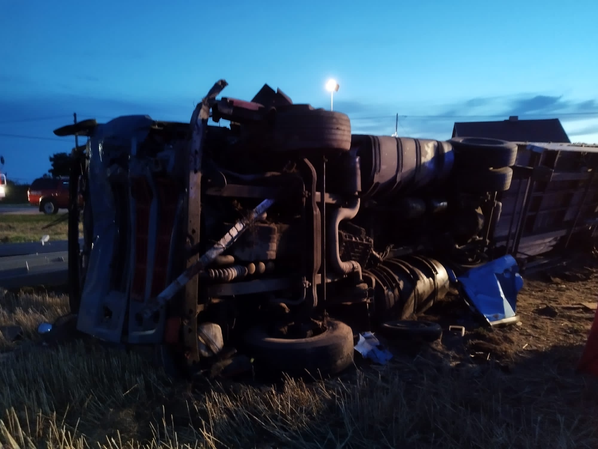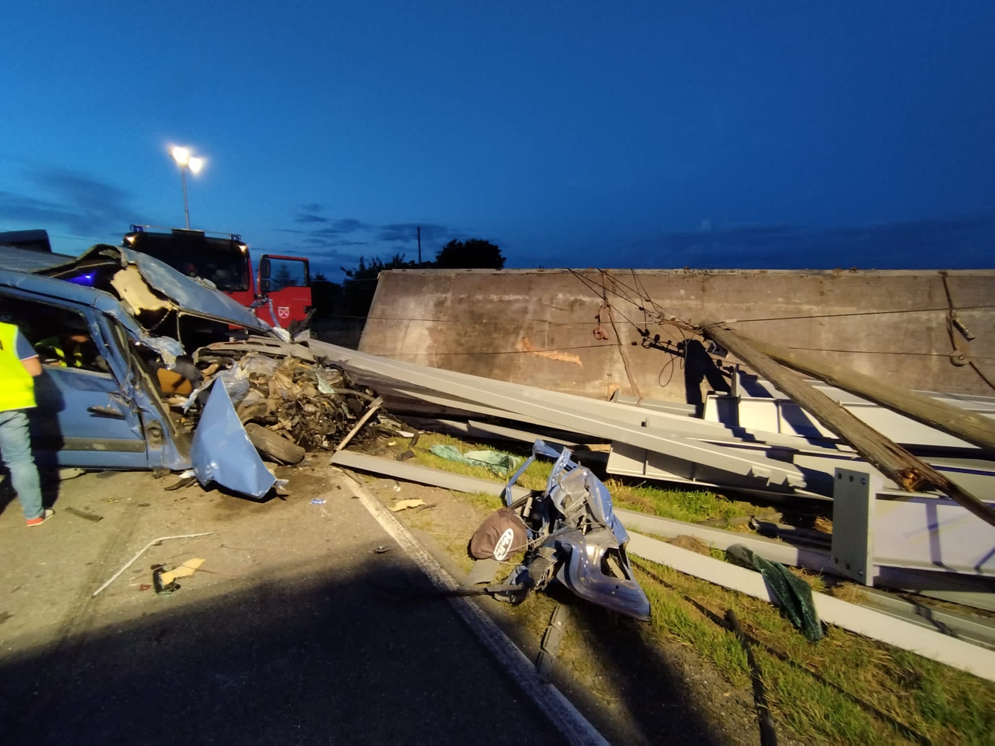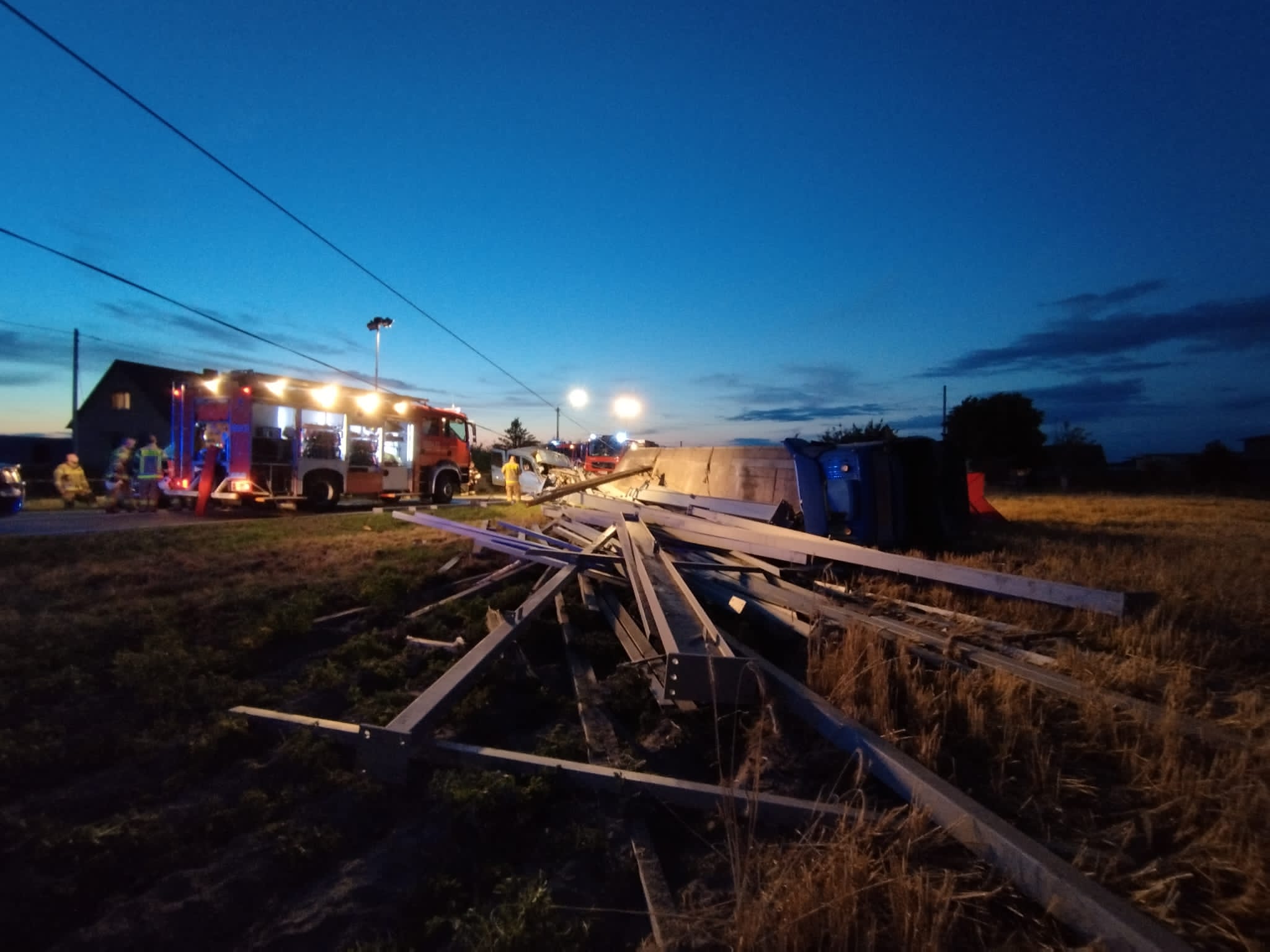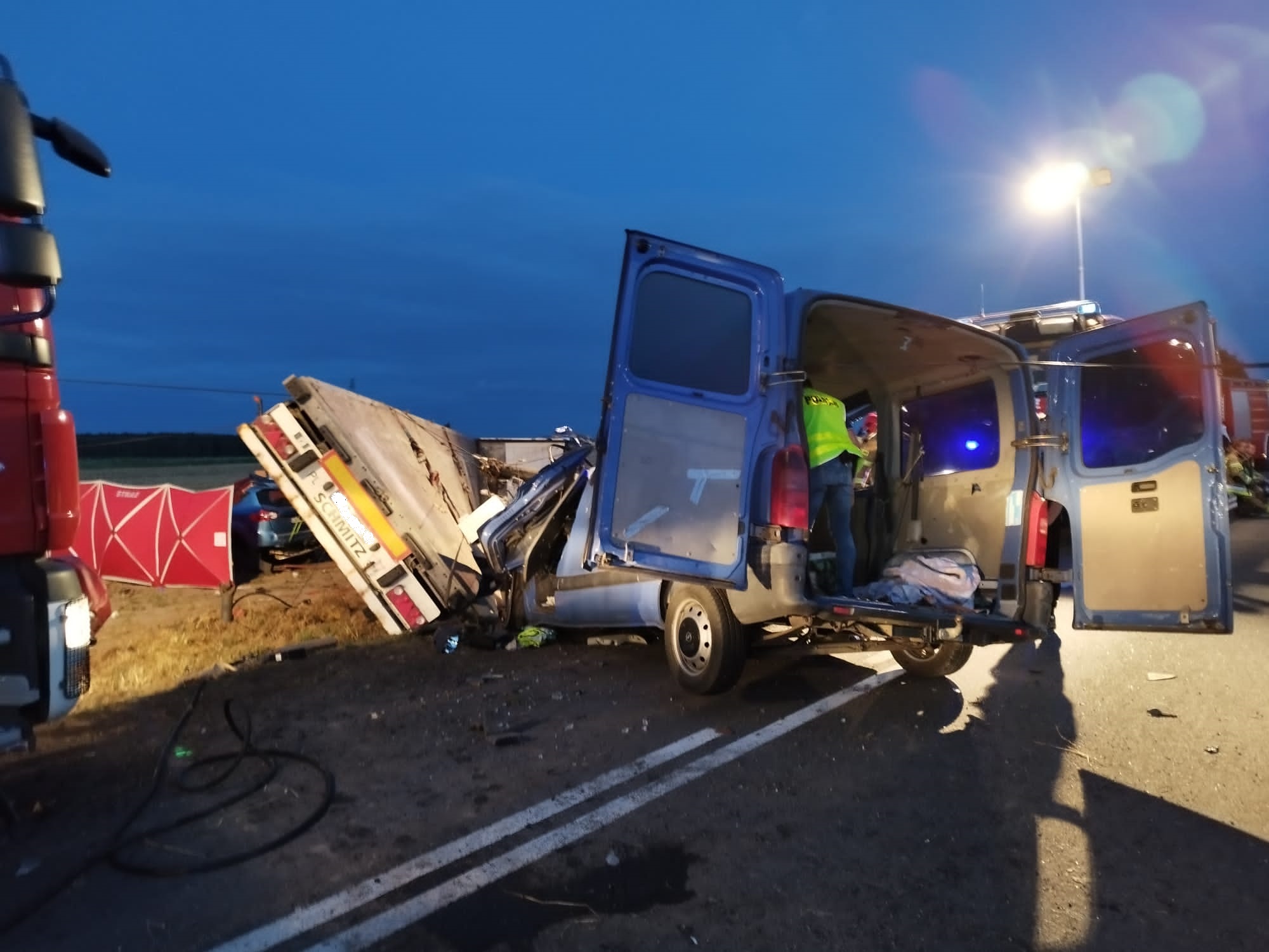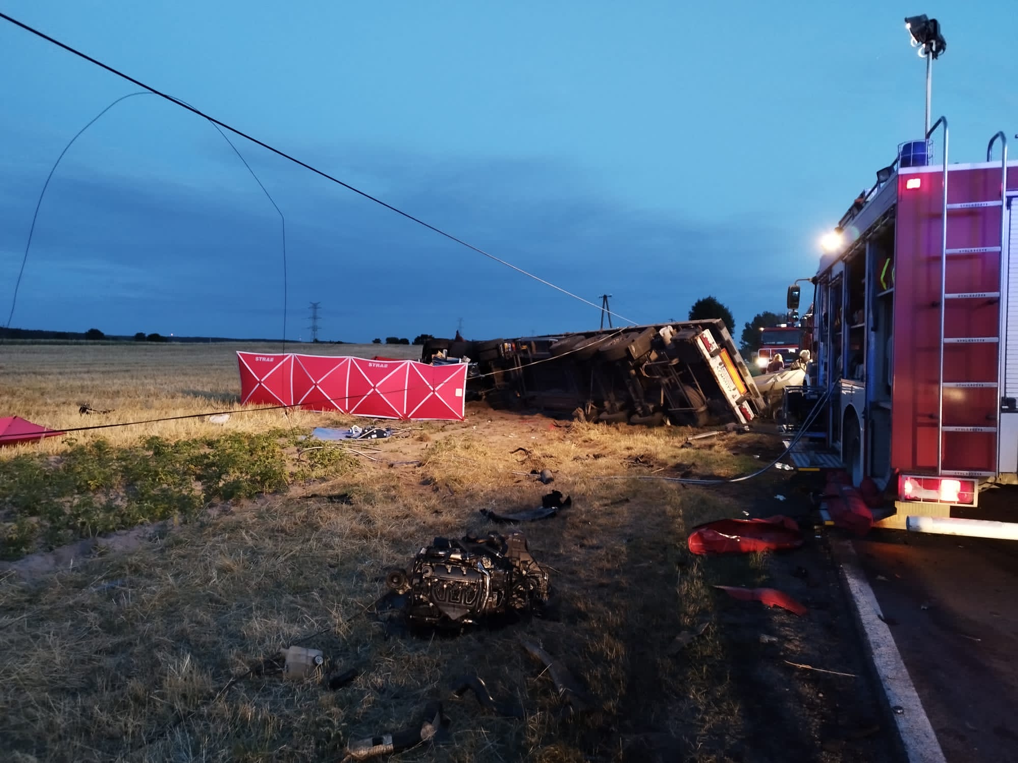 Po przybyciu na miejsce zdarzenia zastano rozbity samochód osobowy około 30m od drogi na pobliskim polu, wewnątrz pojazdu znajdowały się uwięzione 3 osoby. Na miejscu znajdował się także rozbity leżący na boku ciągnik siodłowy z naczepą transportującą elementy stalowe. Kierowca ciągnika siodłowego znajdował się poza pojazdem z urazem kończyny górnej. W zdarzeniu brał udział również bus dostawczy, który znajdował się na jednym pasie ruchu blokując go. Wewnątrz pojazdu znajdowały się uwięzione dwie osoby z urazami kończyn dolnych.