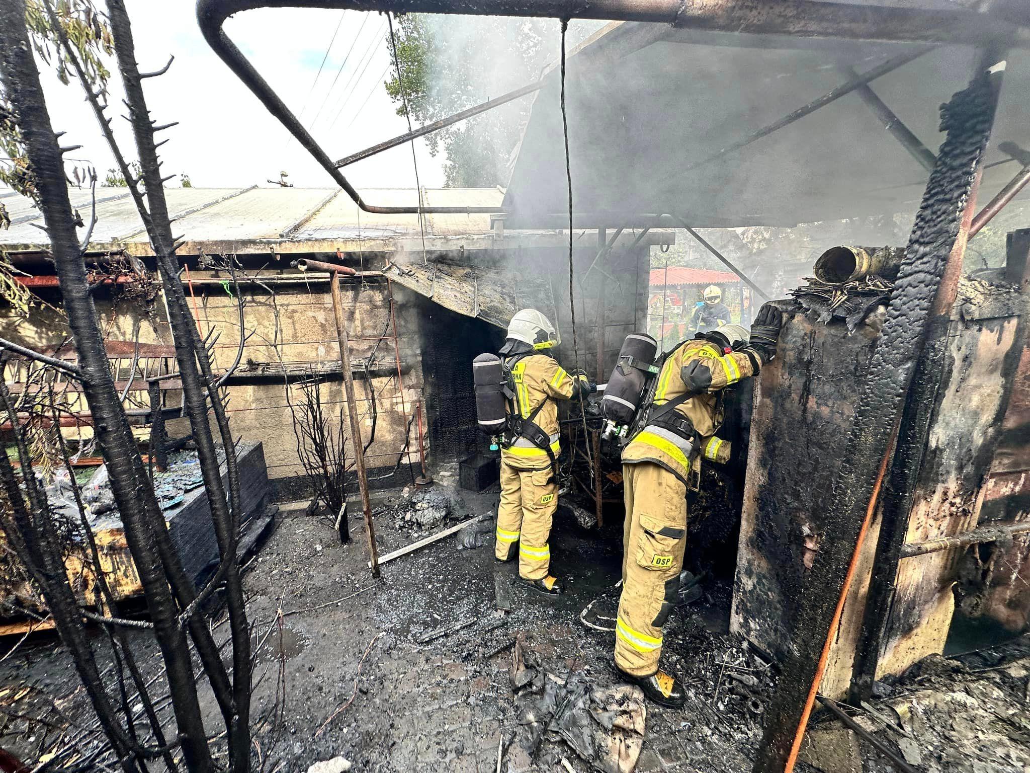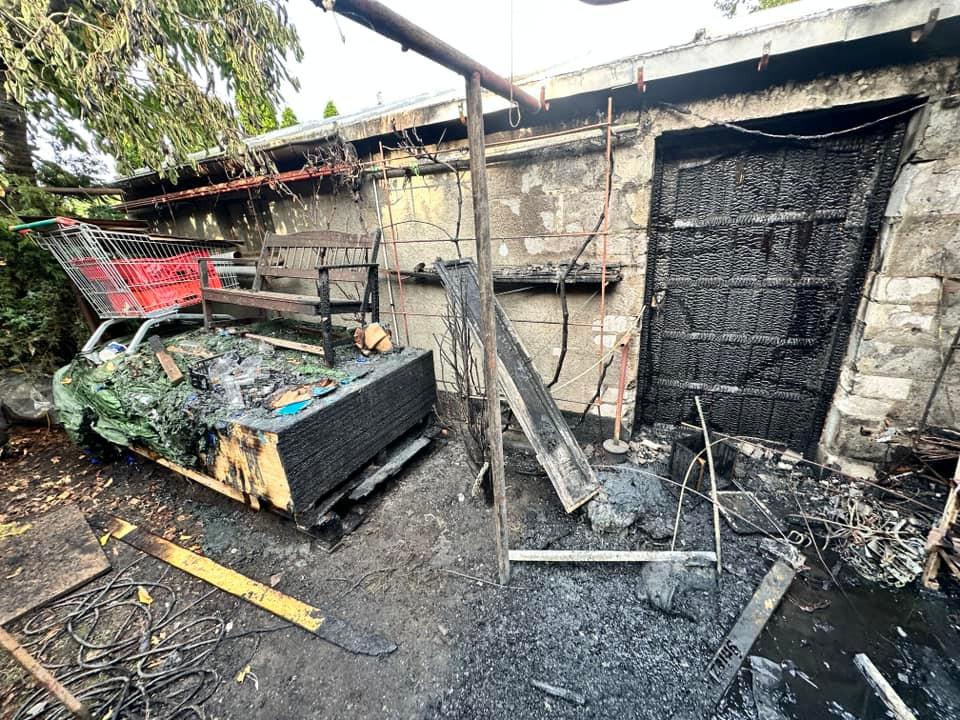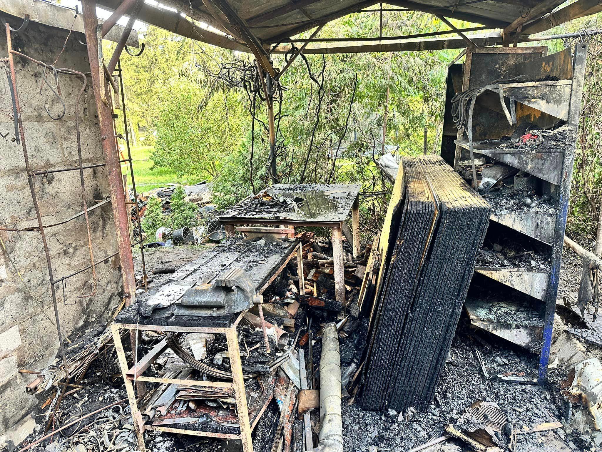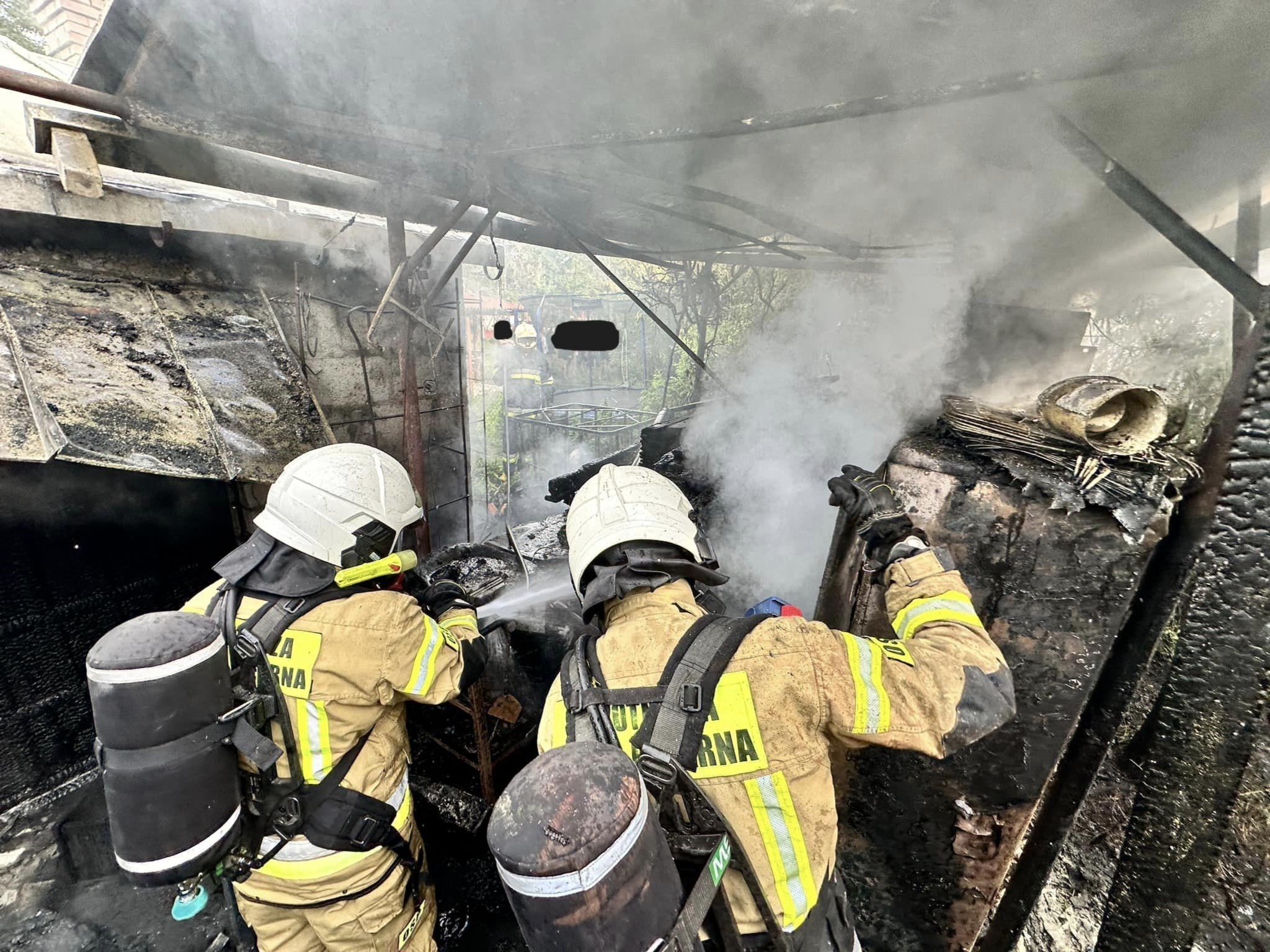 Drugie zdarzenie dotyczyło pożaru wiaty oraz przydomowego garażu. Po przybyciu na miejsce zdarzenia zastano, dwóch mężczyzn gaszących z węży ogrodowych palącą się wiatę (która znajdowała się blisko budynku mieszkalnego) z płytami OSB, drewem opałowym oraz elektronarzędziami i sprzętem domowym. Właściciel posesji, który próbował ugasić pożar uskarżał się na poparzenia. Przed przyjazdem JOP właściciel odłączył zasilanie elektryczne od wiaty i garażu.