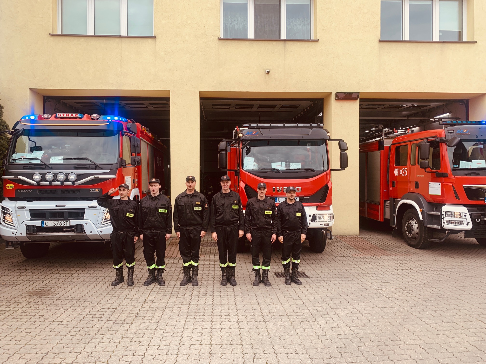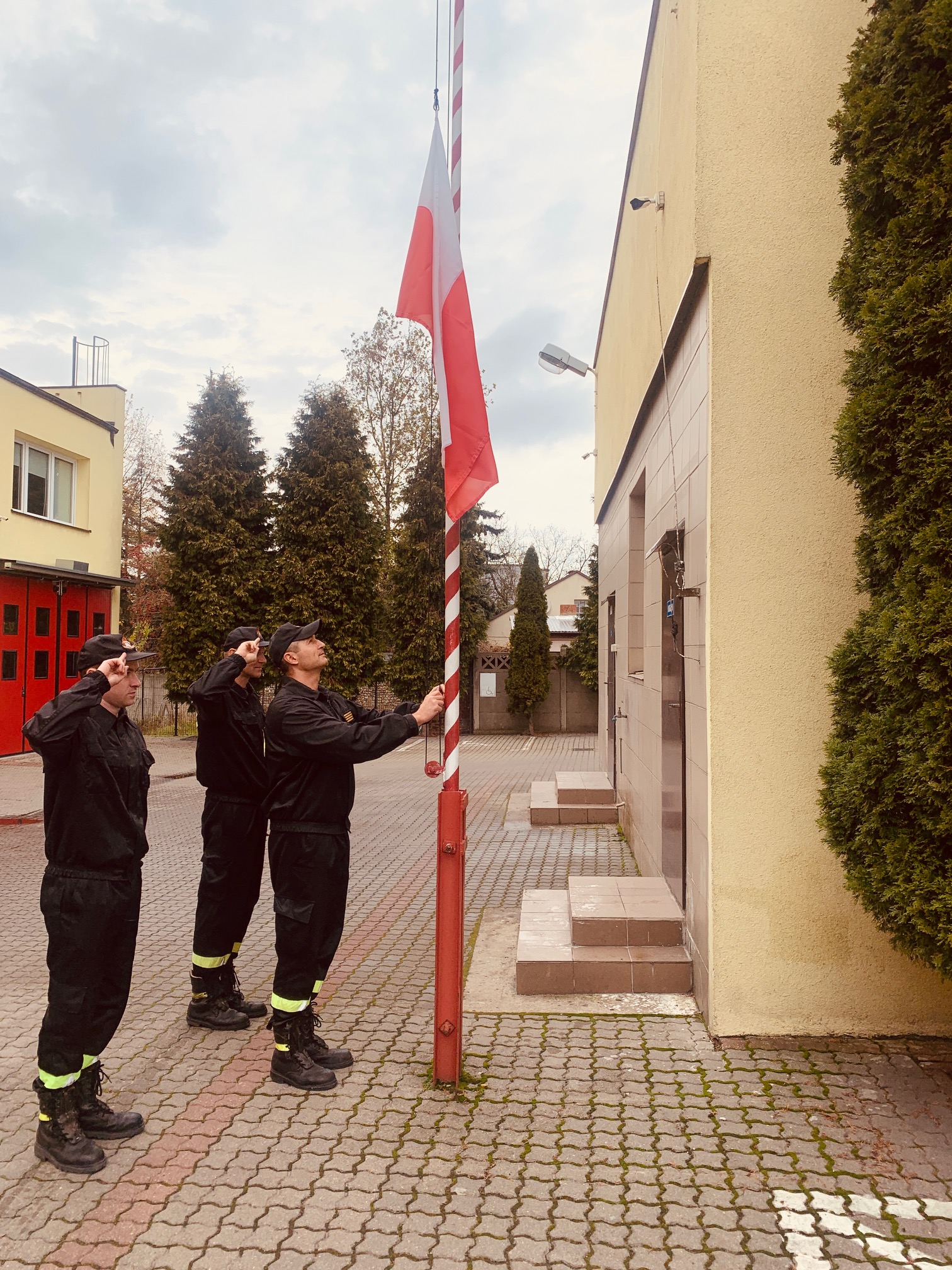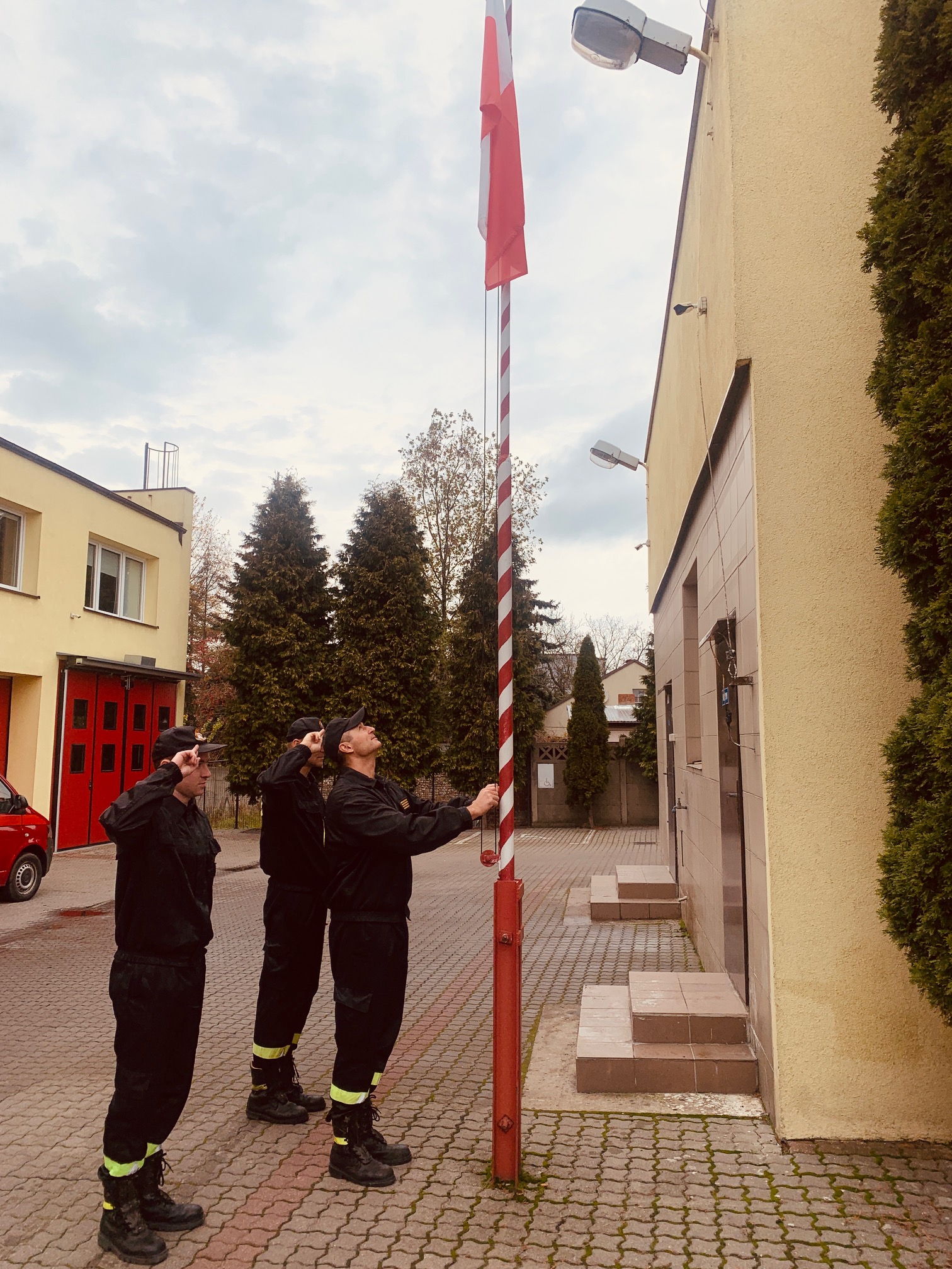 Strażacy zmiany służbowej JRG Mogilno dokonali uroczystego wciągnięcia flagi państwowej na maszt a także odśpiewali Mazurka Dąbrowskiego.