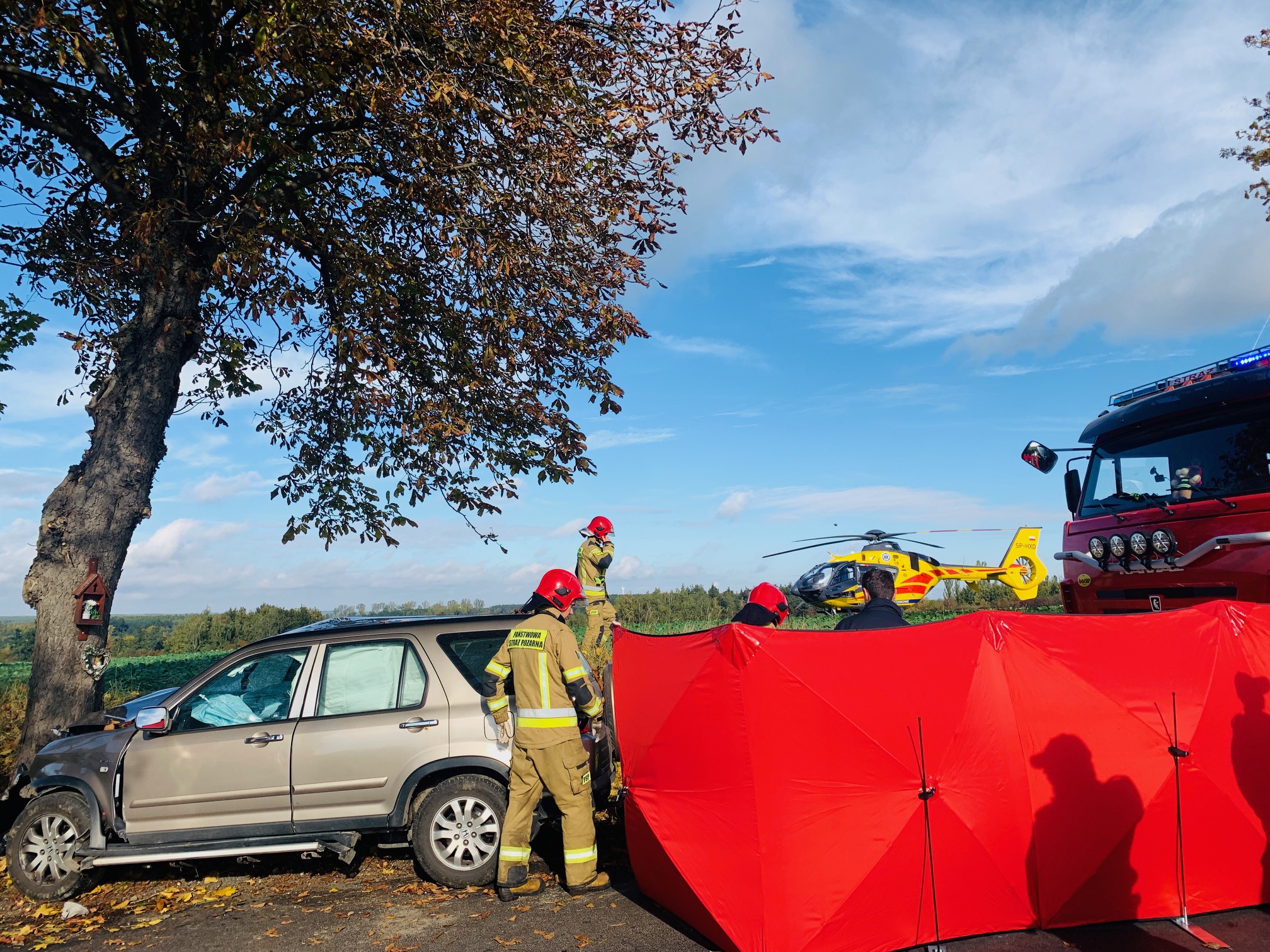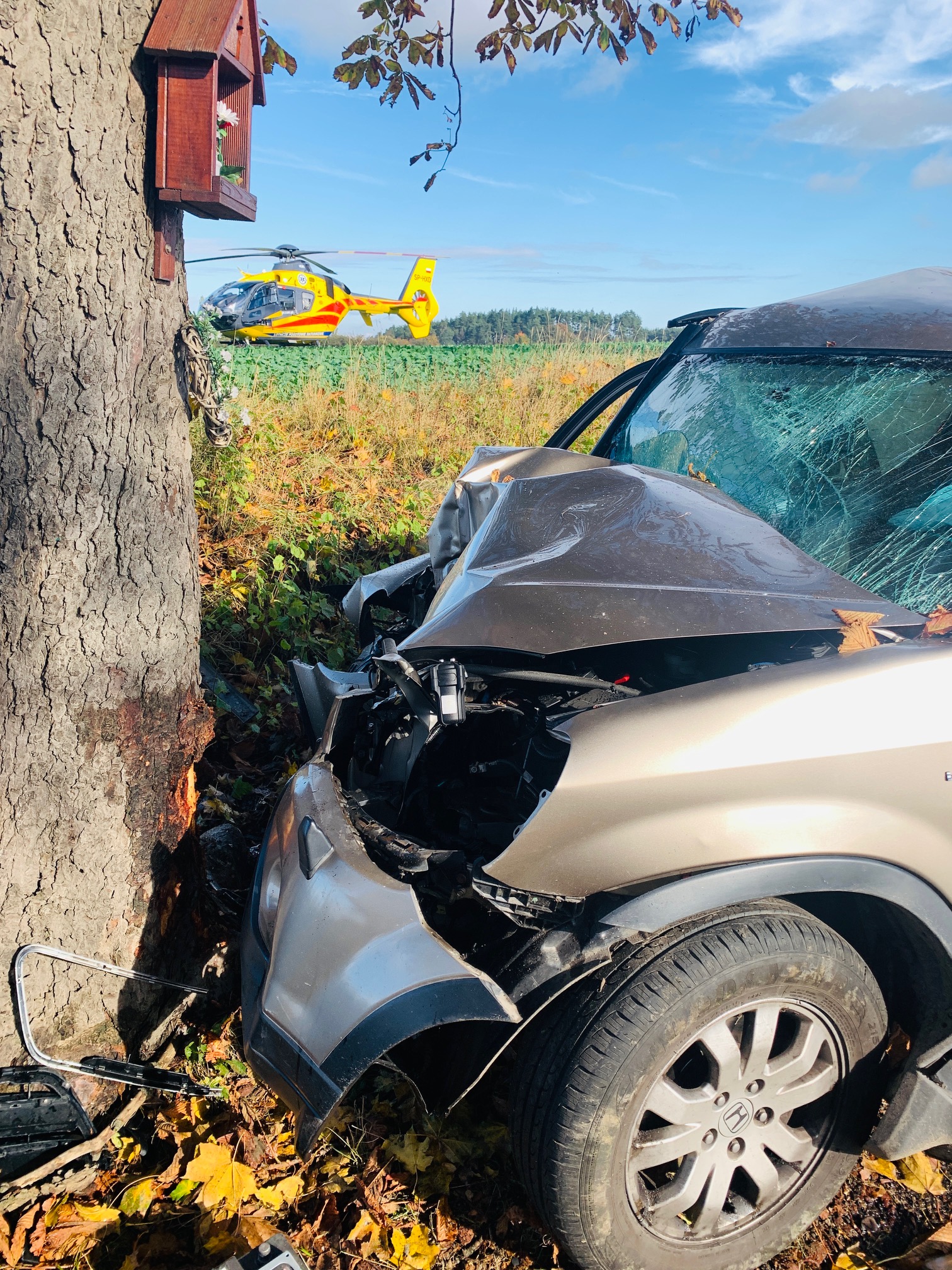 Po przybyciu na miejsce zdarzenia zastano rozbity samochód osobowy na poboczu drogi po czołowym uderzeniu w drzewo. Wewnątrz pojazdu znajdował się kierowca bez wyczuwalnych funkcji życiowych. Droga zablokowana.