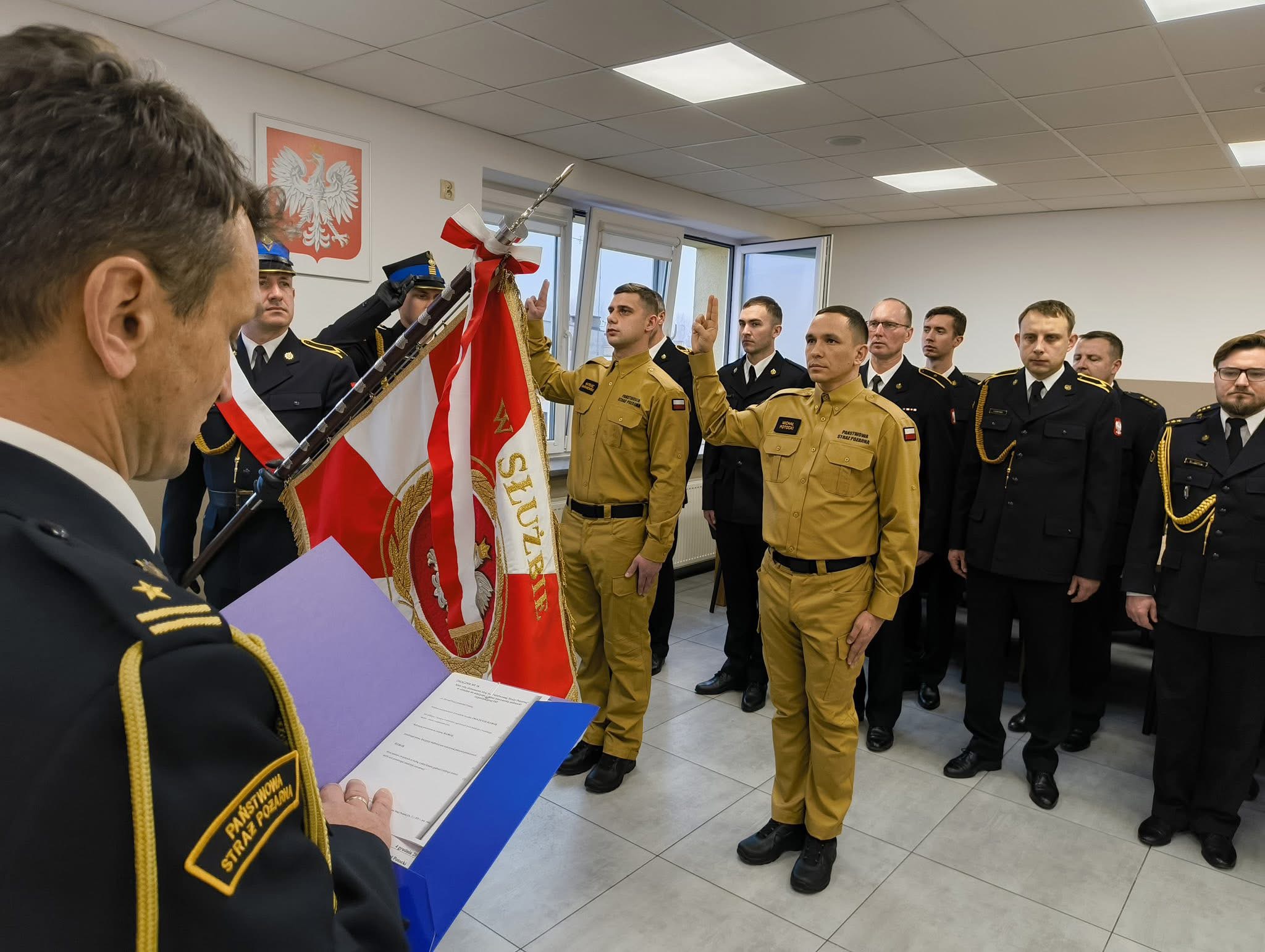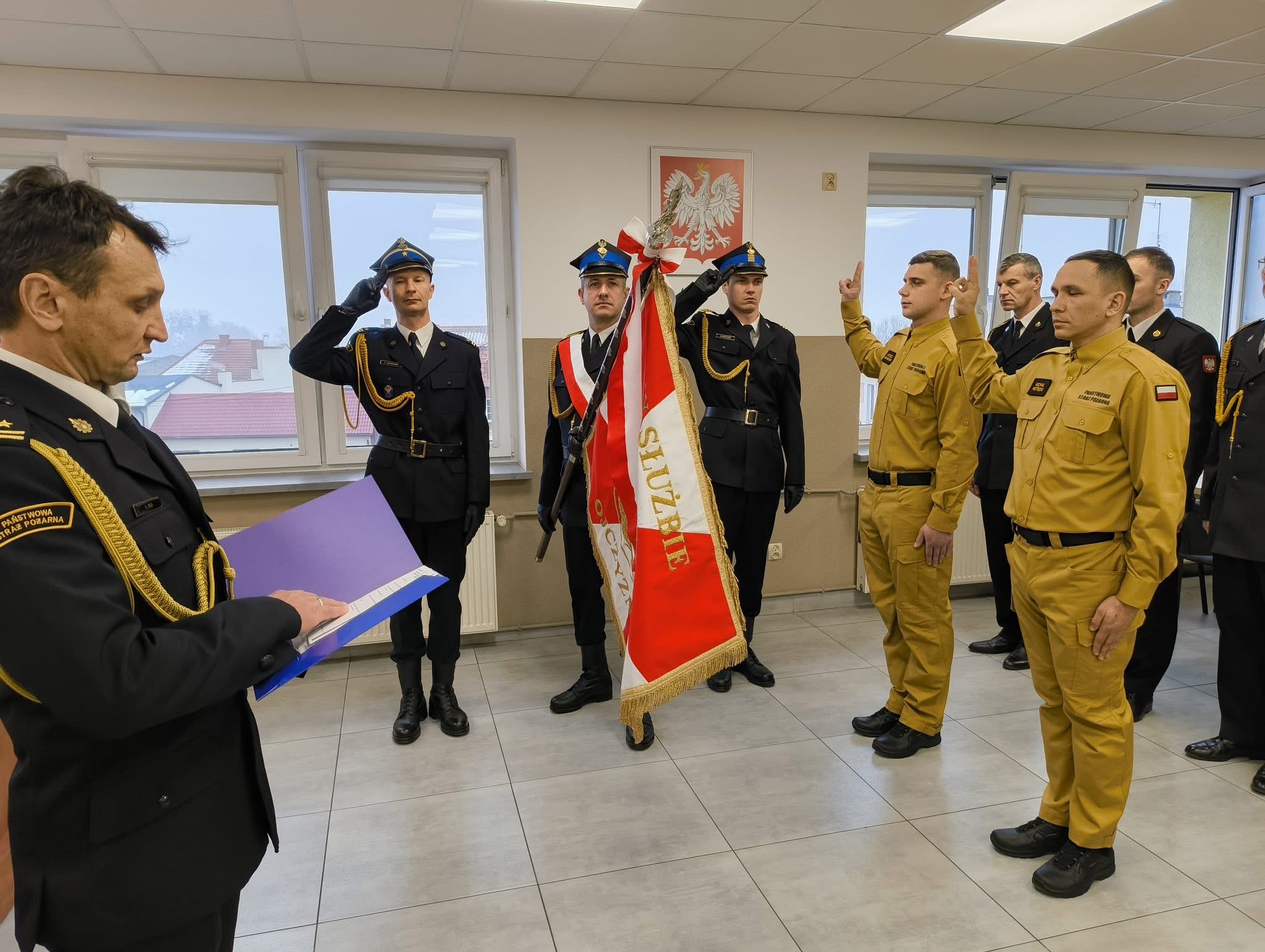 Nowo przyjęci funkcjonariusze wypowiedzieli słowa roty ślubowania strażaka PSP: