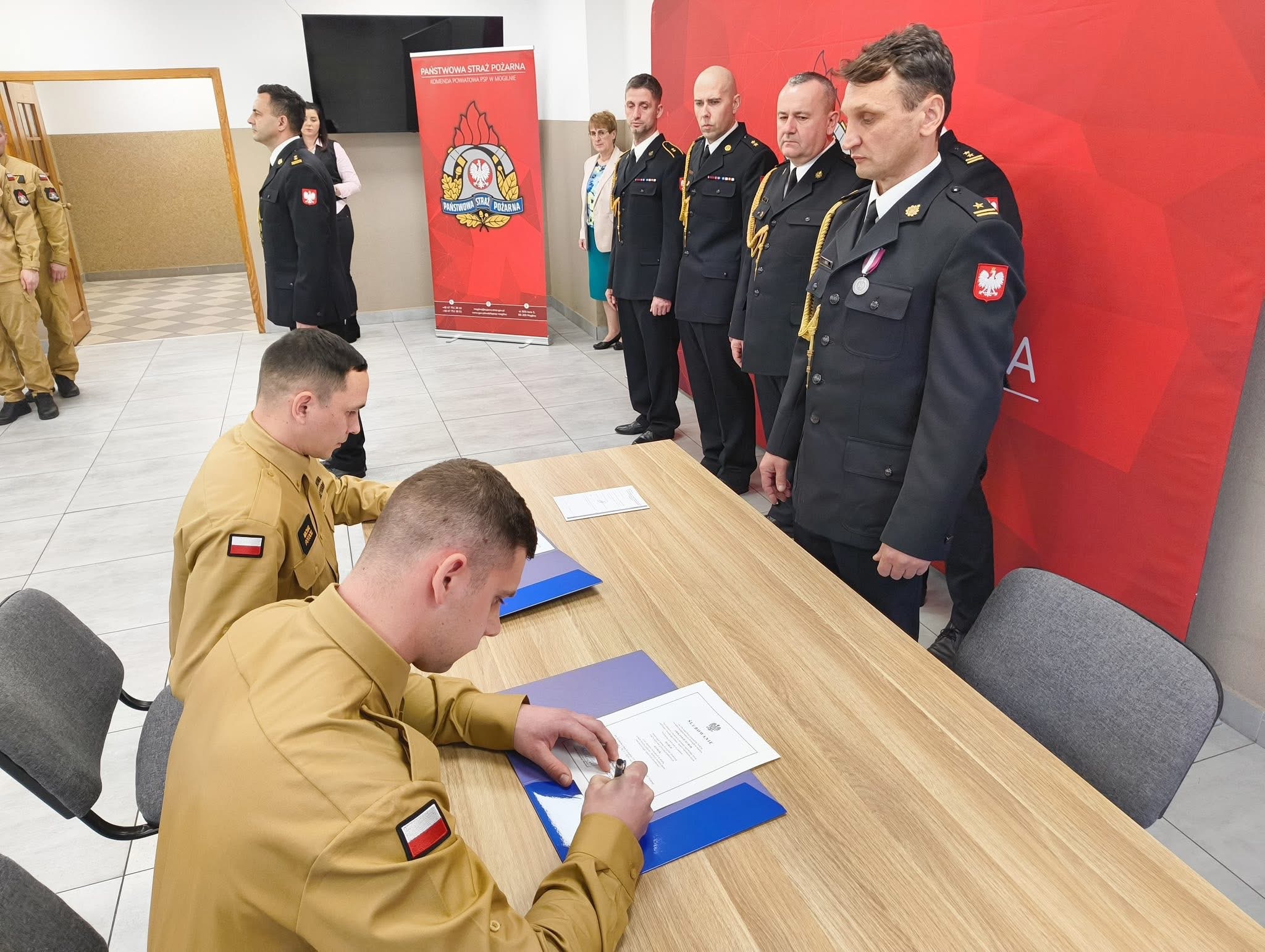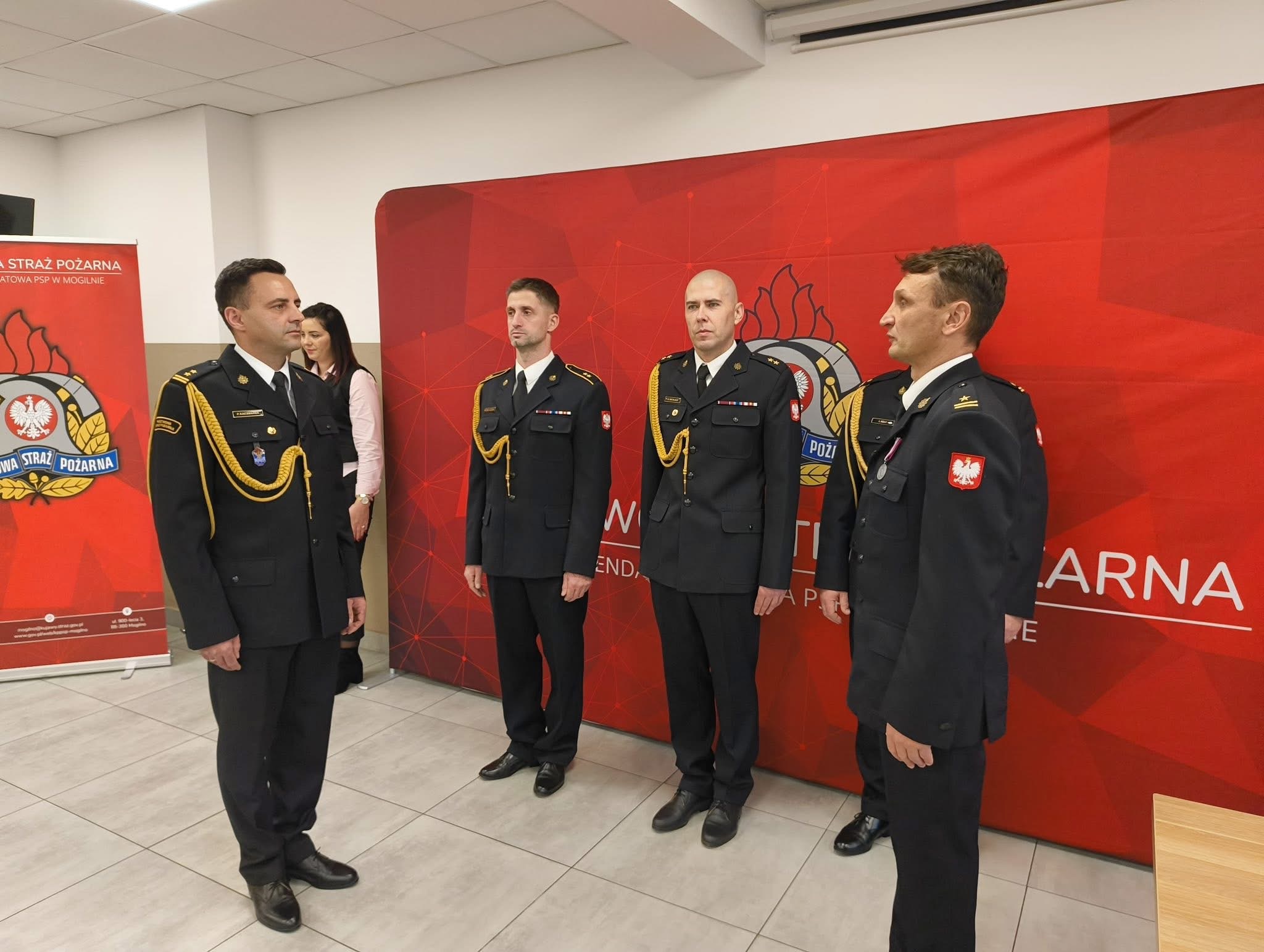 Szczególnym momentem uroczystości było złożenie ślubowania przez dwóch nowych funkcjonariuszy: str. Mateusza Baranowskiego oraz str. Michała Potockiego. Ślubowanie przyjął Komendant Powiatowy PSP w Mogilnie, mł. bryg. Krzysztof Bąk, w obecności swojego zastępcy – bryg. Łukasza Rogalskiego, Dowódcy JRG Mogilno mł. bryg. Łukasza Szulc, oraz funkcjonariuszy i pracowników cywilnych KP PSP Mogilno, podkreślając znaczenie odpowiedzialnej i wymagającej służby, jaką podejmują strażacy.