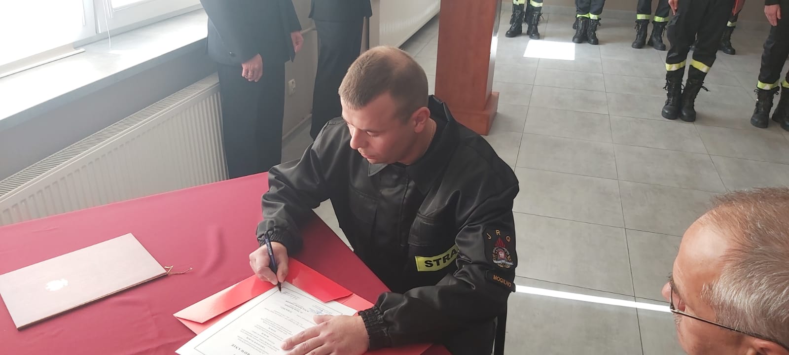 Tego dnia w Komendzie Powiatowej Państwowej Straży Pożarnej w Mogilnie odbył się uroczysty apel z okazji ślubowania strażaków przyjętych do służby przygotowawczej w Państwowej Straży Pożarnej.