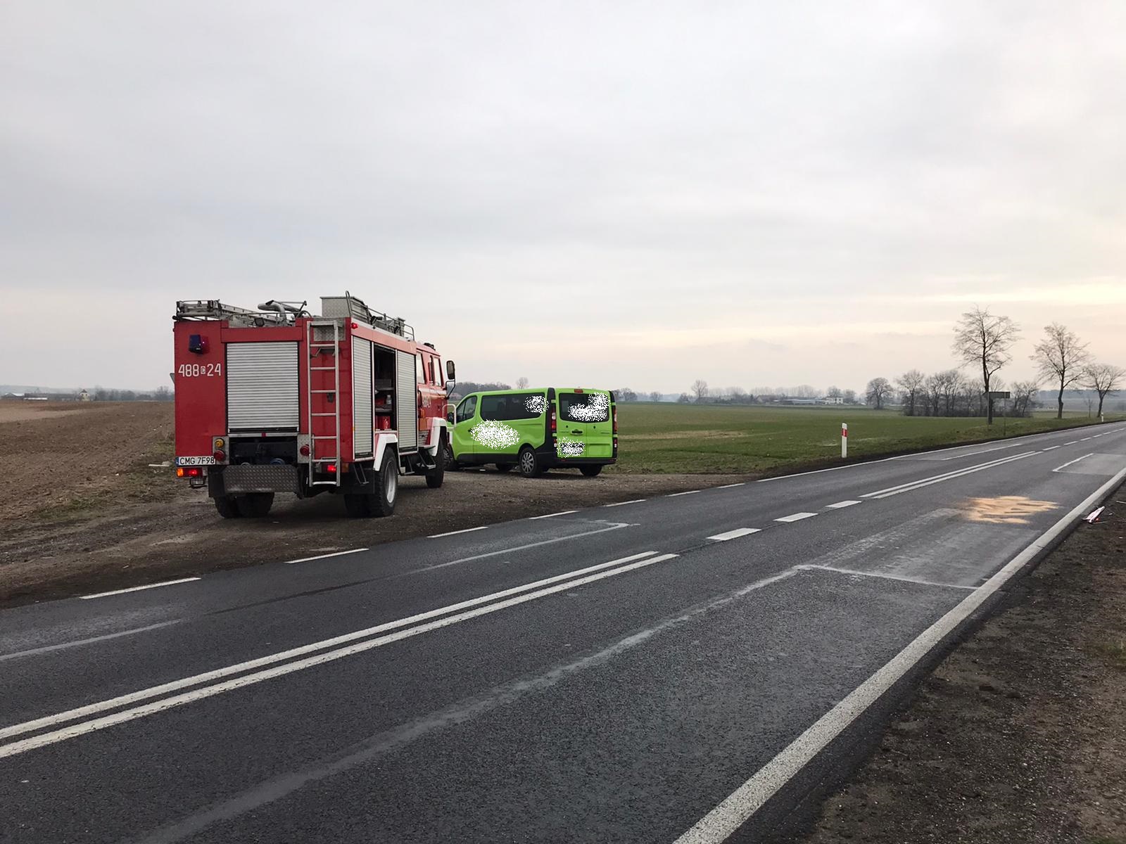 Po przybyciu na miejsce zdarzenia zastano dwa samochody po wcześniejszej kolizji (osobowa Toyota i bus – Renault). Plama olejowa na jezdni DK15 po kolizji na powierzchni kilku metrów kwadratowych. Policja na miejscu. Osoby podróżujące poza pojazdami bez obrażeń.