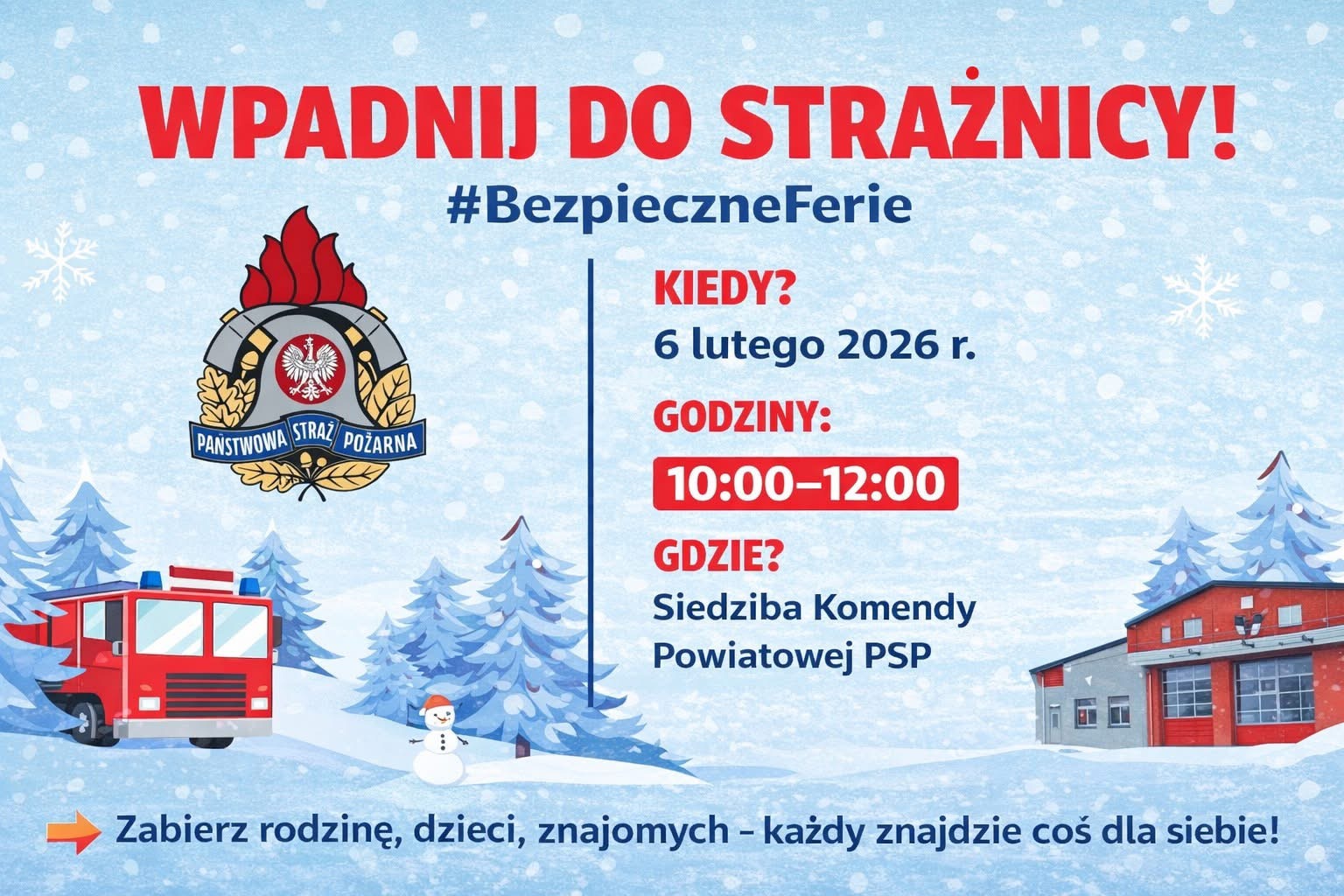 Podczas tegorocznych ferii zimowych w naszym regionie zapraszamy wszystkich małych i dużych miłośników straży pożarnej na wyjątkowe wydarzenie „Wpadnij do strażnicy”!