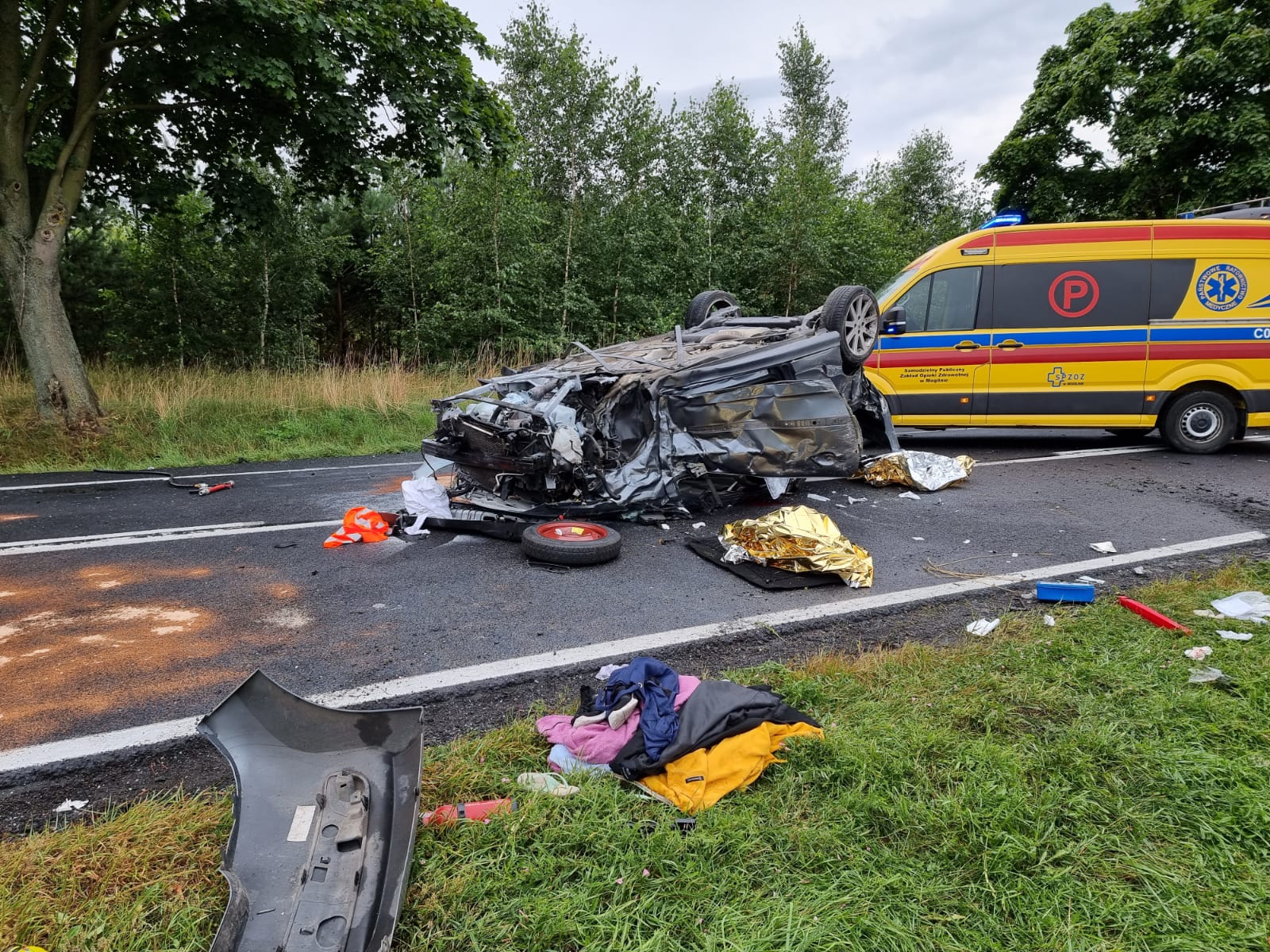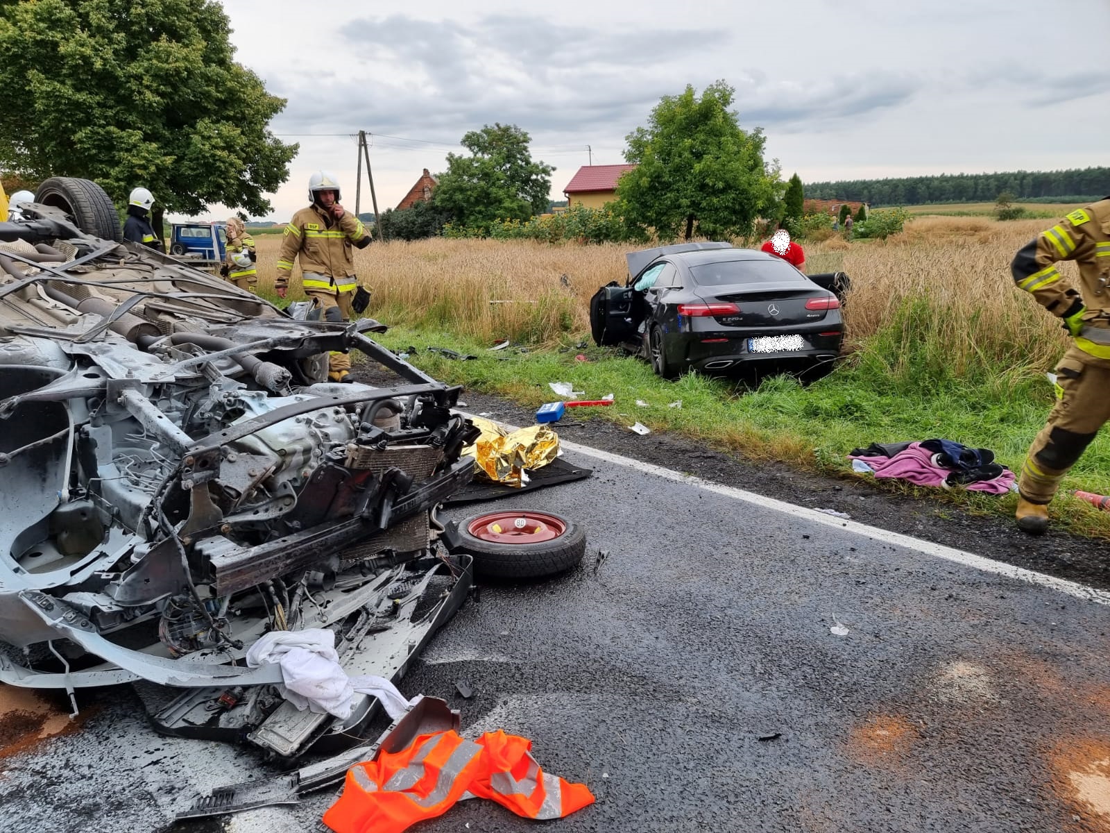 Po przybyciu na miejsce zdarzenia zastano trzy pojazdy po wcześniejszym zderzeniu. Podróżujące osoby znajdowały się poza pojazdami. Jeden z pojazdów - Peugeot, którym podróżowały trzy najciężej ranne osoby znajdował się na dachu na środku drogi. Drugi samochód tj. Mercedes E220 znajdował się w polu obok drogi, podróżowały dwie osoby. Trzeci pojazd typu laweta Mercedes 312D, którym podróżowało dwóch mężczyzn (bez obrażeń) znajdował się we wjeździe do prywatnej posesji. Na jezdni rozlane płyny eksploatacyjne po wypadku. DK25 w miejscu wypadku całkowicie zablokowana.