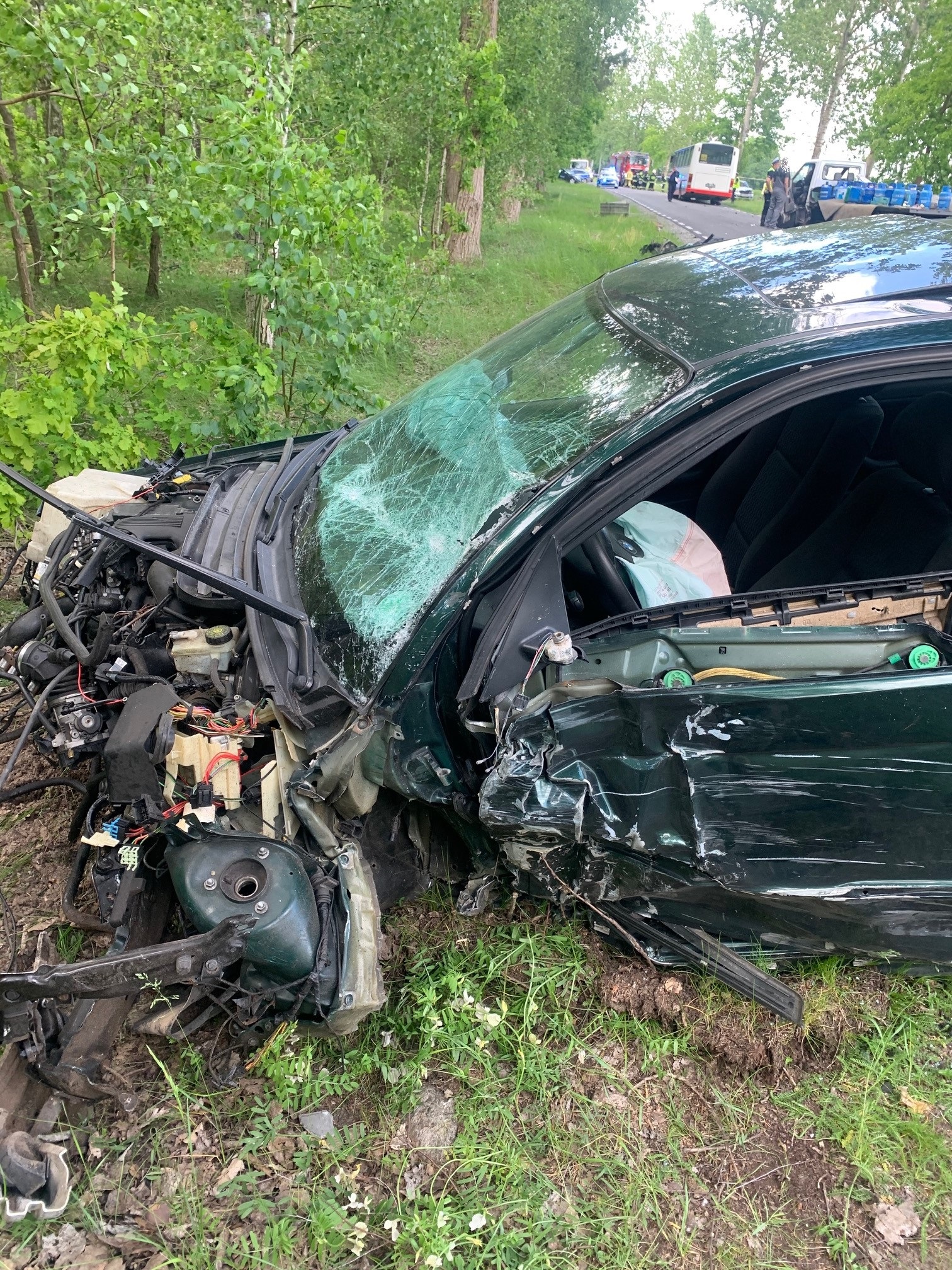 Po przybyciu na miejsce zdarzenia zastano rozbite dwa samochody osobowe na poboczu drogi oraz samochód dostawczy i lekko uszkodzony autobus szkolny, które blokowały jeden pas drogi. Pojazdami osobowymi i dostawczym podróżowali tylko kierowcy. Kierowca Skody znajdował się wewnątrz pojazdu bez możliwości jego opuszczenia. Kierowcy pozostałych pojazdów znajdowali się poza pojazdami. W autobusie podczas zderzenia znajdowało się 8 osób - kierowca, opiekun oraz 6 dzieci (wszyscy podróżujący autobusem nie odnieśli obrażeń). Dzieci zostały przekazane rodzicom. Pojazd dostawczy przewoził 60 szt. butli propan-butan z czego 8-pełnych. Około połowa z przewożonych butli znajdowała się poza pojazdem. Droga całkowicie zablokowana. Na miejscu ZRM.