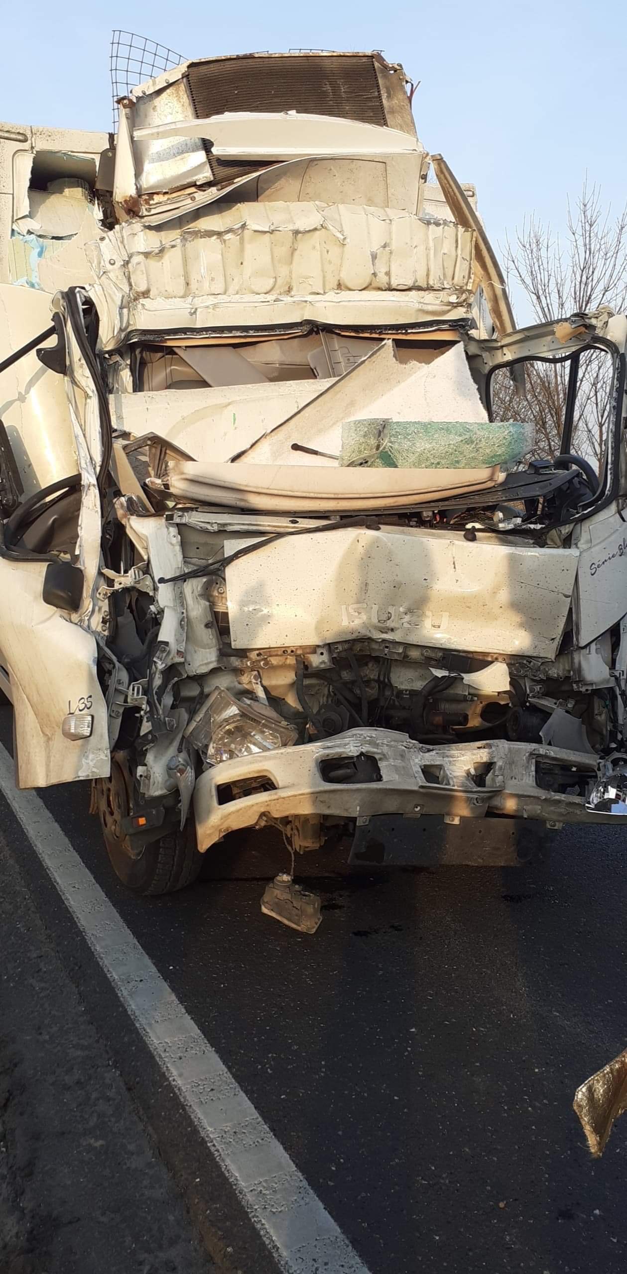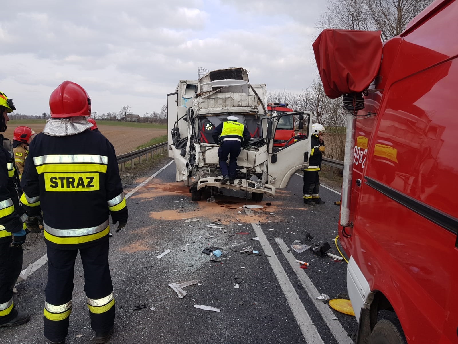 Po przybyciu na miejsce zdarzenia zastano rozbity samochód dostawczy Isuzu, który najechał na tył pustej naczepy samochodu ciężarowego. W samochodzie dostawczym znajdowała się jedna uwięziona osoba (kierowca)- przytomna, kontaktowa. Drugim pojazdem podróżowała jedna osoba, uskarżająca się na ból pleców. Droga całkowicie zablokowana. Policja na miejscu.