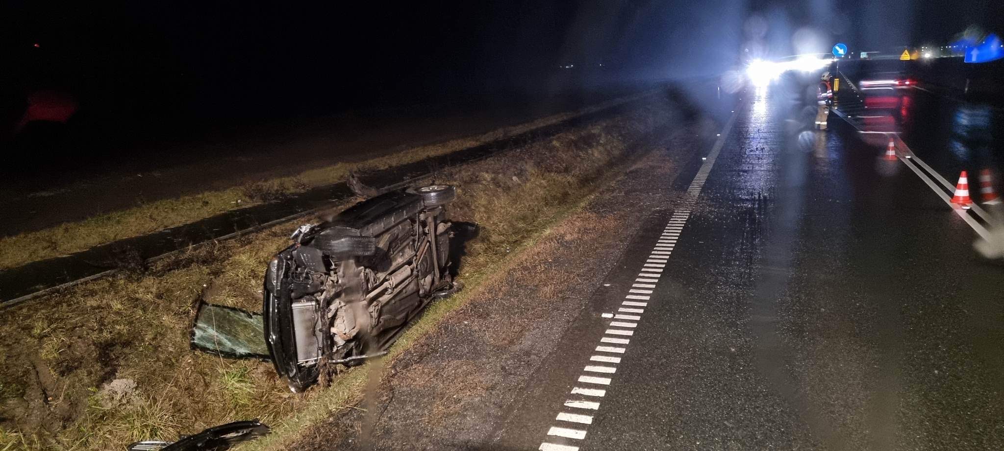 Po przybyciu na miejsce zdarzenia zastano samochód osobowy marki Opel leżący na prawym boku w przydrożnym rowie. Podróżujące osoby pod opieką ZRM. Policja na miejscu.