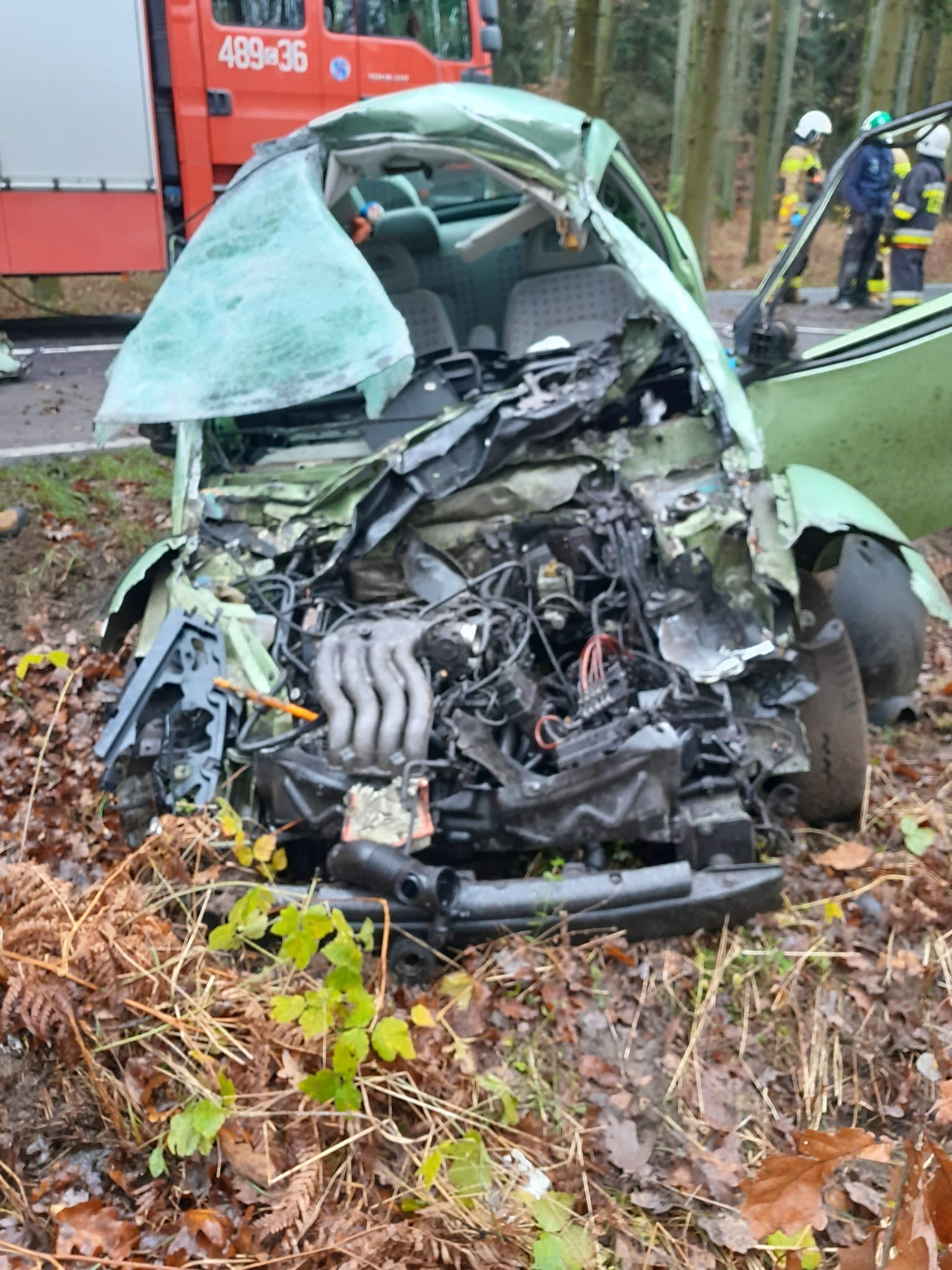 Po przybyciu na miejsce zdarzenia zastano dwa samochody (VW Beetle oraz Renault Master) po zderzeniu. Samochodem VW podróżowała sama kobieta, która znajdowała się wewnątrz pojazdu. Drugi samochód stał w odległości około 60 metrów. Samochodem podróżował sam mężczyzna, który znajdował się poza pojazdem, bez obrażeń. Samochody stały na kołach ale ślady wskazywały na wcześniejsze dachowanie.
