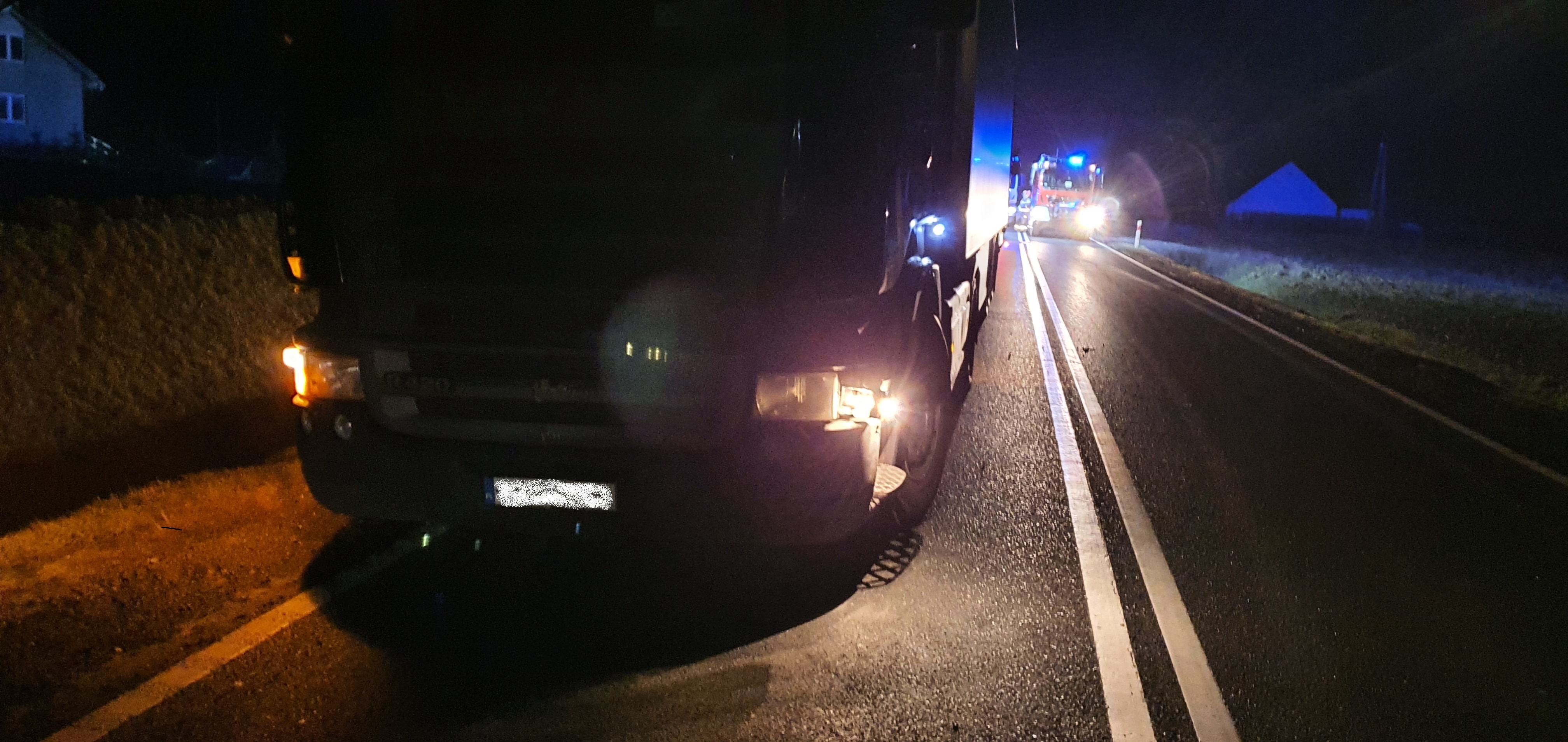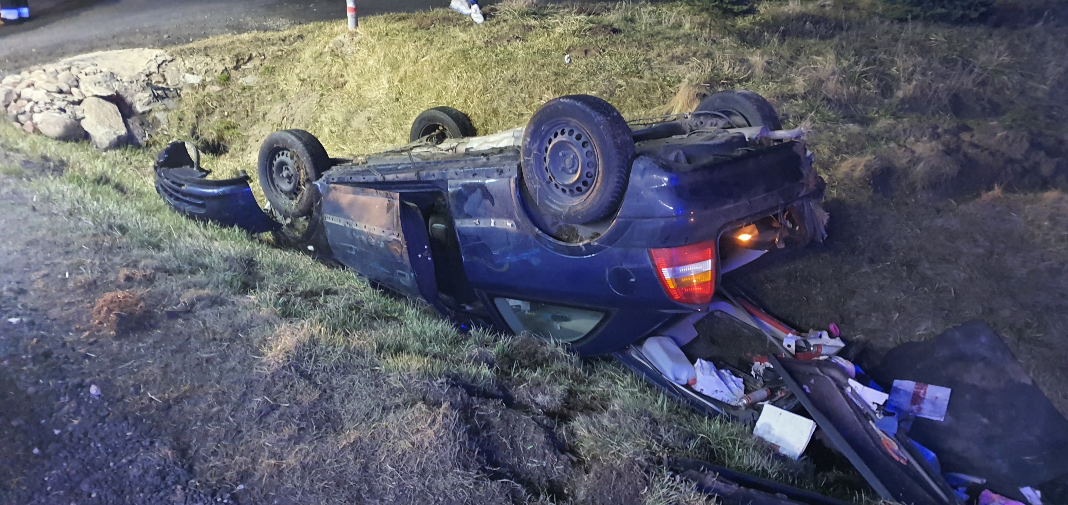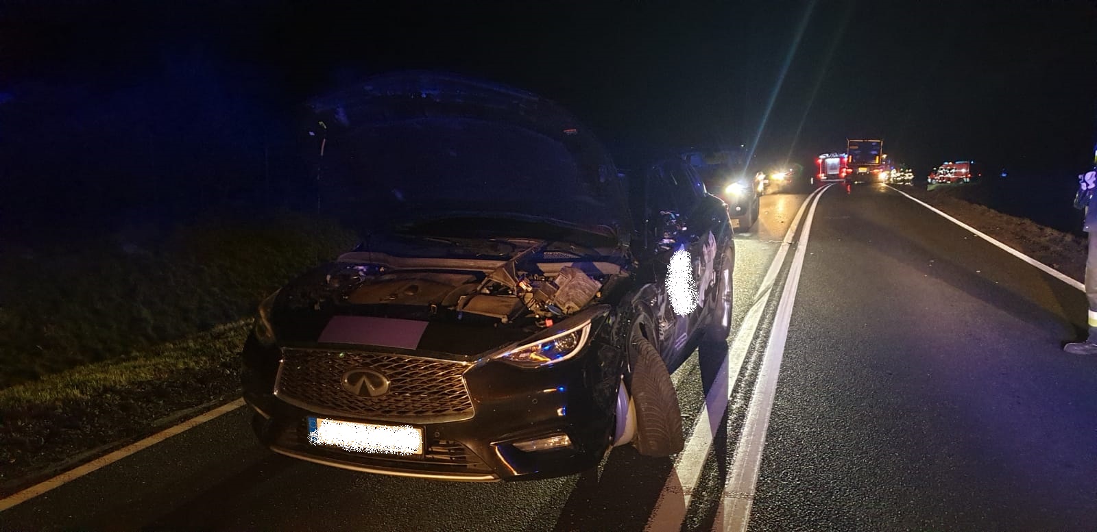 Po przybyciu na miejsce zdarzenia zastano w przydrożnym rowie samochód osobowy Opel po wcześniejszym zderzeniu, oraz samochód osobowy Infinity i samochód ciężarowy Scania. Osoby biorące udział w zdarzeniu opuściły pojazdy o własnych siłach.