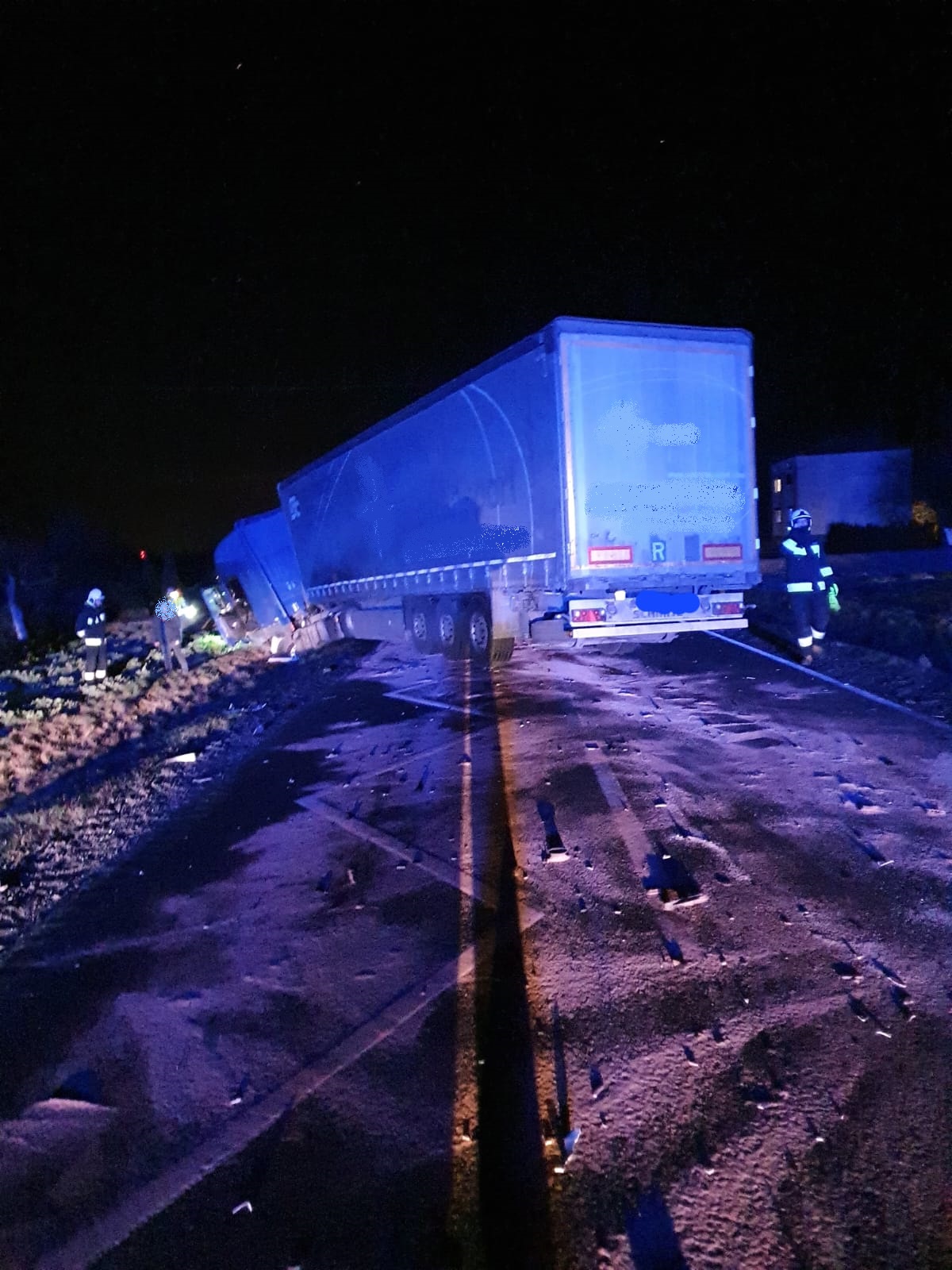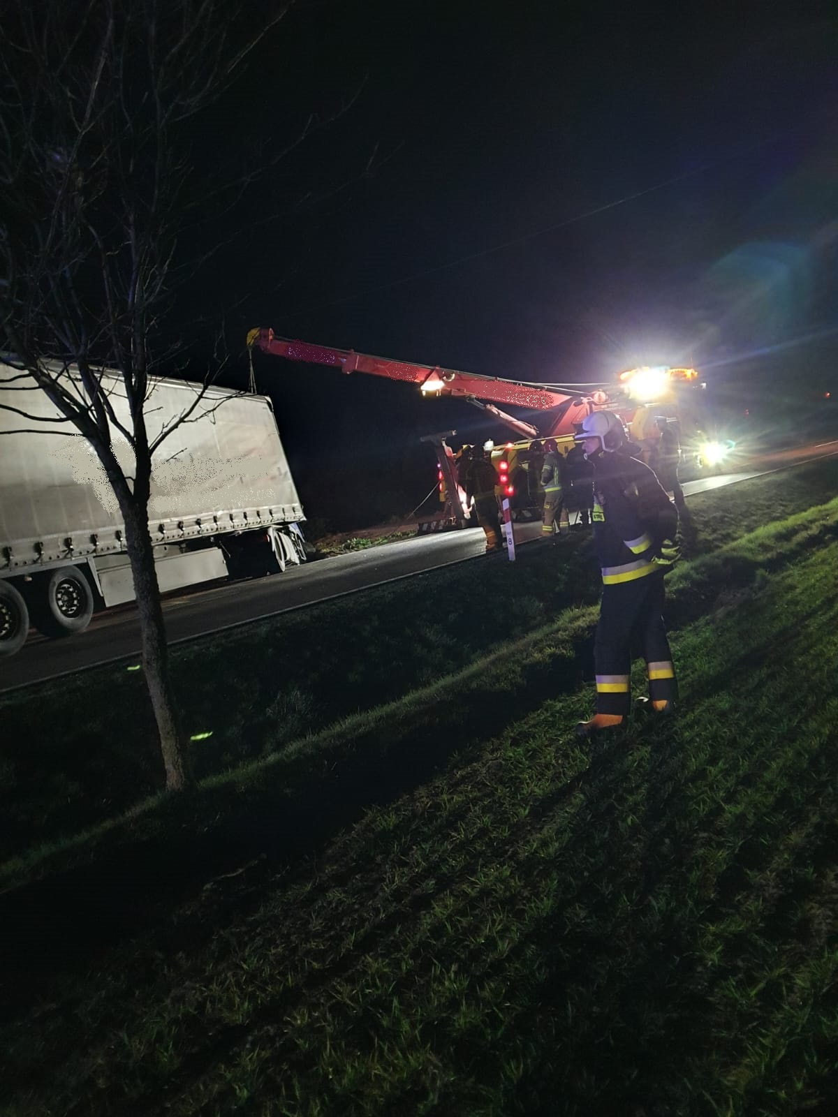 Działania zastępów polegały na udzieleniu kwalifikowanej pierwszej pomocy osobie poszkodowanej - wsparcie psychiczne, unieruchomienie odcinka szyjnego kręgosłupa poprzez założenie kołnierza ortopedycznego i przełożeniu tej osoby na nosze typu deska. Teren akcji oświetlono, następnie zamknięto zawór butli LPG w samochodzie Toyota RAV-4. Odłączono akumulatory w pojazdach biorących udział w zderzeniu. Poszkodowany został zabrany przez ZRM do szpitala w celu wykonania dokładnych badań. W samochodzie ciężarowym uszkodził się zbiornik paliwa w wyniku czego doszło do wycieku oleju napędowego w ilości około 1000l do przydrożnego rowu oraz częściowo na jezdnię. Paliwo z jezdni zostało usunięte przy użyciu sorbentu, a o wycieku paliwa do rowu poinformowano zarządzanie kryzysowe oraz zarządcę drogi. W dniu 04.04.2022 r. w godzinach porannych skażona ziemia będzie poddana rekultywacji przy wykorzystaniu ciężkiego sprzętu. Przy użyciu mioteł usunięto pozostałości pokolizyjne z jezdni. Samochód ciężarowy z naczepą został usunięty z drogi przez pomoc drogową. Na czas prowadzenia działań DK-15 była całkowicie zamknięta przez policję. Strażacy pomagali kierować ruchem na wyznaczone przez policję objazdy.