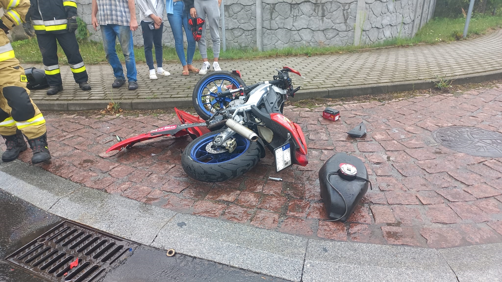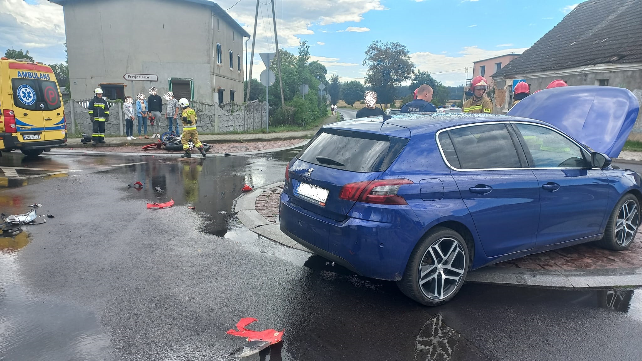 Po przybyciu na miejsce zdarzenia zastano samochód osobowy z rozbitym tylnym lewym błotnikiem na środku ronda oraz rozbity motocykl na poboczu drogi. Motocyklem podróżowały dwie nieletnie osoby. Znajdowały się na pobliskim chodniku. Dziewczyna uskarżała się na ból biodra, chłopak bez obrażeń. Samochodem osobowym podróżowała jedna osoba, znajdowała się poza pojazdem, bez obrażeń.