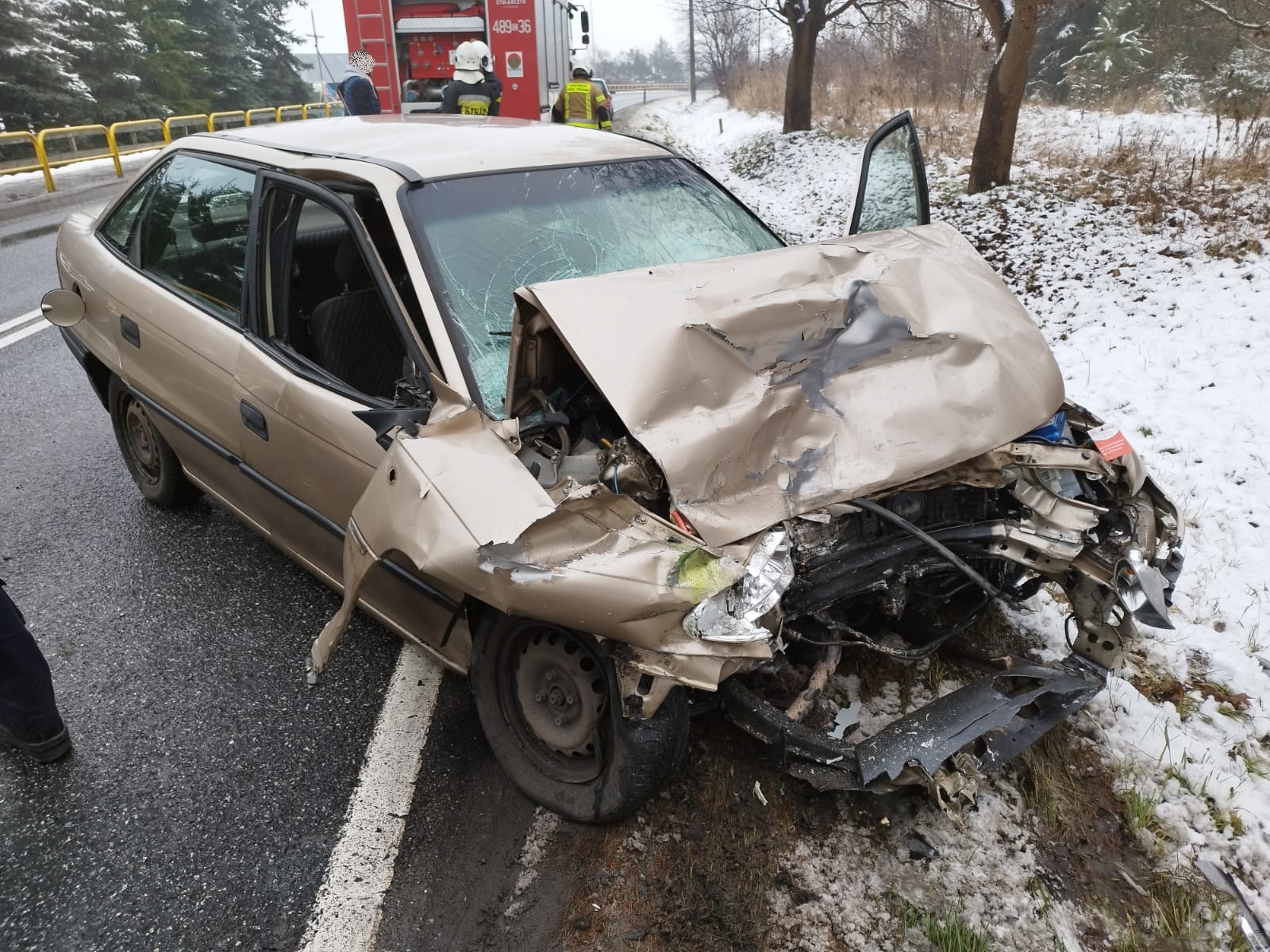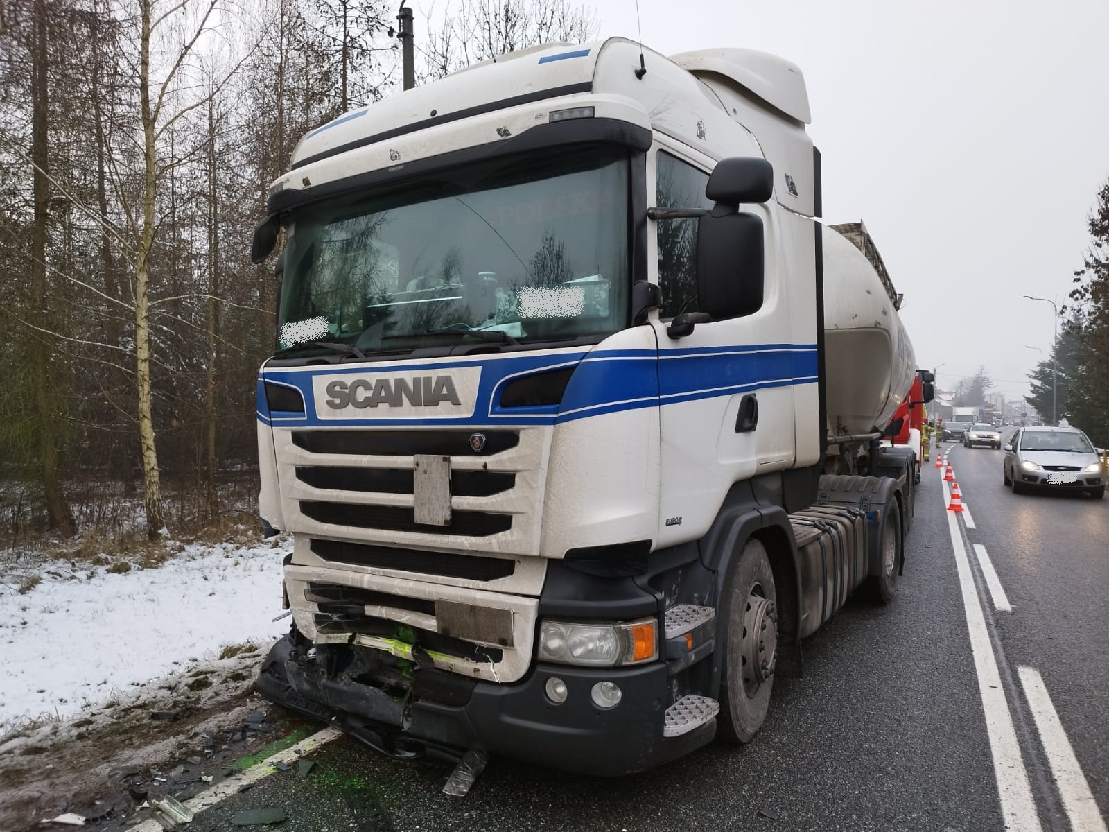 Po przybyciu na miejsce zdarzenia zastano dwa pojazdy po wcześniejszym zderzeniu. Pojazd ciężarowy Scania blokował jeden pas DK25, drugi z pojazdów Opel Astra stał częściowo na poboczu DK25. Samochodem ciężarowym podróżował tylko kierowca, który znajdował się poza pojazdem - bez żadnych obrażeń. Drugim pojazdem podróżowała jedna osoba (kobieta), która znajdowała się obok samochodu osobowego siedząc w przydrożnym rowie i uskarżała się na ból klatki piersiowej.