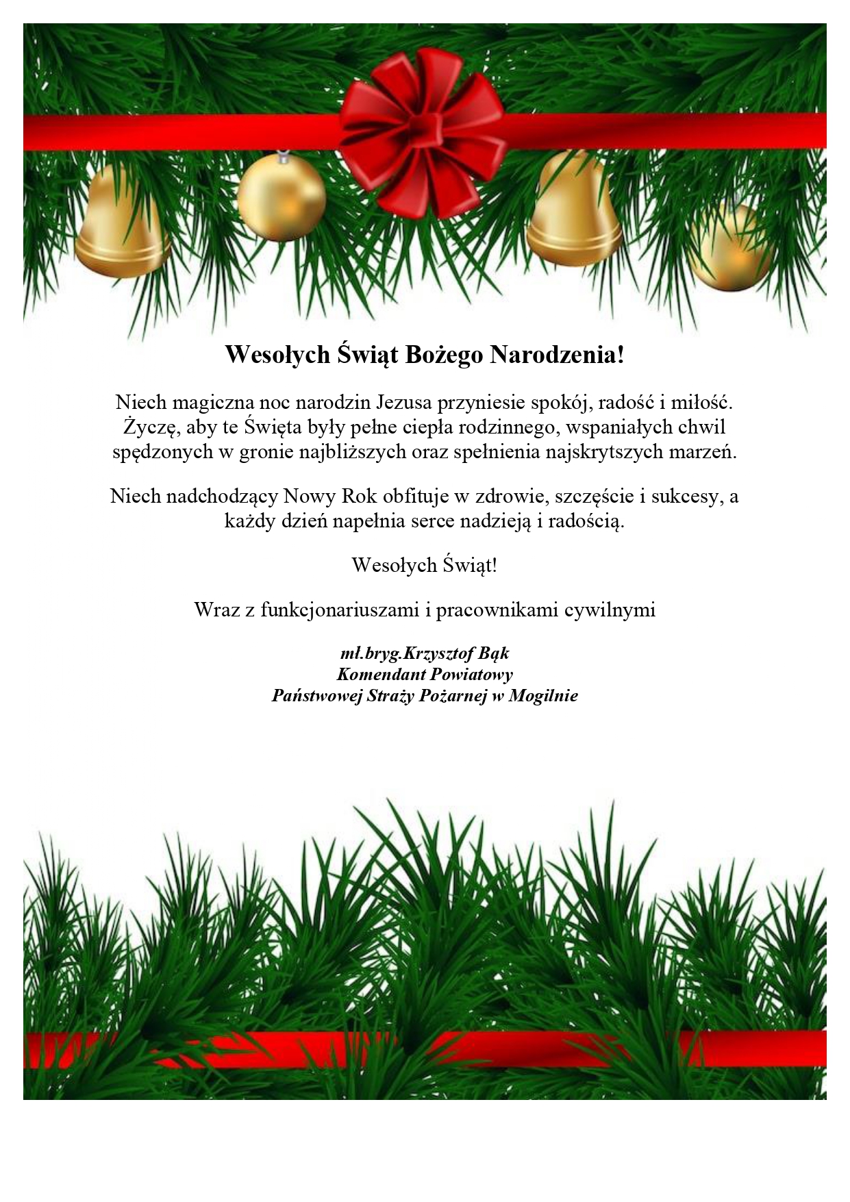 Życzenia Bożonarodzeniowe Komendanta Powiatowego PSP w Mogilnie