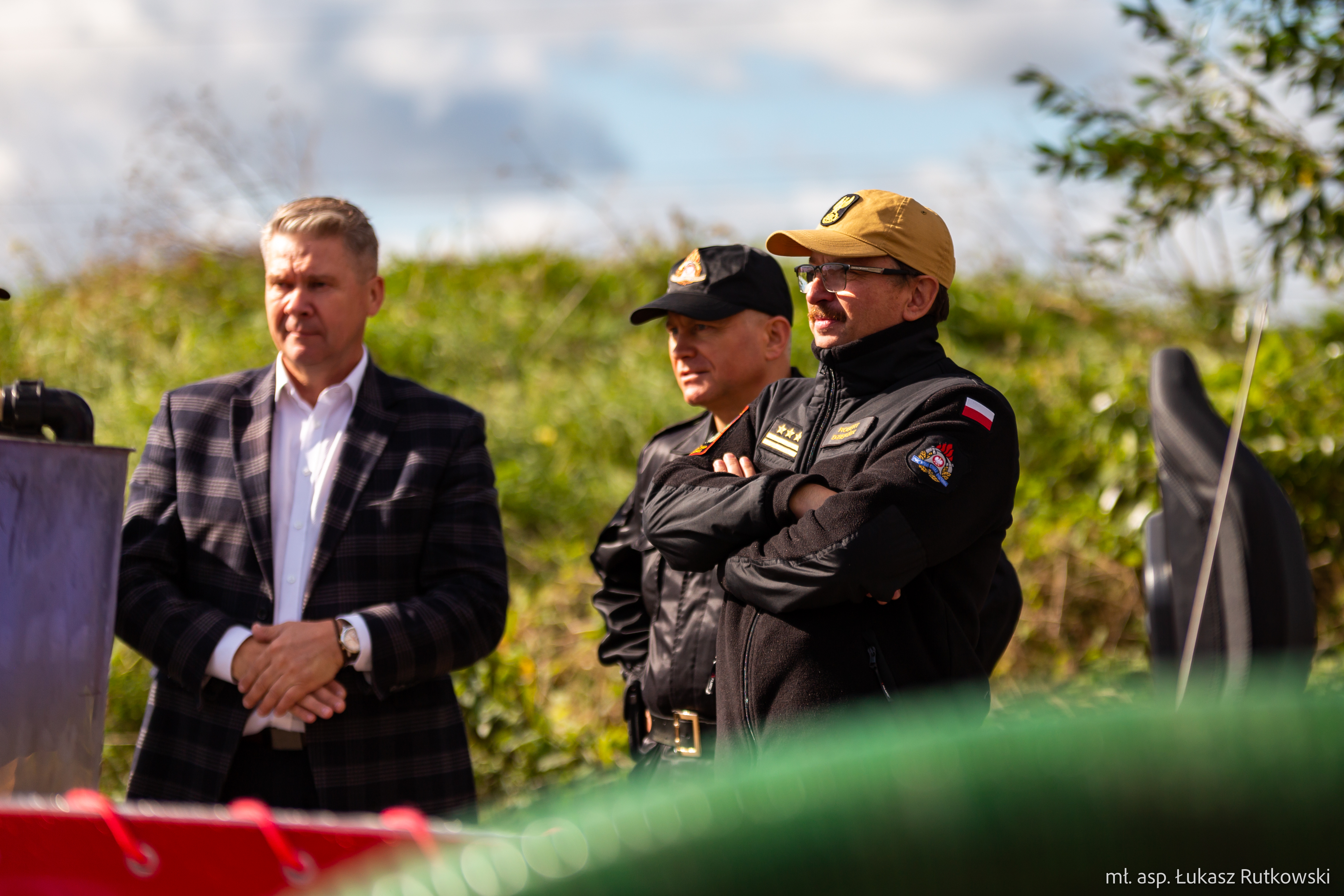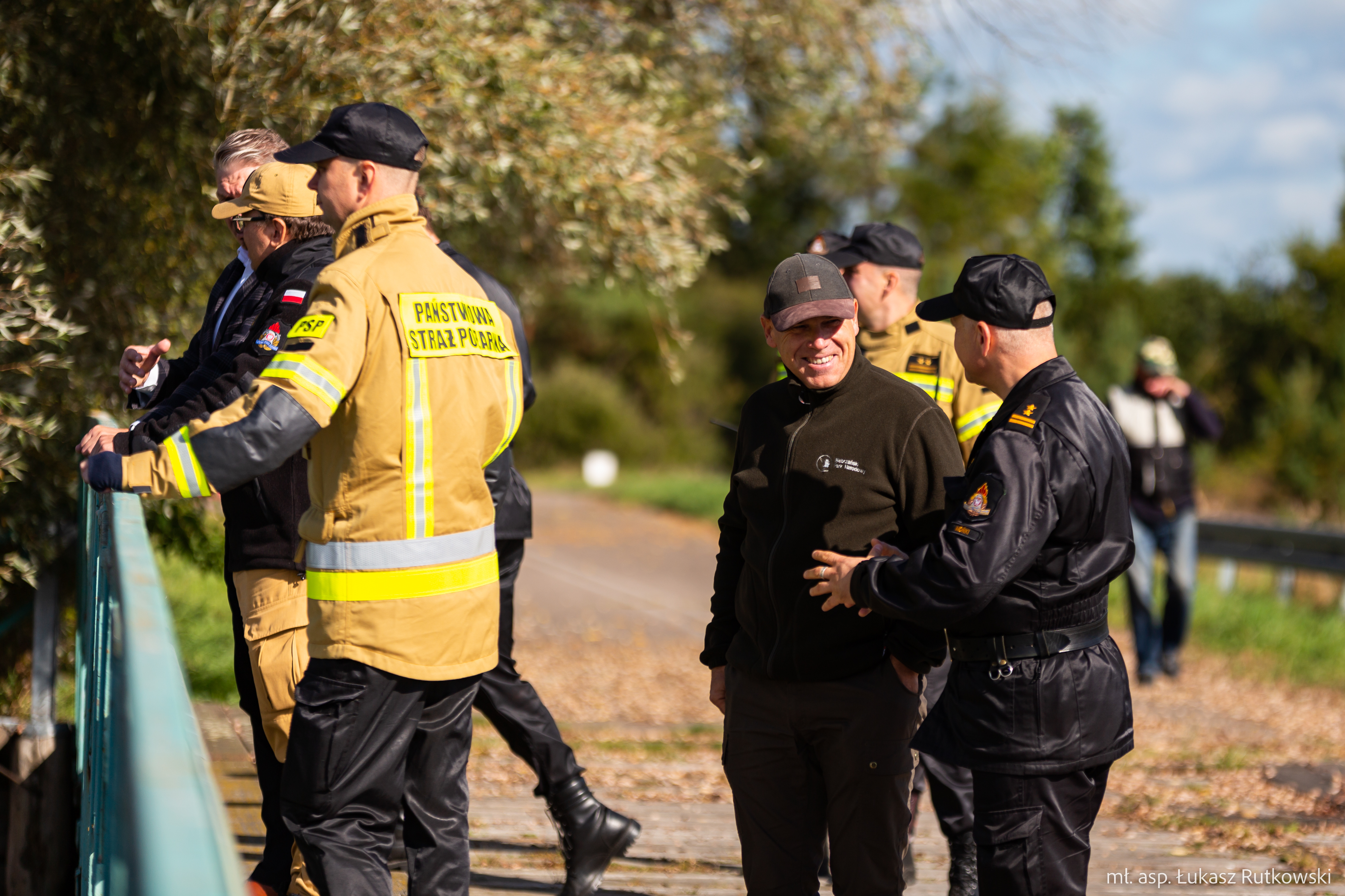st. bryg. Robert Dzierżek wraz z oficerami Wydziału Operacyjnego KW PSP, Komendant Powiatowy PSP w Mońkach bryg. Dariusz Koc, Komendant Powiatowy PSP w Grajewie mł. bryg. Andrzej Beczko, Dyrektor Biebrzańskiego Parku Narodowego Pan Artur Wiatr oraz Burmistrz Goniądza