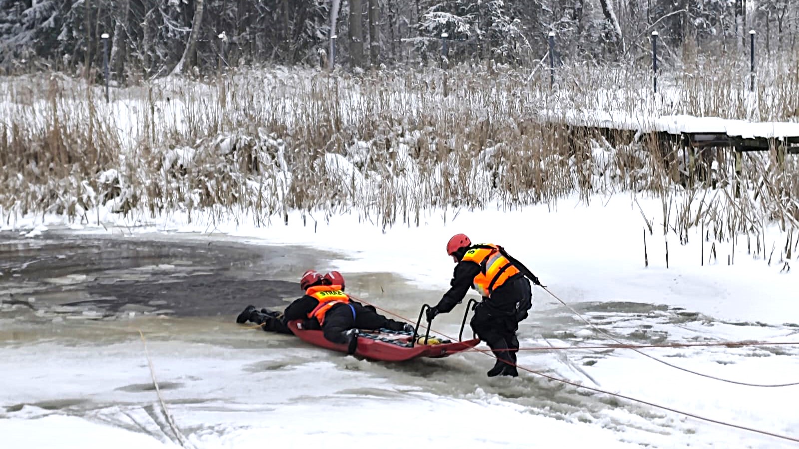 - sposoby ewakuacji osób poszkodowanych z wykorzystaniem specjalistycznego sprzętu, m.in. sań lodowych, rzutek ratowniczych oraz drabin.
