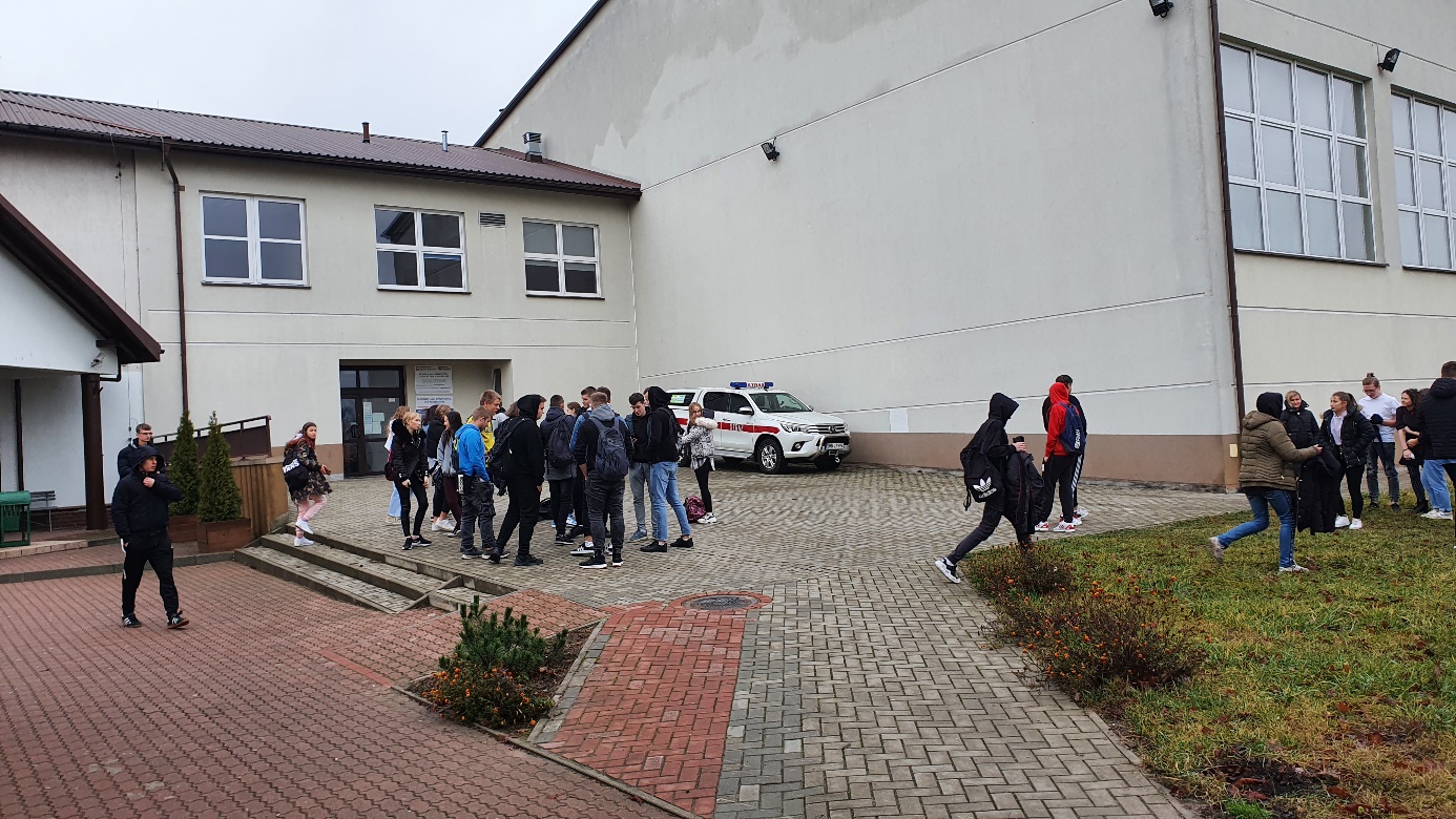 w sali edukacyjnej w jednym z budynków szkoły. Celem ćwiczeń i ewakuacji było praktyczne sprawdzenie obowiązujących procedur dotyczących sposobów zachowania się w przypadku wybuchu pożaru lub powstania innego zagrożenia dla życia i zdrowia w placówce oświatowej oraz możliwości organizacji sprawnego opuszczenia obiektu. Po zakończeniu i podsumowaniu ewakuacji zapoznano pracowników szkoły oraz uczniów z procedurami dotyczącymi zachowania
